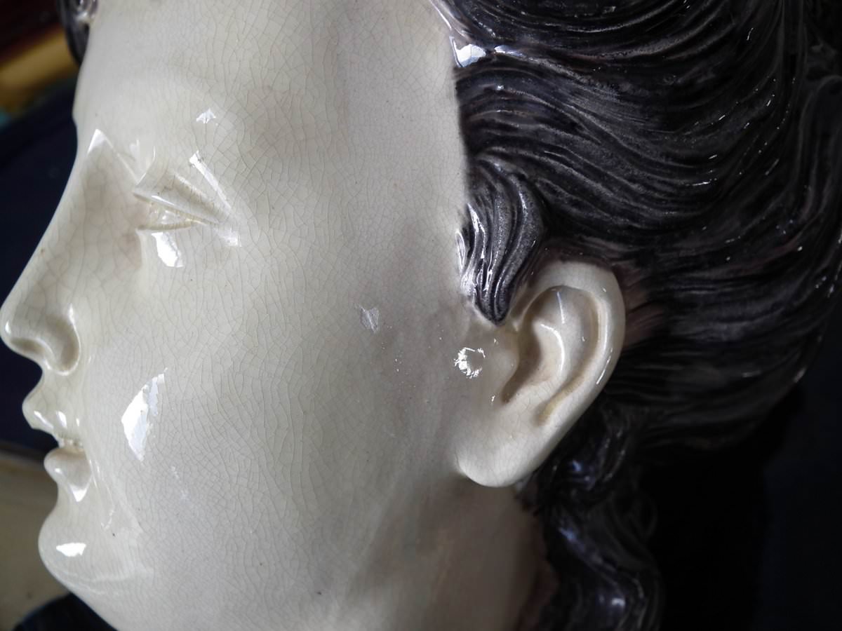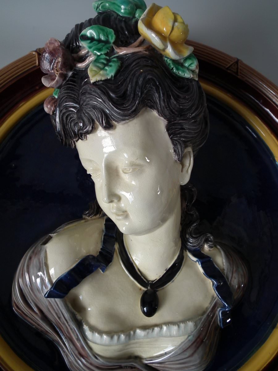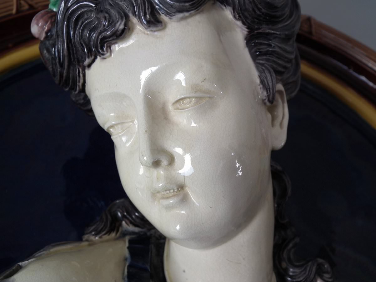 Circa 1880. 18.1ins high, 18.1ins wide, 6.7ins depth. Schiller Majolica wall plaque which features the head and shoulders of a lady, molded in deep relief.