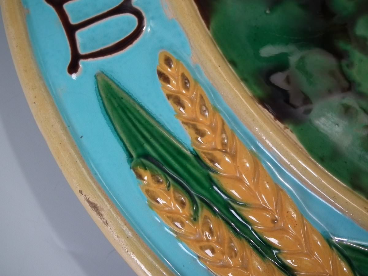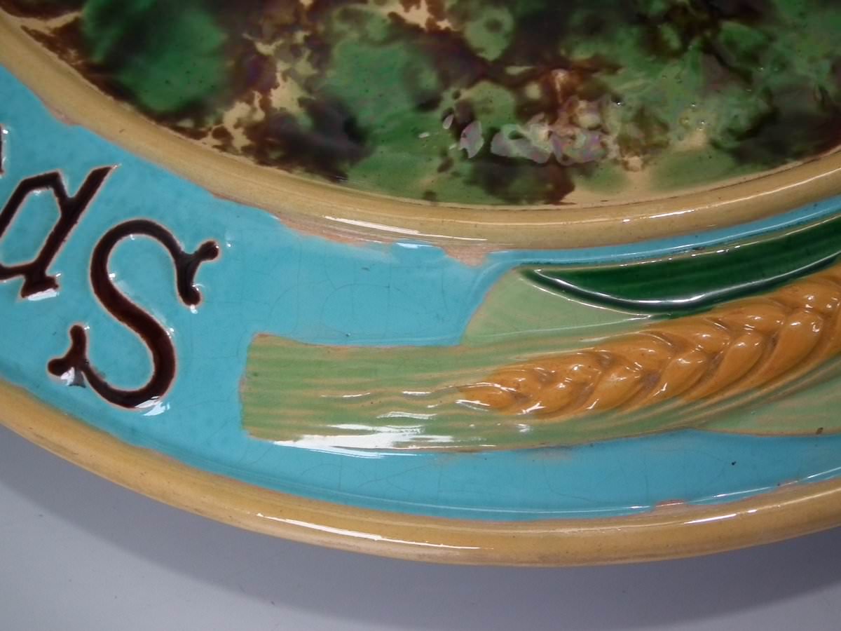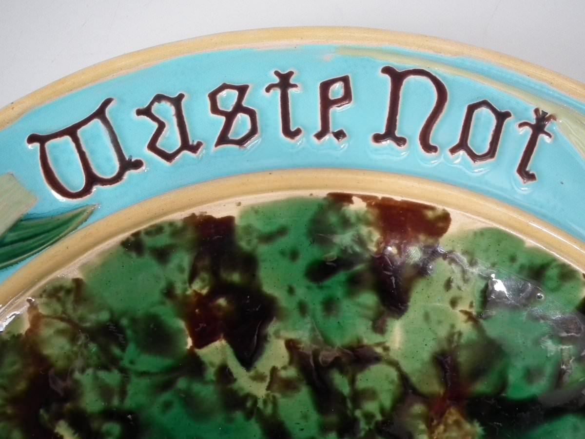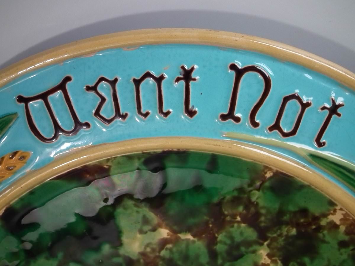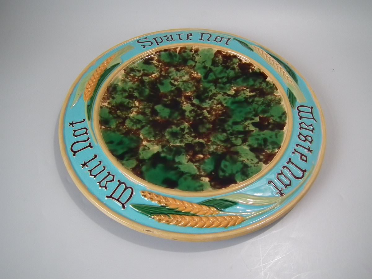 Victorian, circa 1870. 1.2ins high, 15ins wide, 15ins depth. Minton Majolica platter which features wheat ears and the inscriptions 'Waste not', 'Want not' and 'Spare not' to the rim.