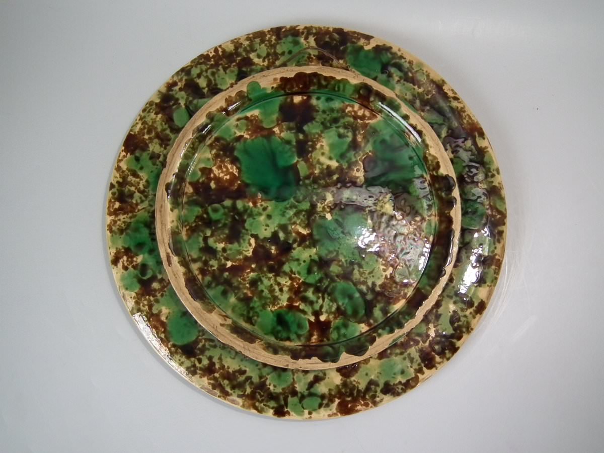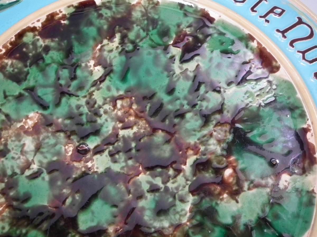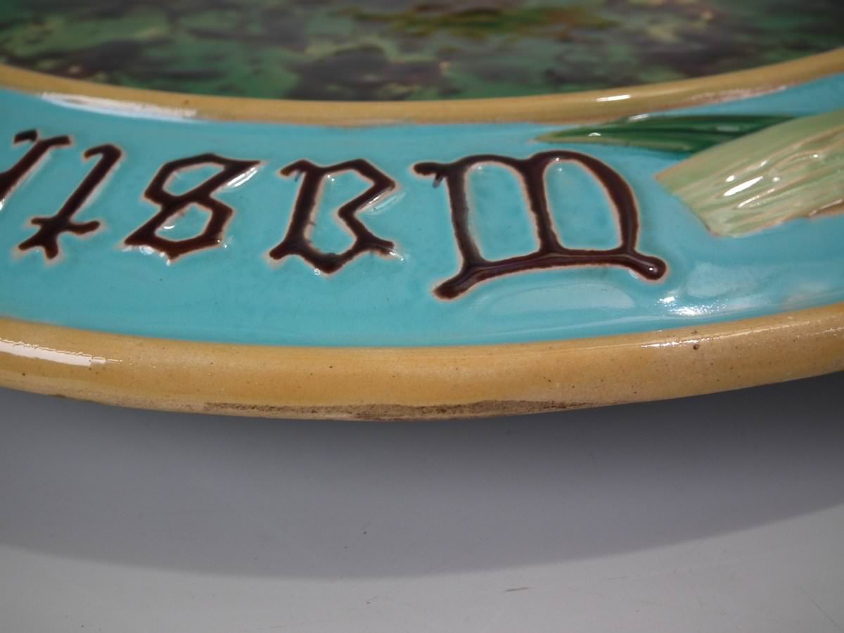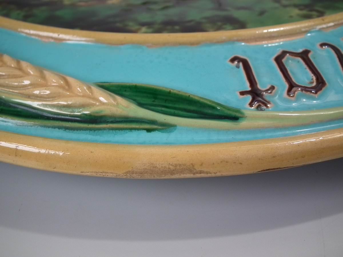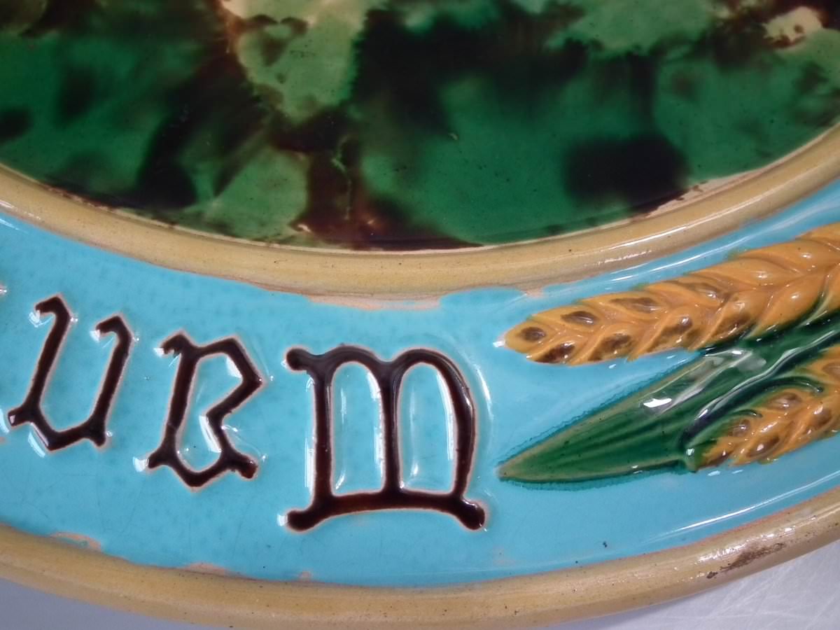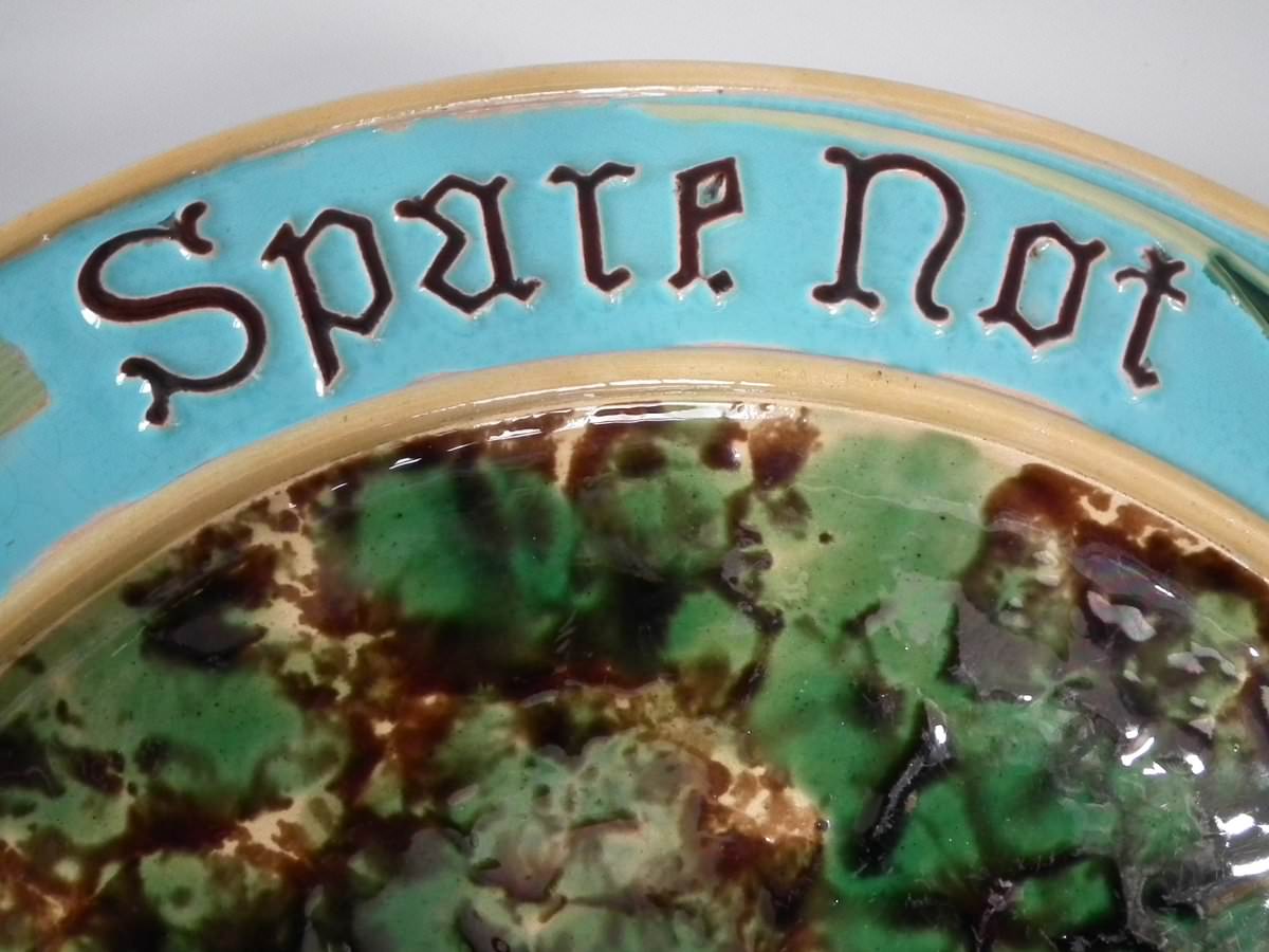 Victorian, circa 1870. 1.2ins high, 15ins wide, 15ins depth. Minton Majolica platter which features wheat ears and the inscriptions 'Waste not', 'Want not' and 'Spare not' to the rim.