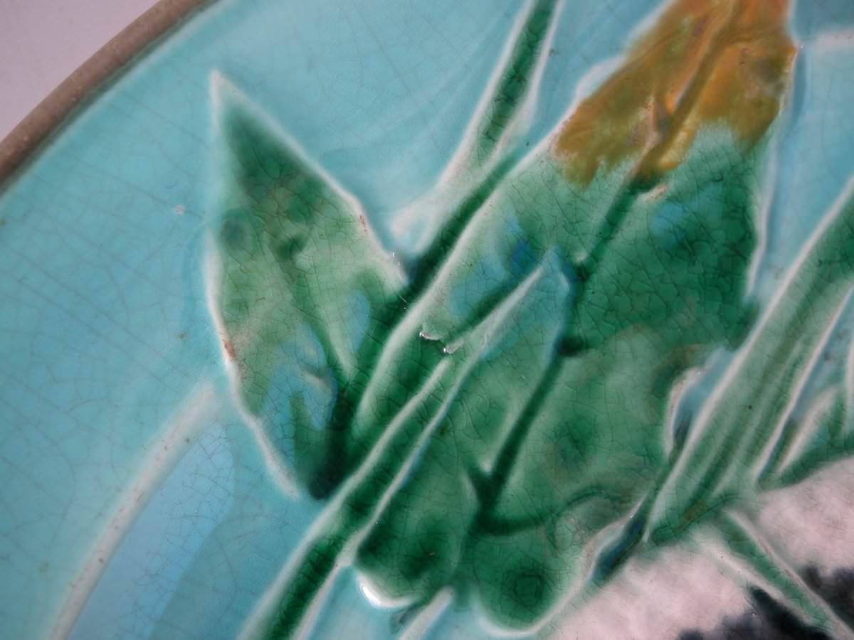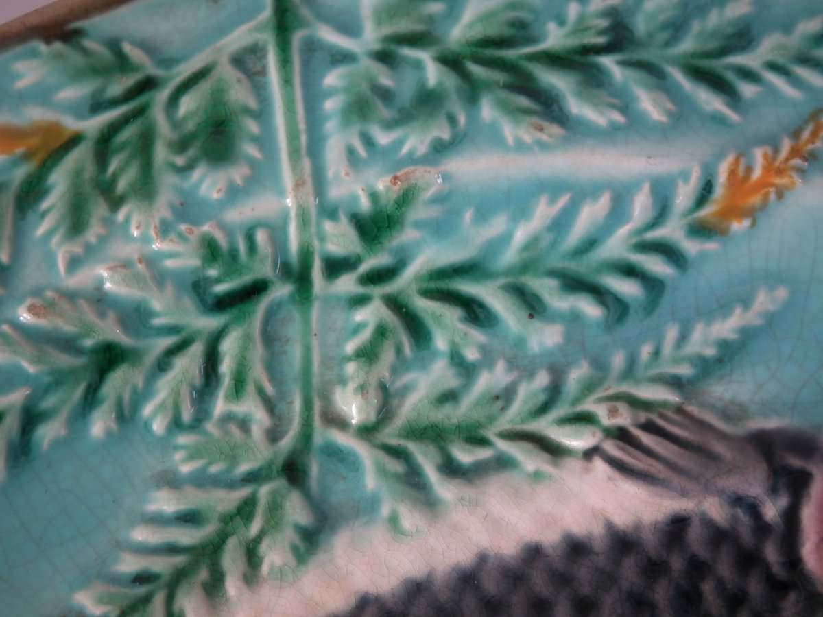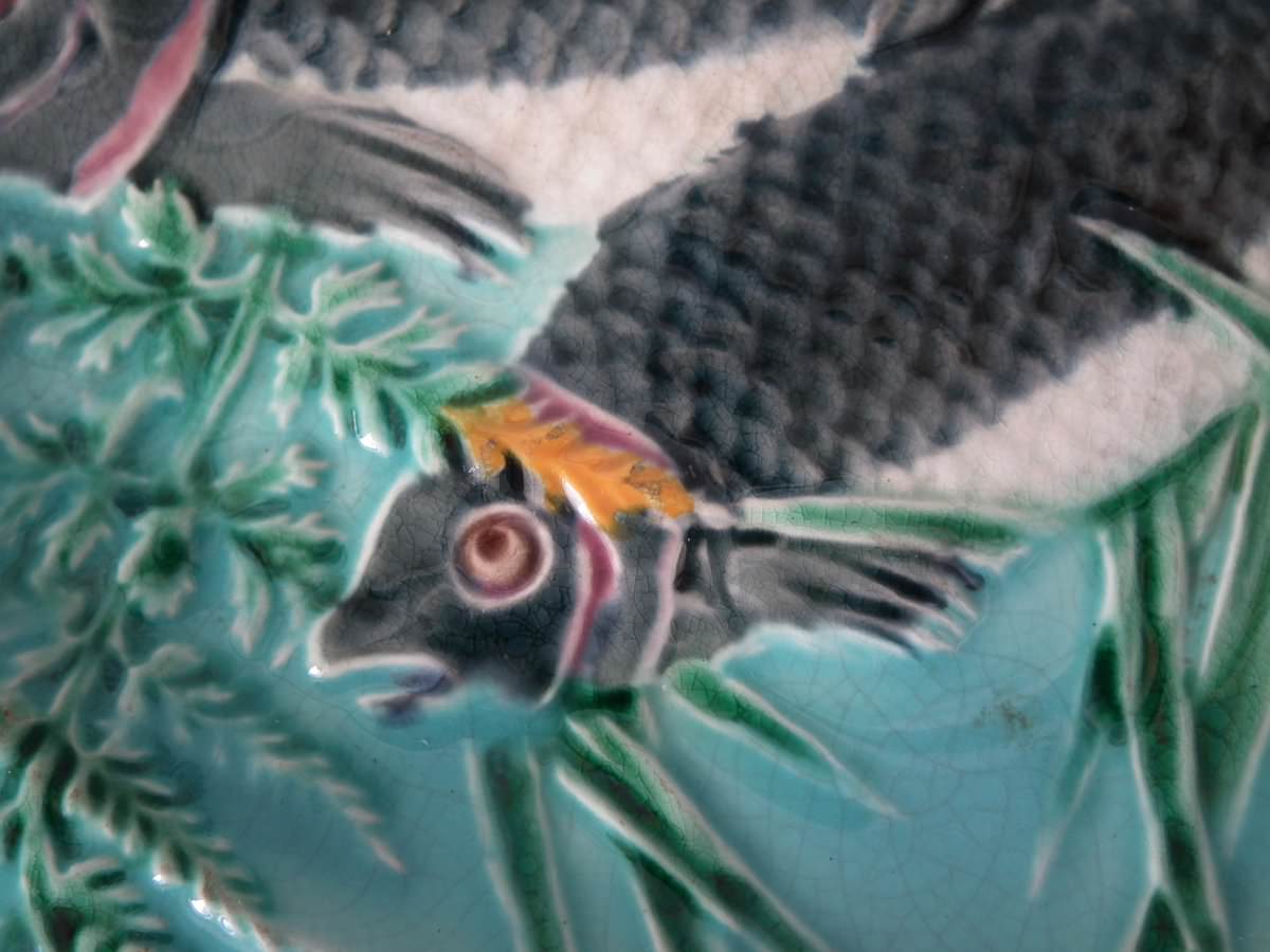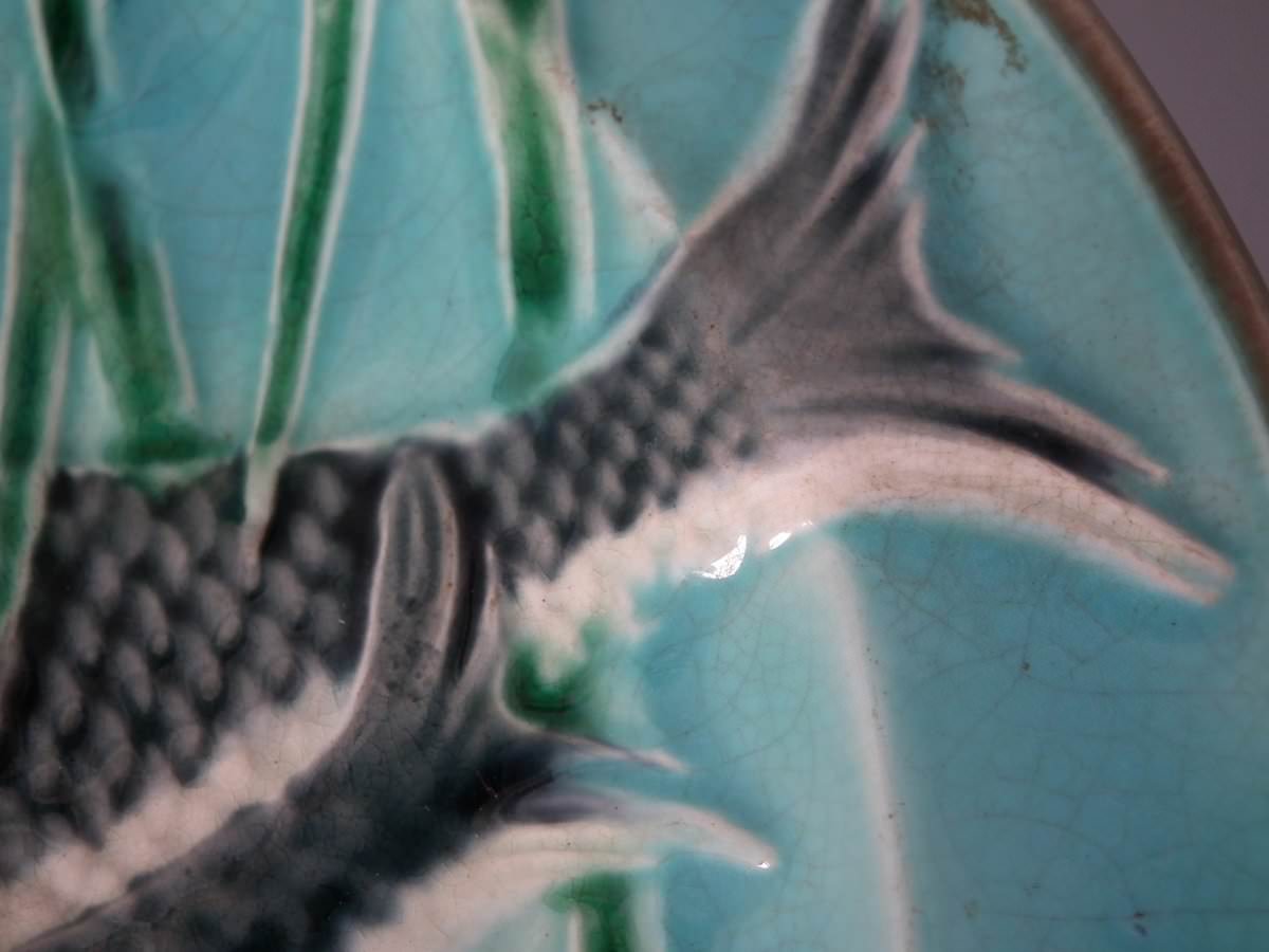 Victorian, circa 1875. 0.8ins high, 9.1ins wide, 9.1ins depth. Wedgwood Majolica plate which features fish on fern fronds and reeds. Turquoise ground version.