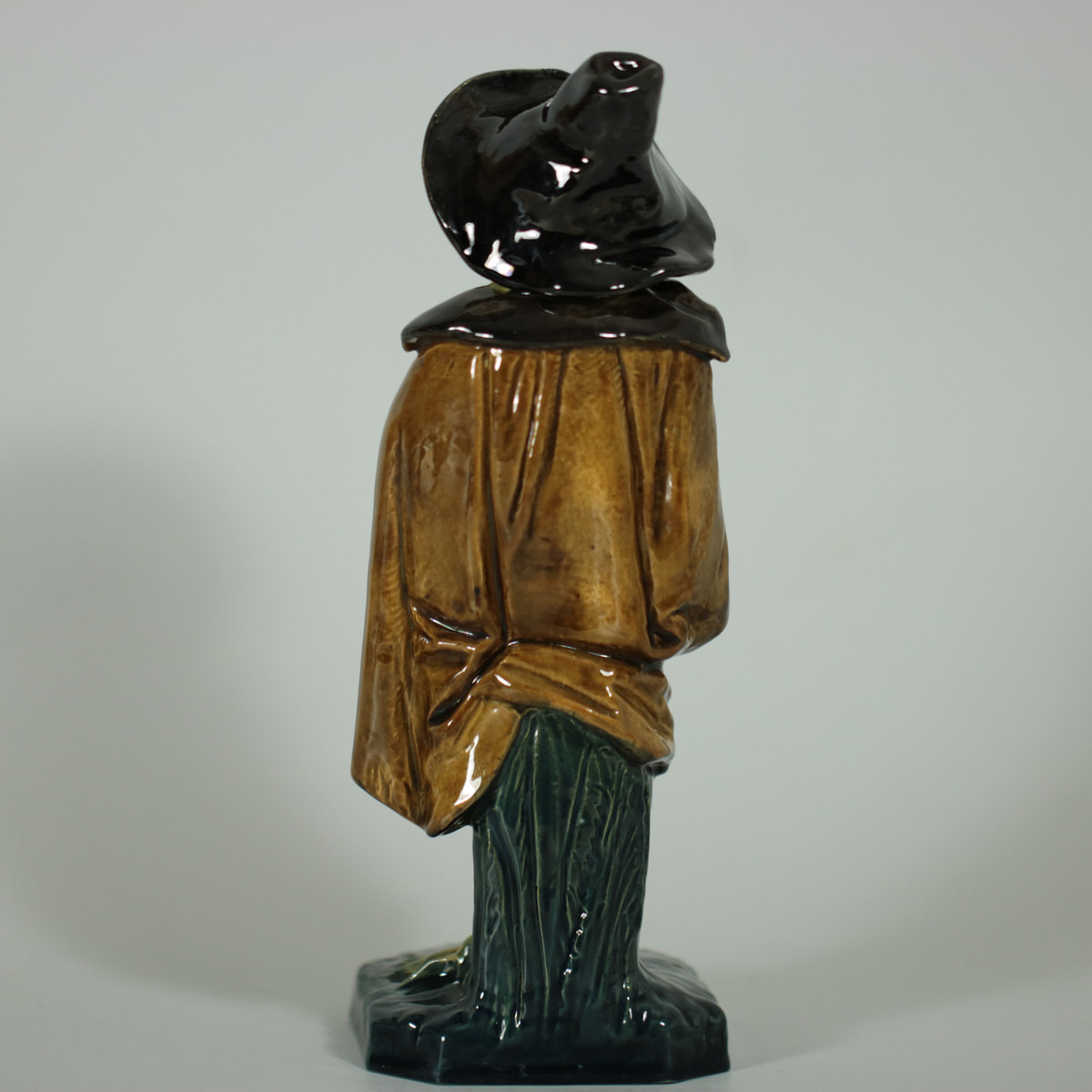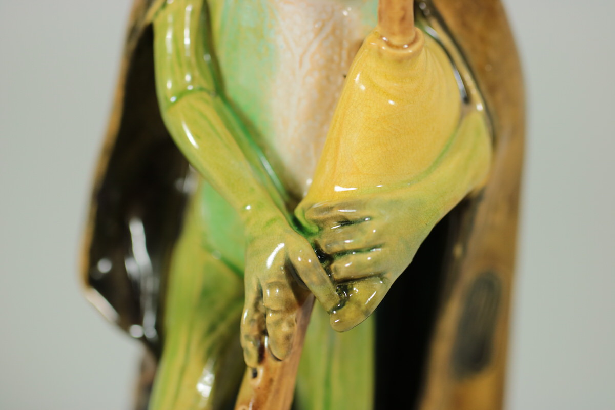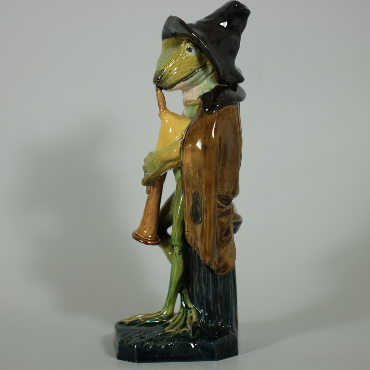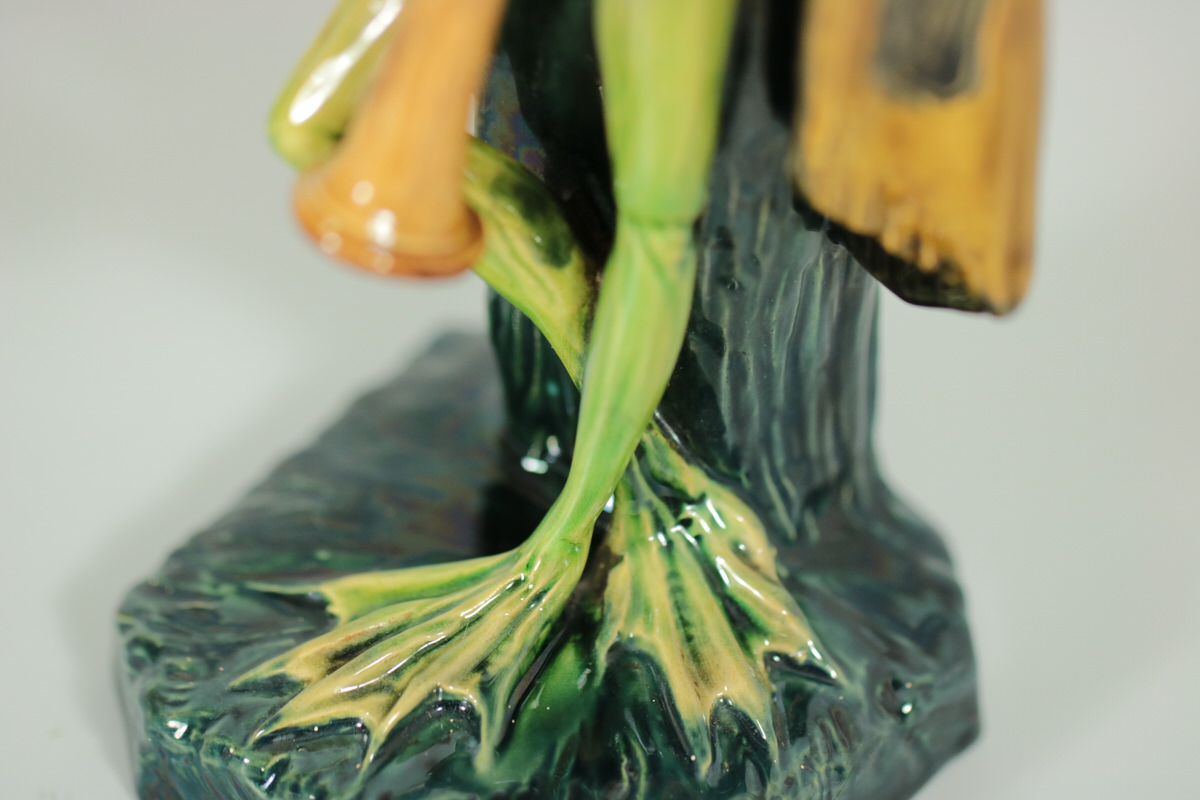 Circa 1880. 7.9ins high, 2.8ins wide, 3ins depth. Schiller Majolica figure which features a frog playing bagpipes, dressed in a cloak and a hat.