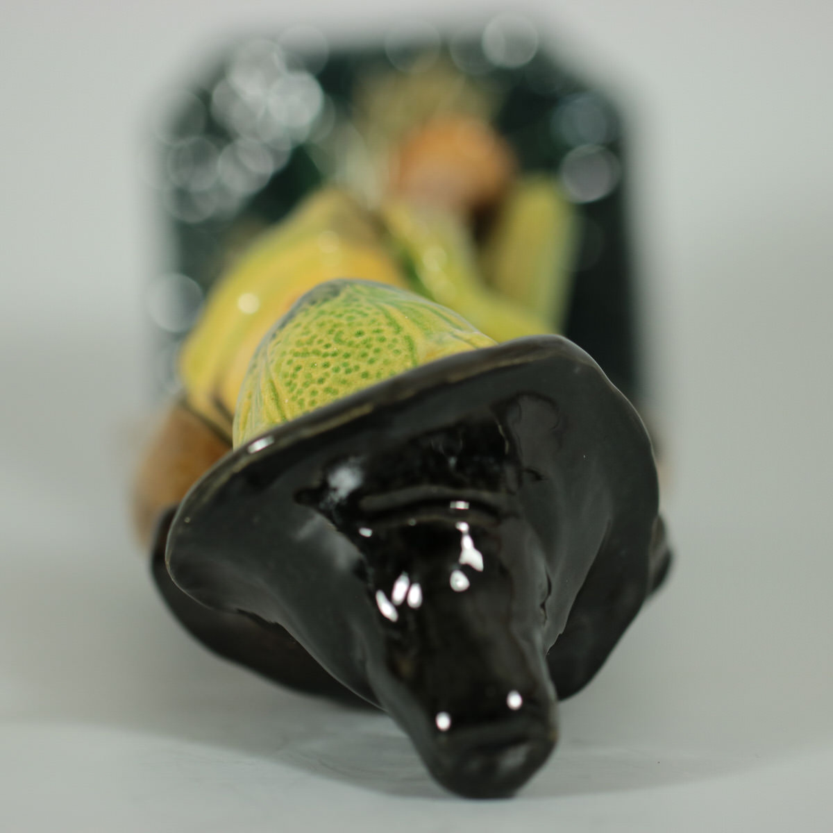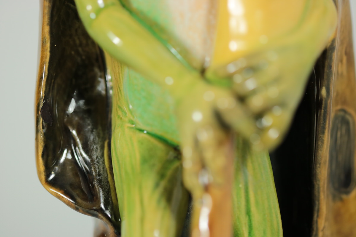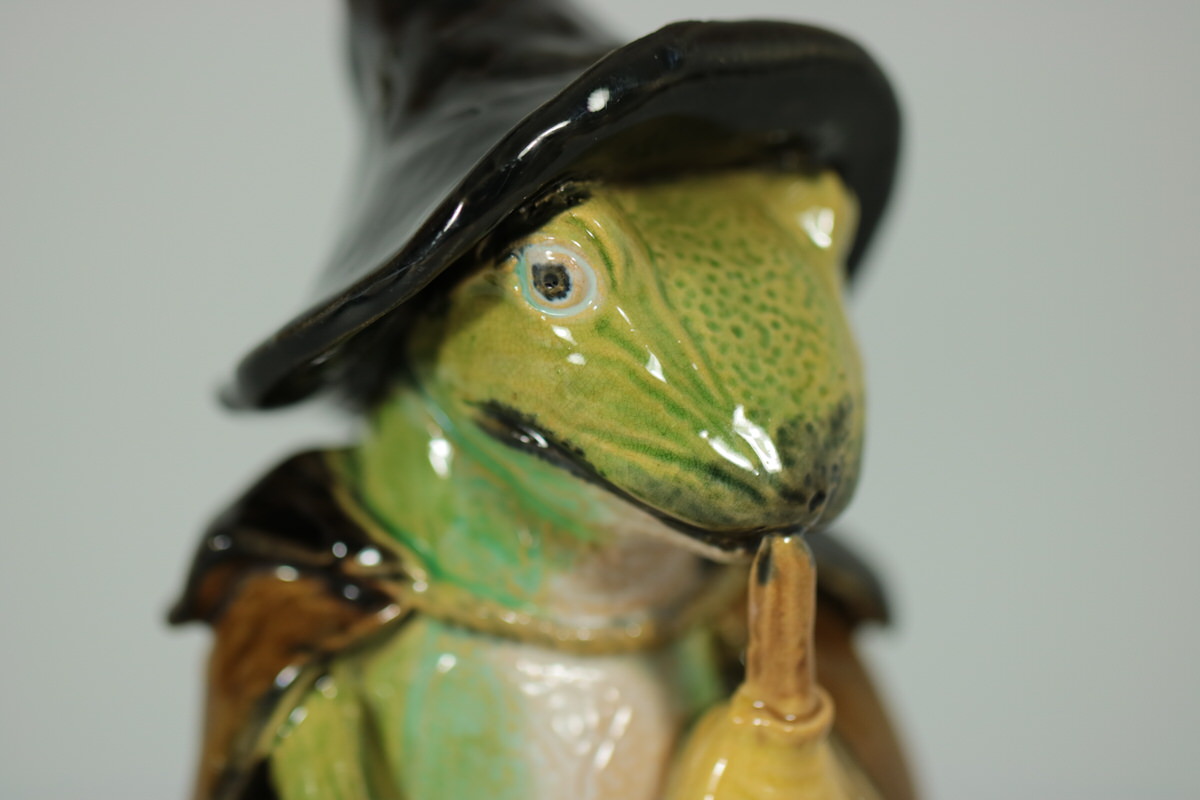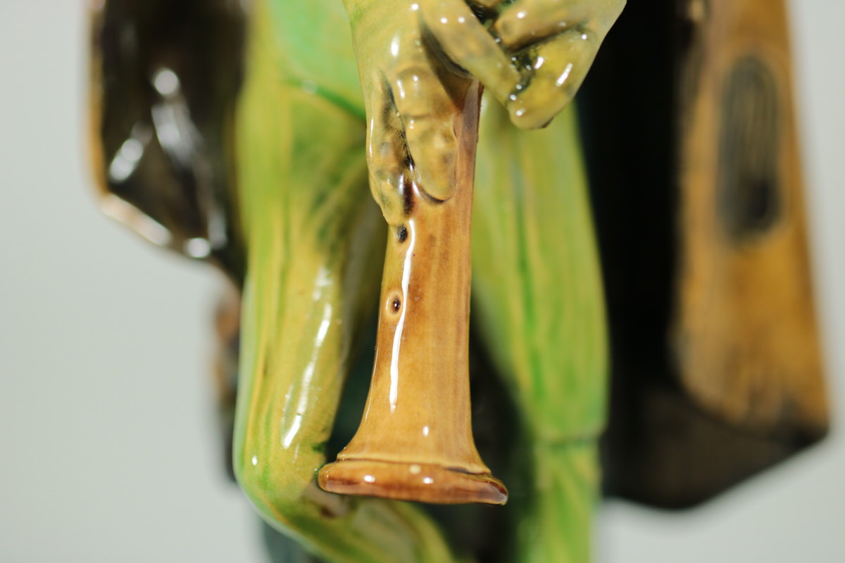 Circa 1880. 7.9ins high, 2.8ins wide, 3ins depth. Schiller Majolica figure which features a frog playing bagpipes, dressed in a cloak and a hat.