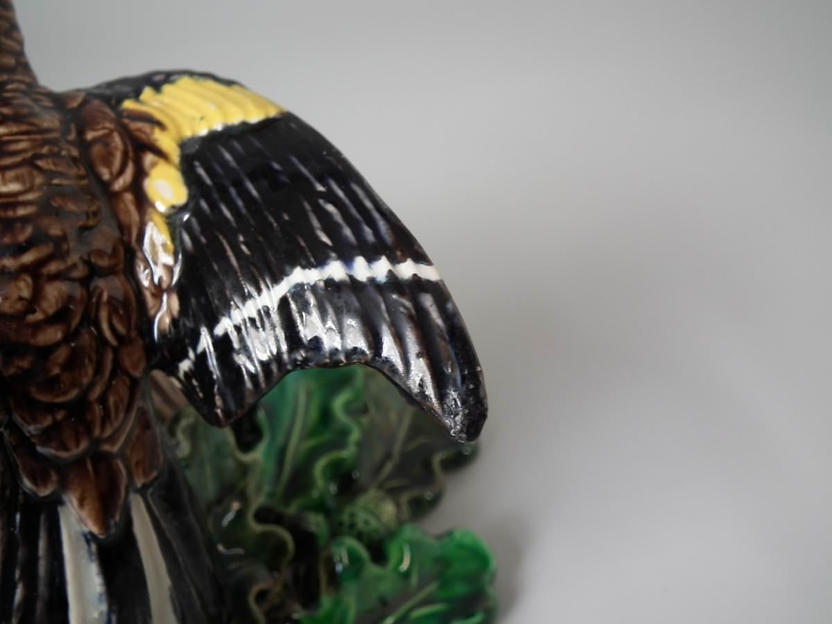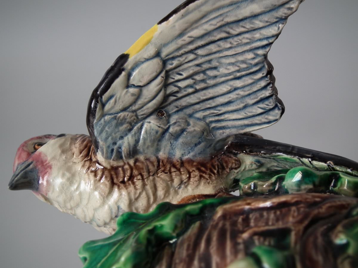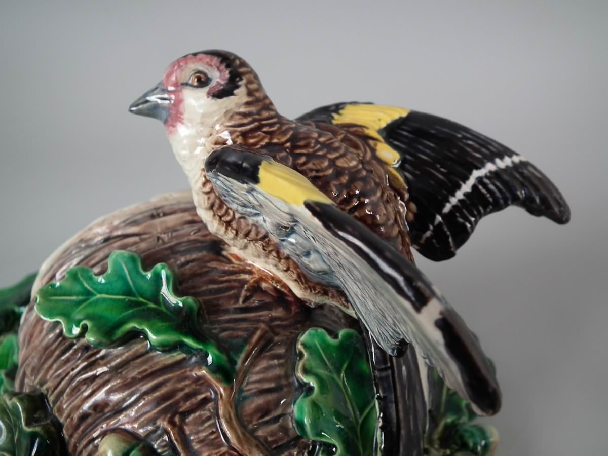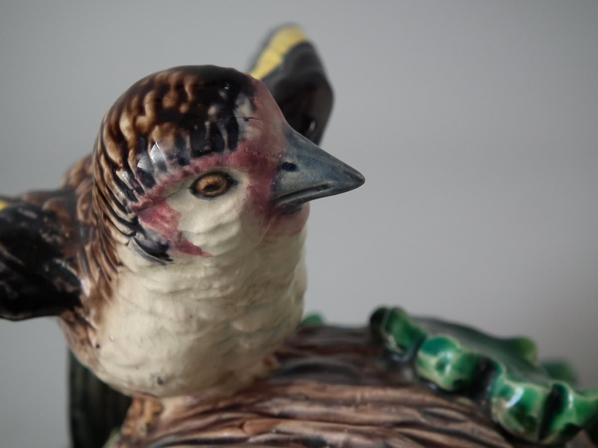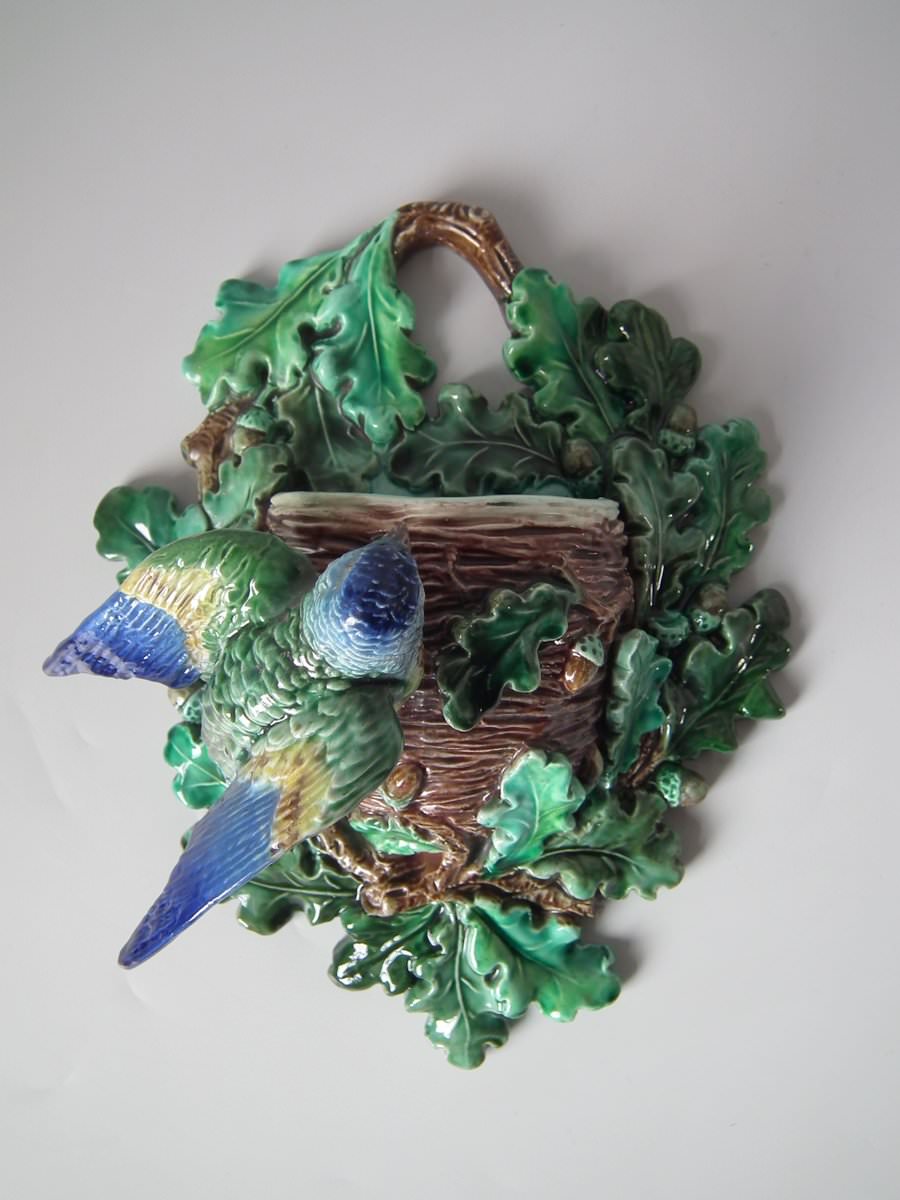 Victorian, circa 1880. 9.4ins high, 7.9ins wide, 4.7ins depth. Lonitz Majolica wall pocket which features a goldfinch on one side and another finch on the other, attending their nests, surrounded by oak leaves and acorns.