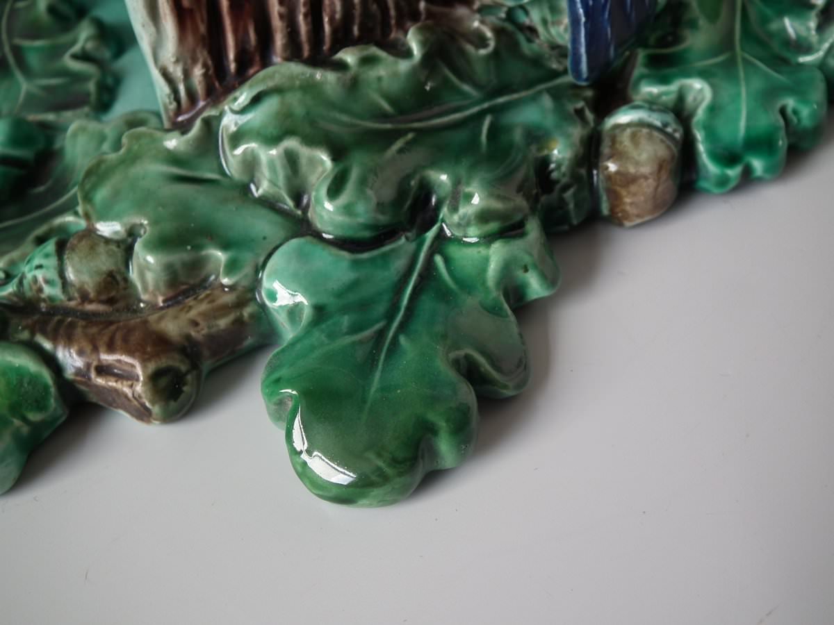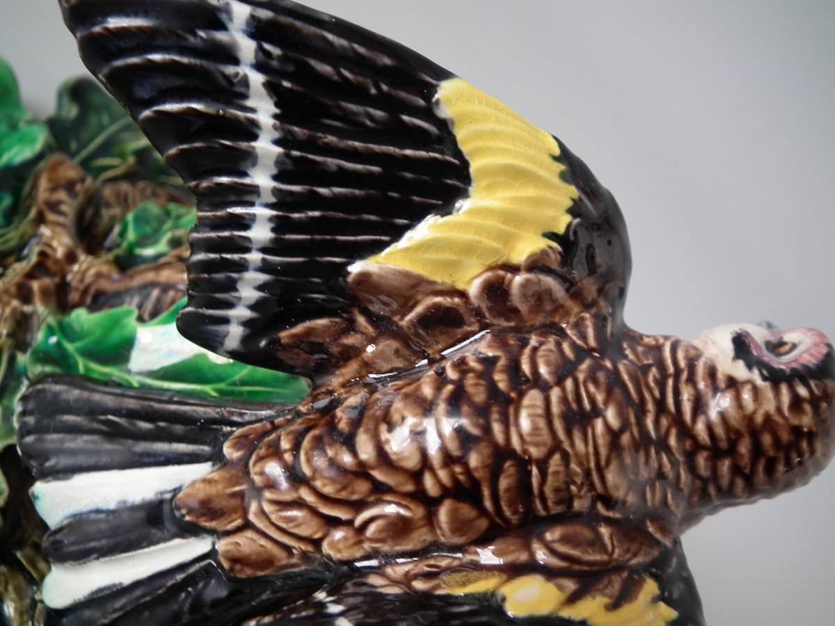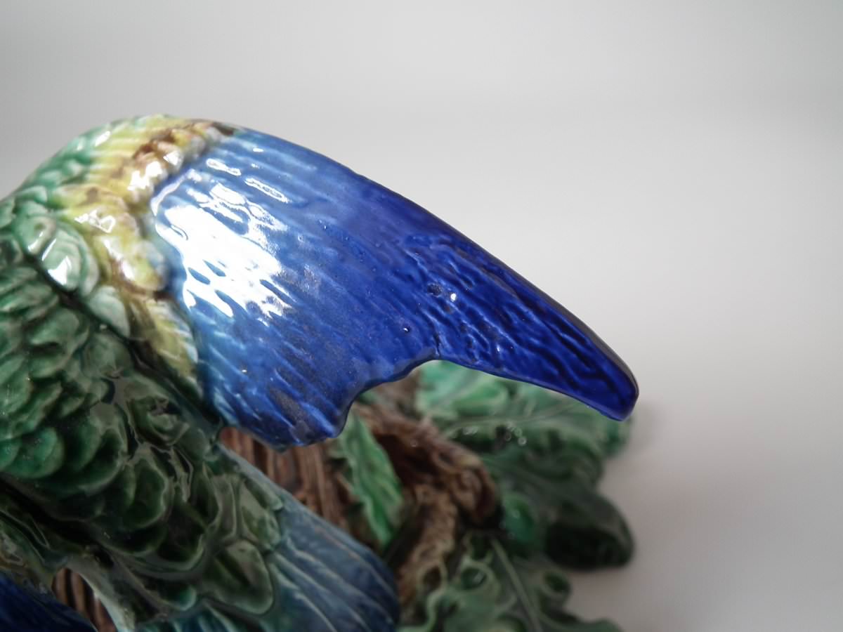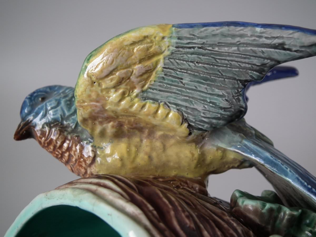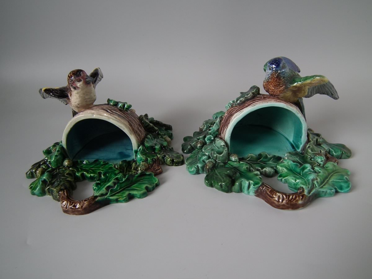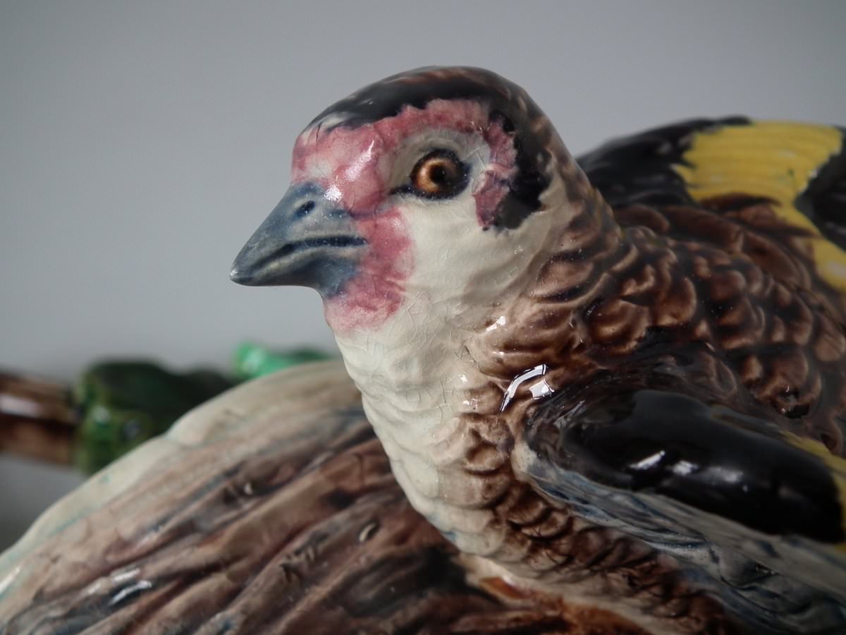 Victorian, circa 1880. 9.4ins high, 7.9ins wide, 4.7ins depth. Lonitz Majolica wall pocket which features a goldfinch on one side and another finch on the other, attending their nests, surrounded by oak leaves and acorns.