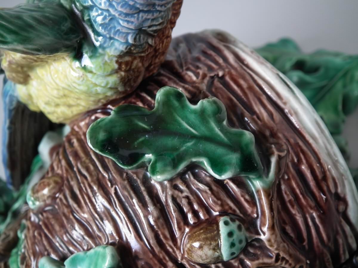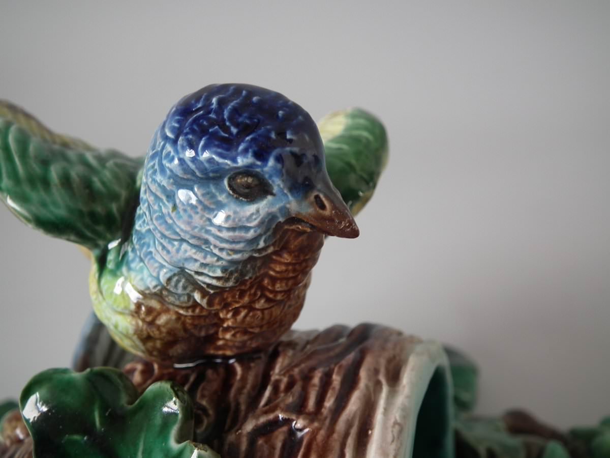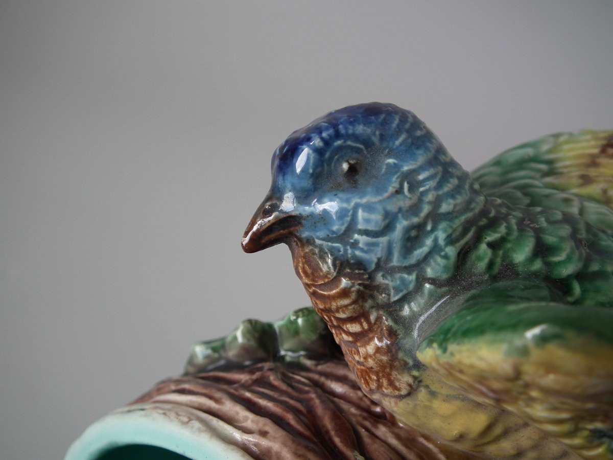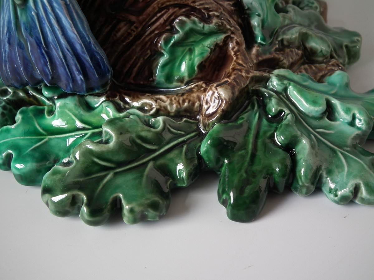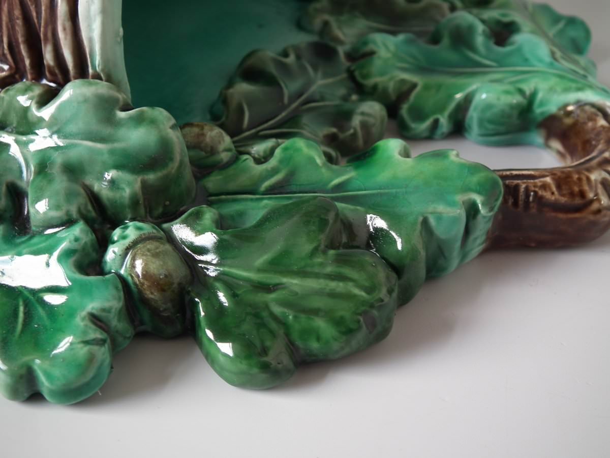 Victorian, circa 1880. 9.4ins high, 7.9ins wide, 4.7ins depth. Lonitz Majolica wall pocket which features a goldfinch on one side and another finch on the other, attending their nests, surrounded by oak leaves and acorns.