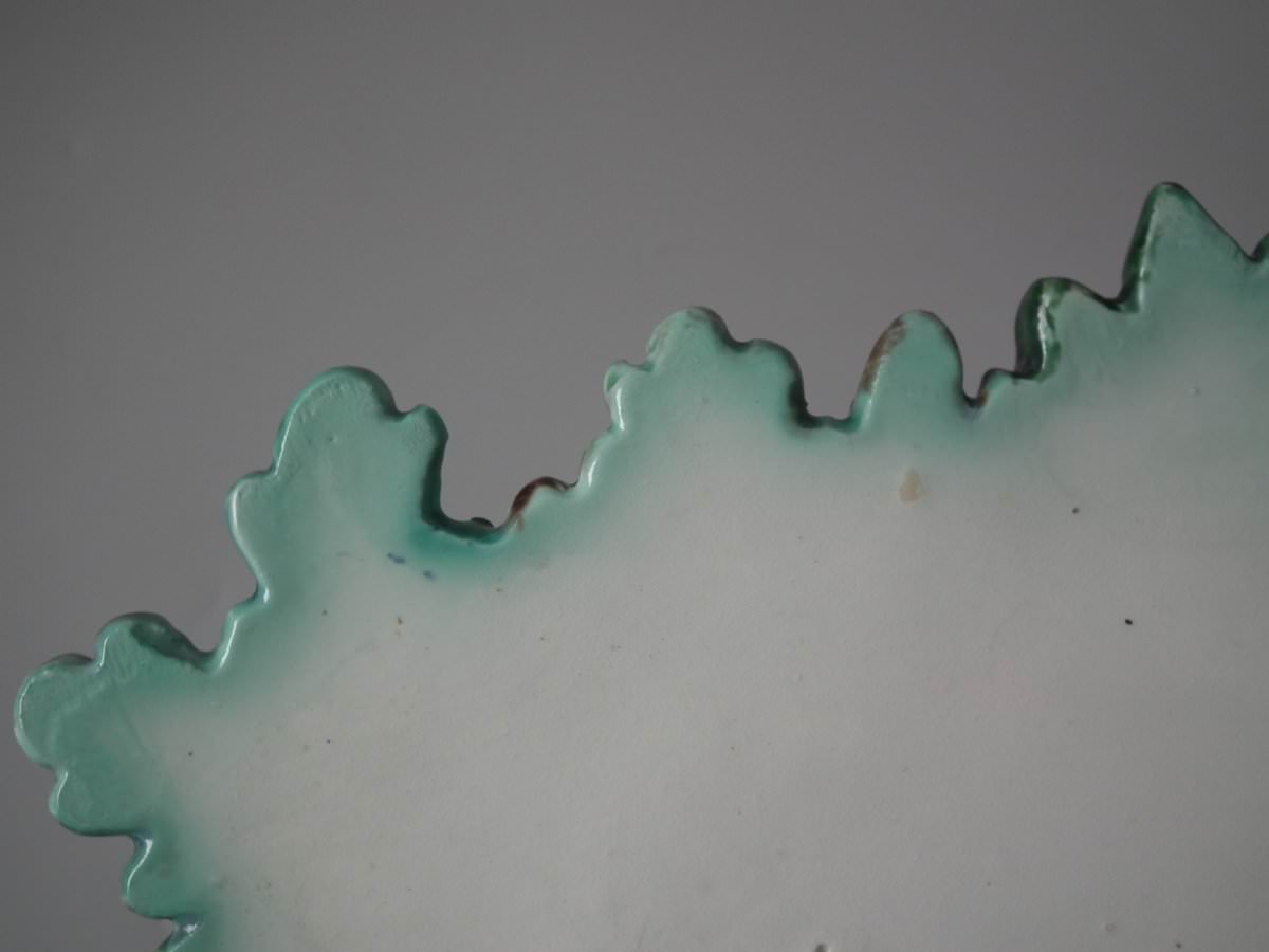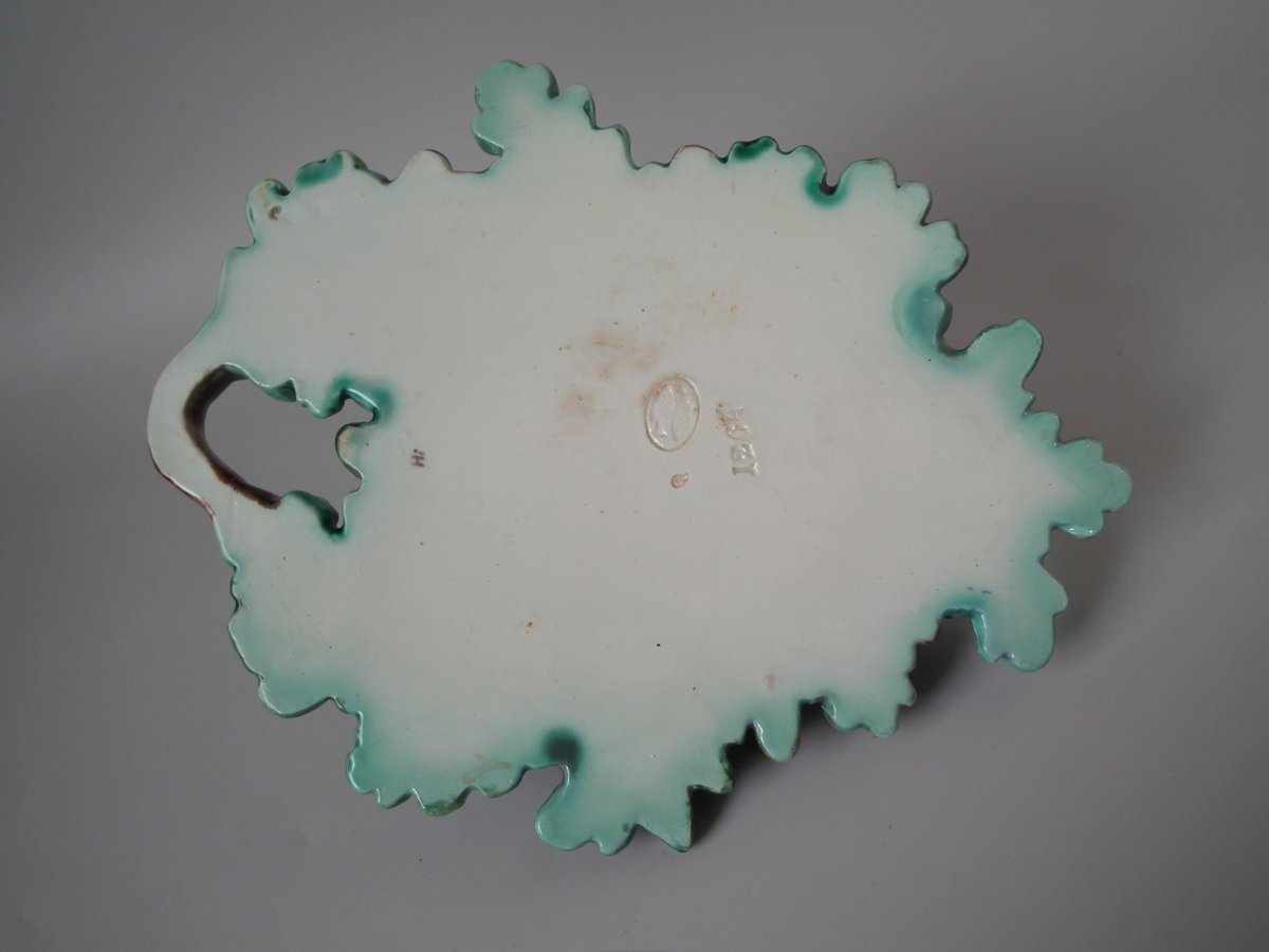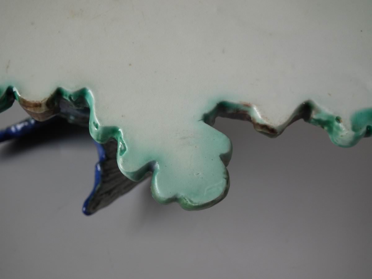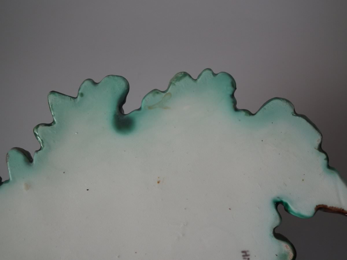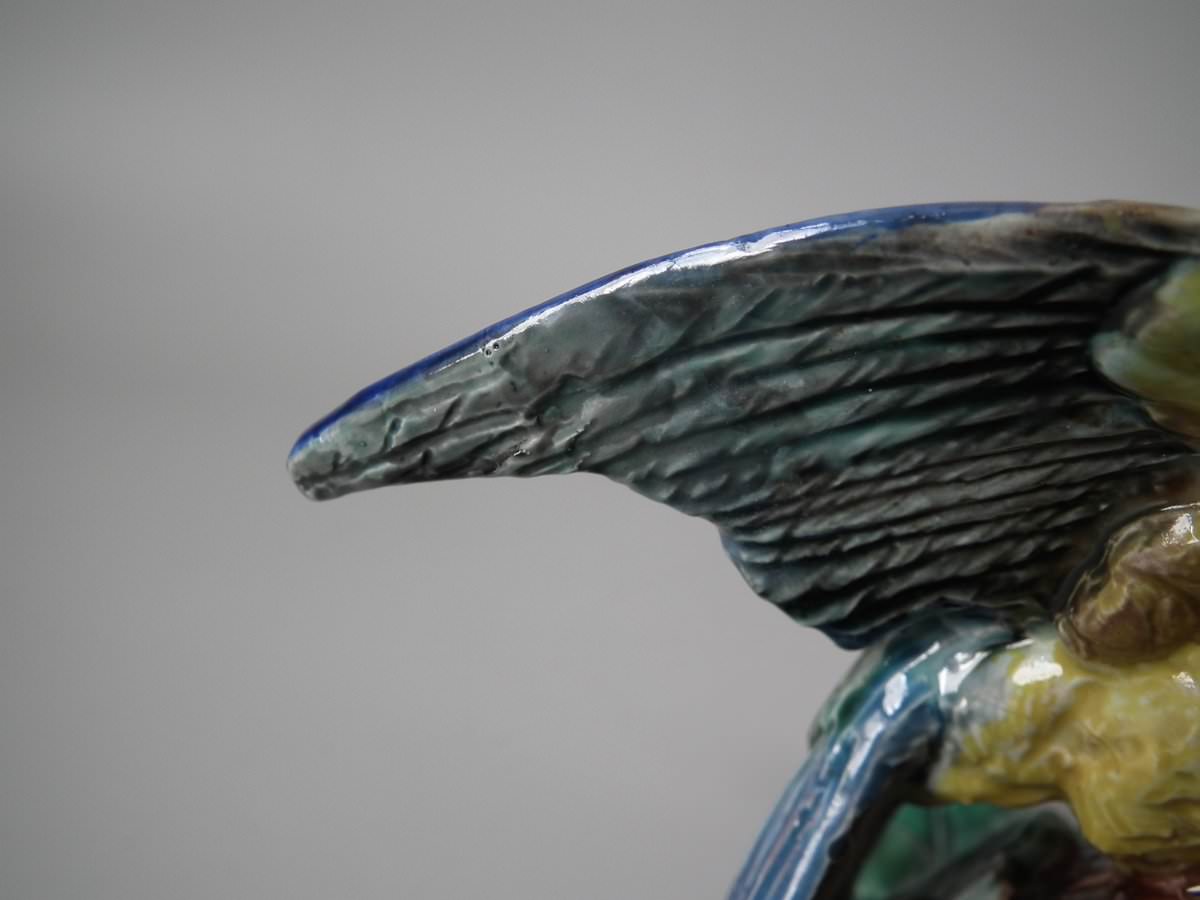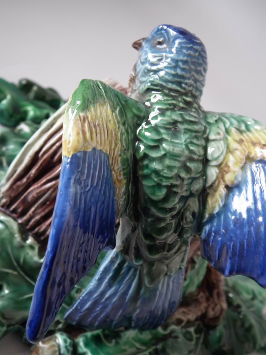 Victorian, circa 1880. 9.4ins high, 7.9ins wide, 4.7ins depth. Lonitz Majolica wall pocket which features a goldfinch on one side and another finch on the other, attending their nests, surrounded by oak leaves and acorns.