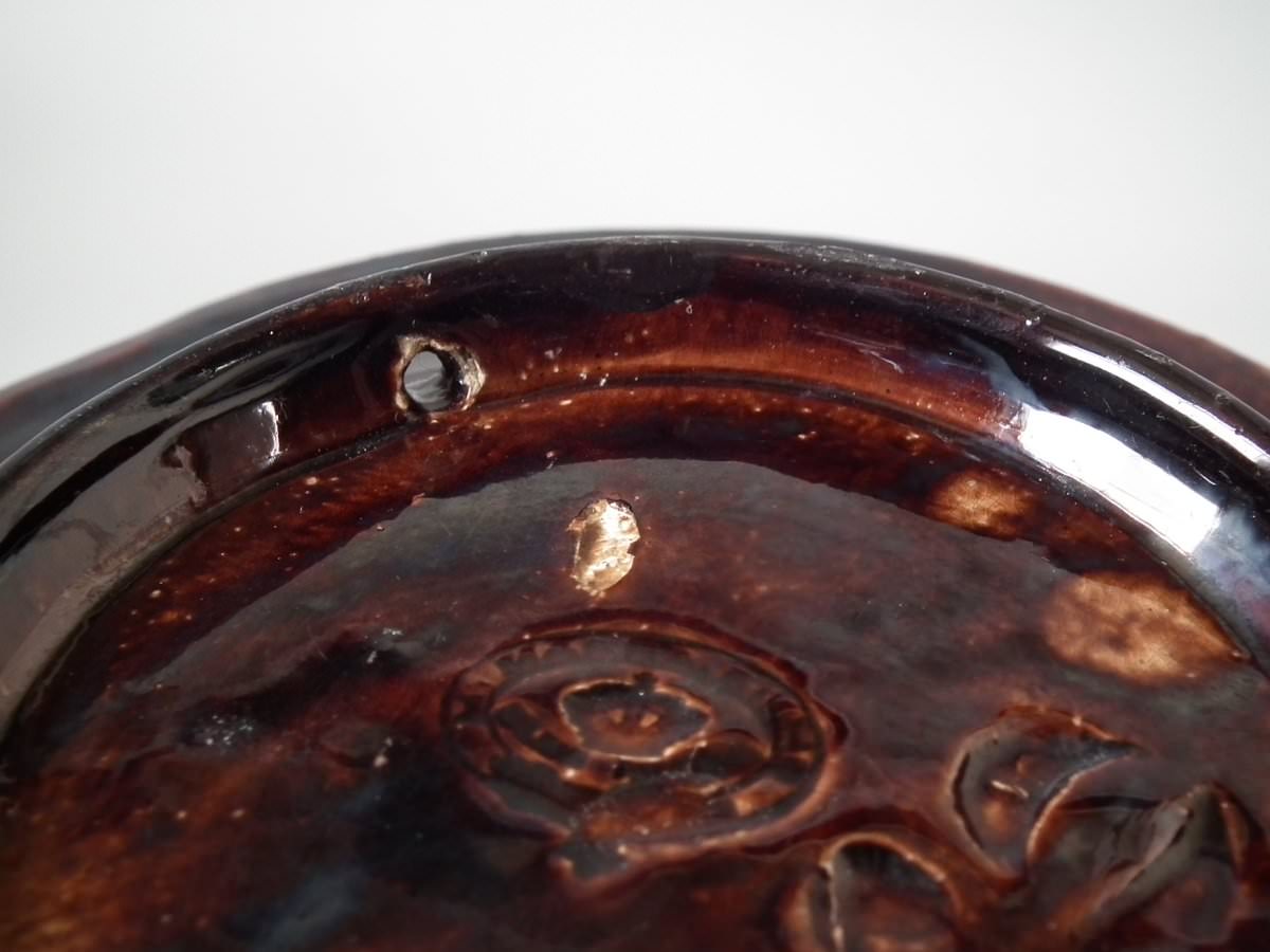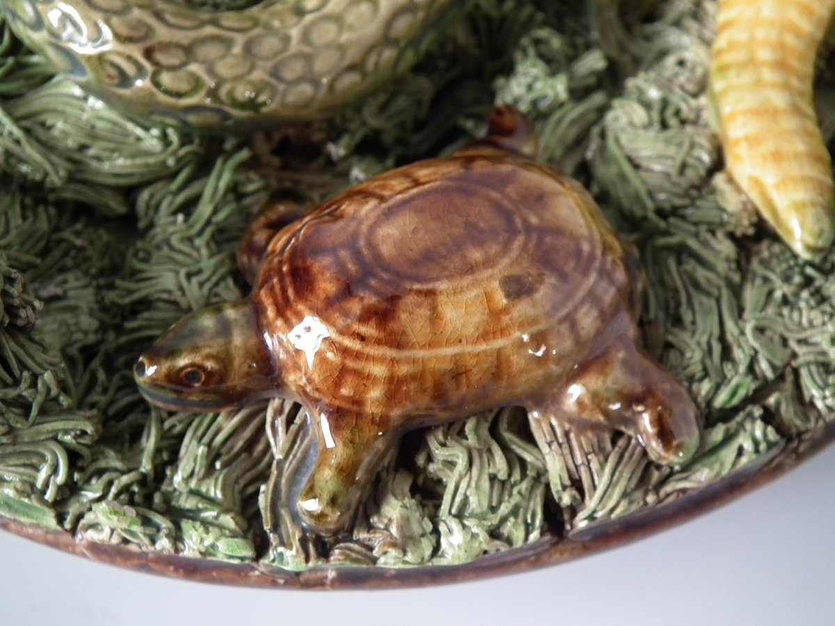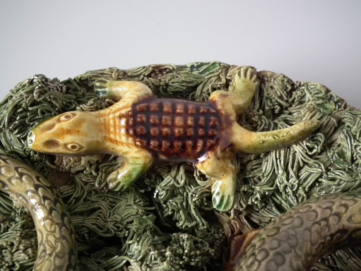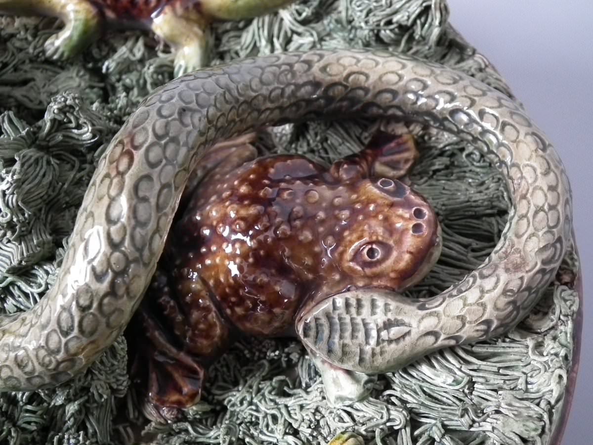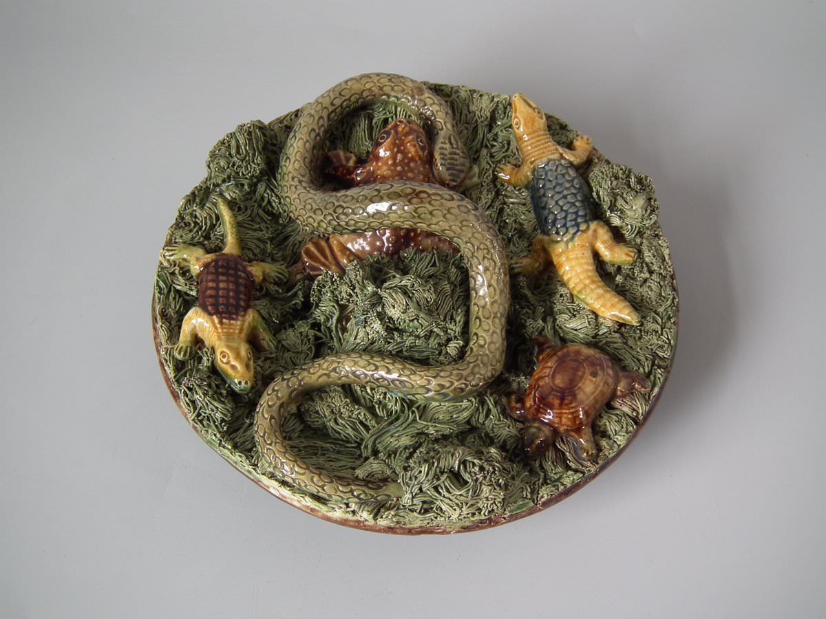 Circa 1890. 7.1ins high, 7.1ins wide, 2.8ins depth. Mafra Portuguese Palissy Majolica wall plate which features A snake, toad, tortoise and two salamanders.