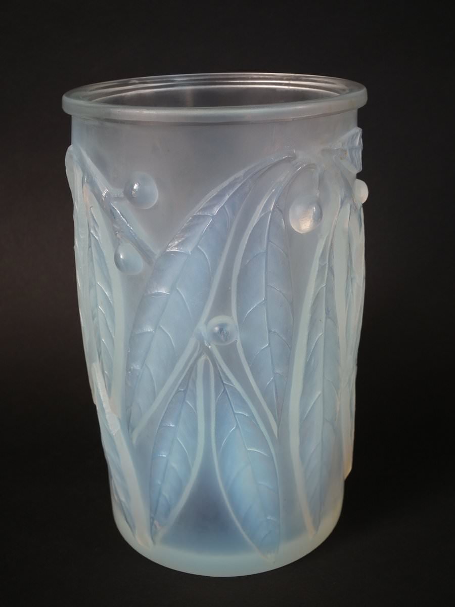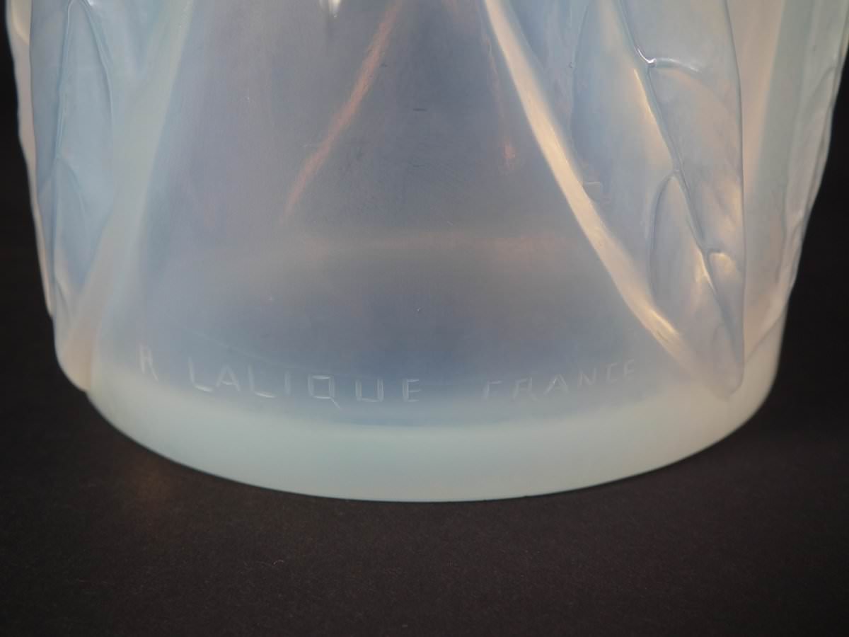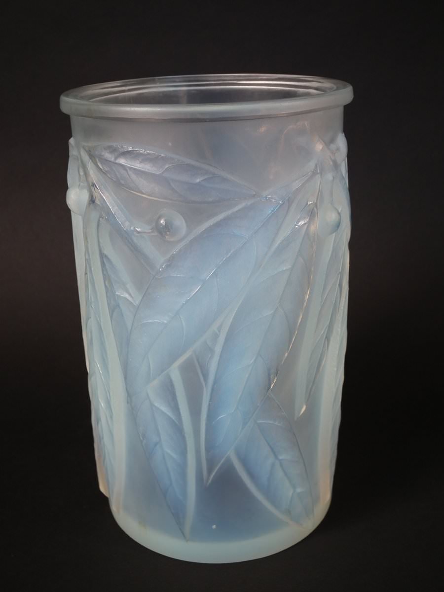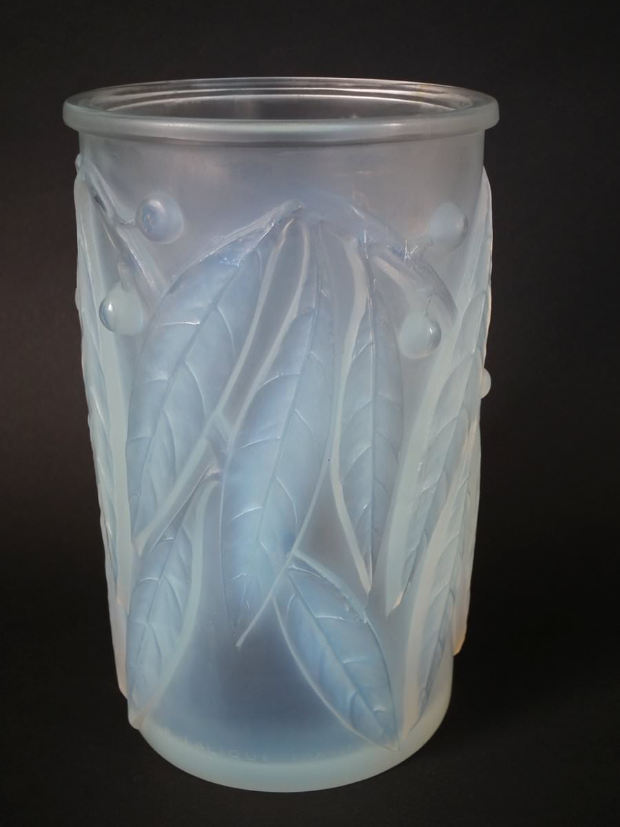 Introduced in 1922. Height: 18cm (7ins). Width: 11cm (4.25ins). Depth: 11cm (4.25ins). Rene Lalique Opalescent Glass 'Laurier' Vase.