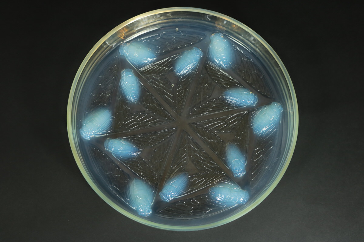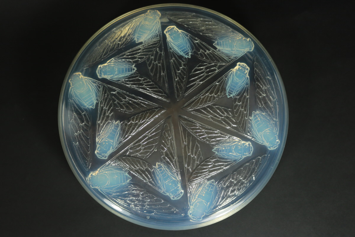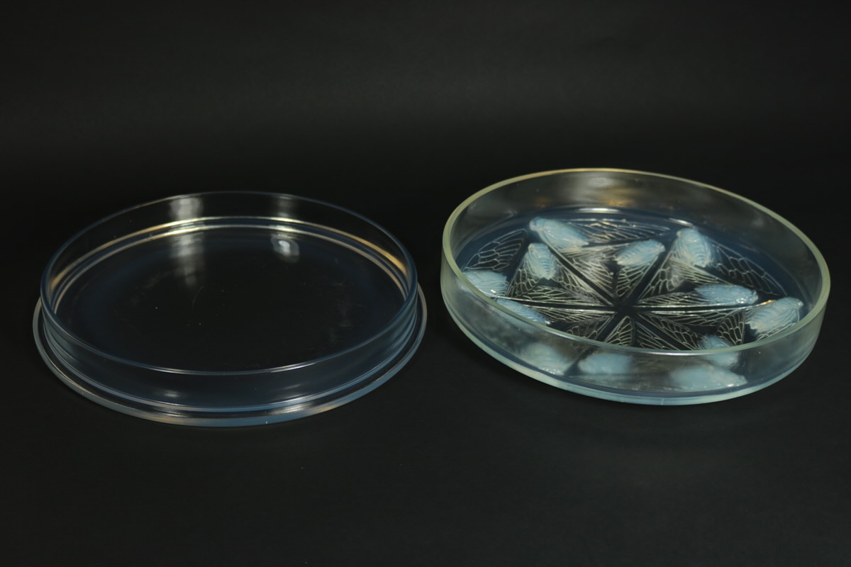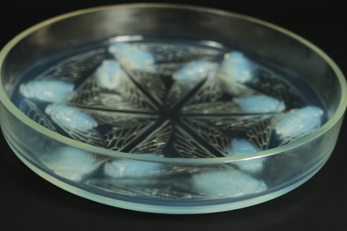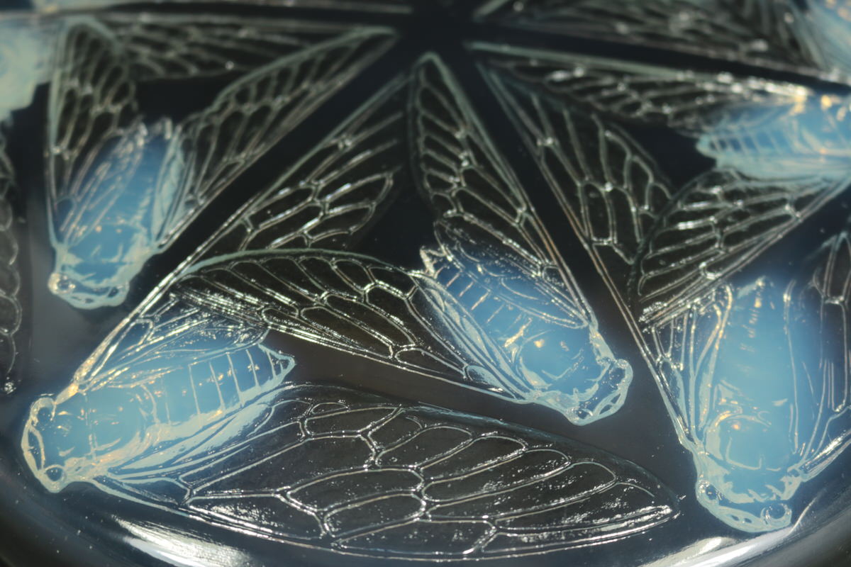 Introduced in 1921. Height: 6.5cm (2.56ins). Width: 26cm (10.24ins). Depth: 26cm (10.24ins). Rene Lalique Opalescent Glass 'Cigales' Box.