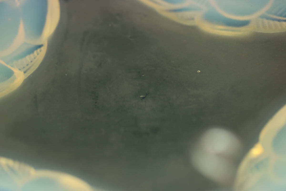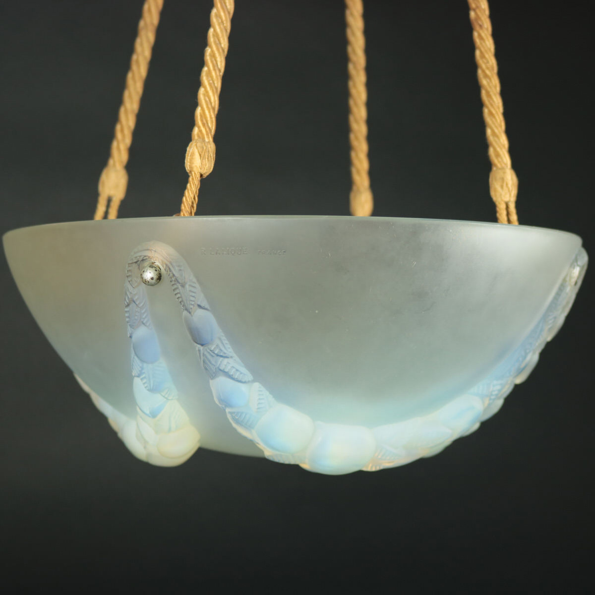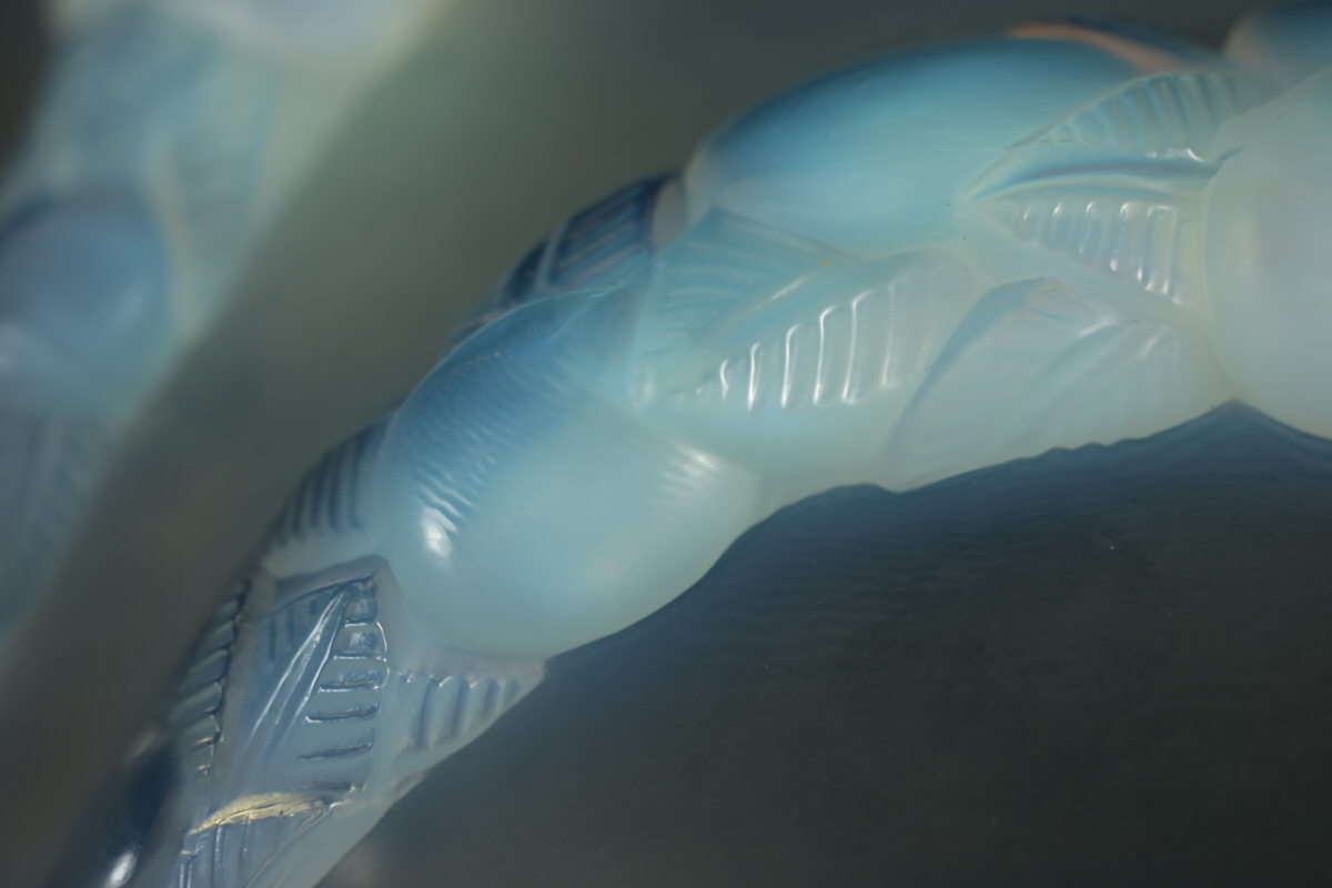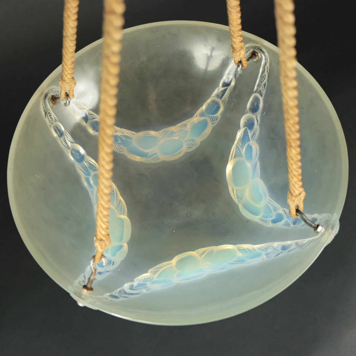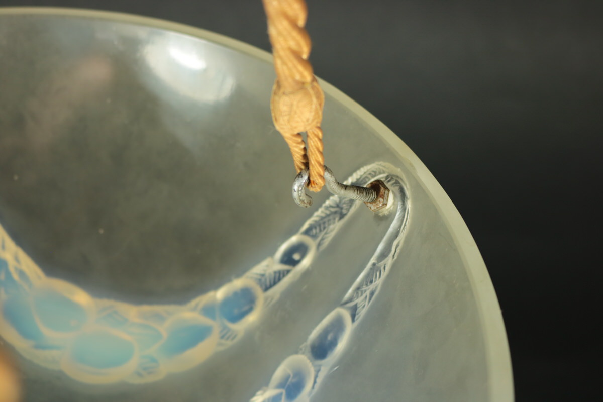 Introduced in 1928. 4.7ins high, 12.4ins wide, 12.4ins deep. Rene Lalique opalescent and frosted glass Villeneuve ceiling light shade.