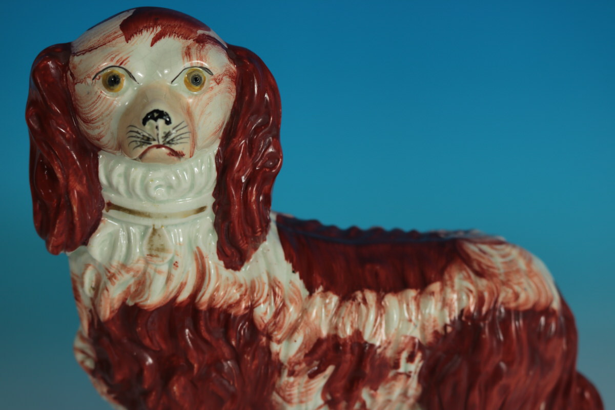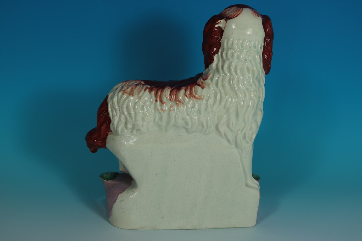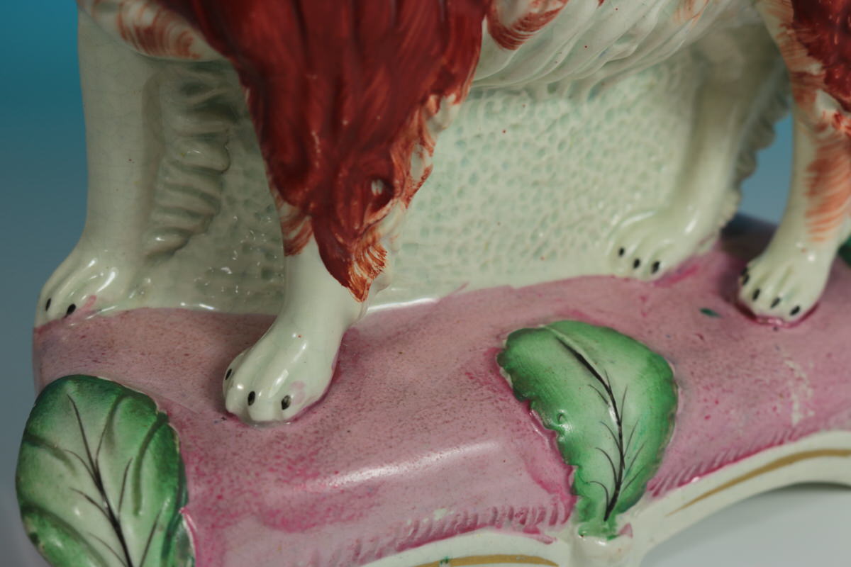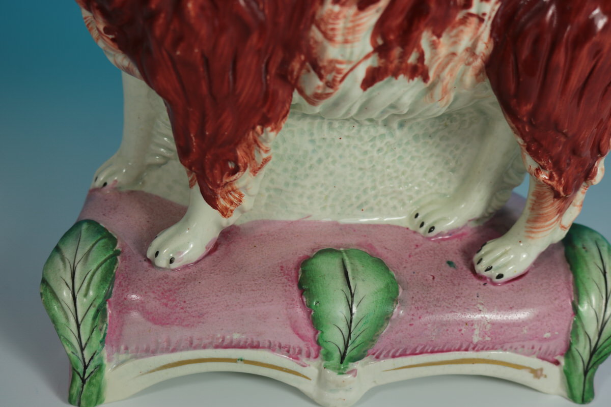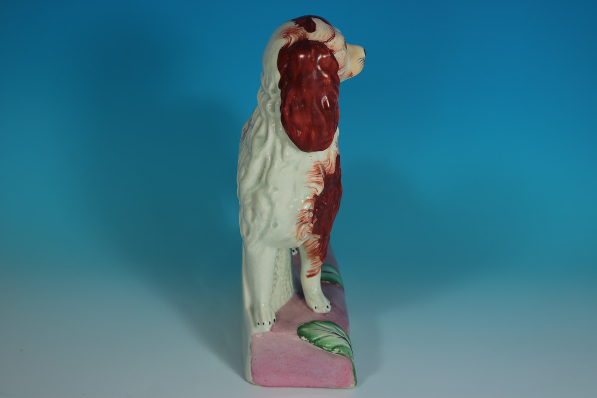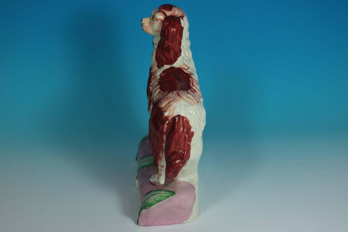 Victorian, circa 1860. 9.8ins high, 8.3ins wide, 3.3ins depth. Staffordshire Pottery figure which features a King Charles Spaniel, stood on a leaf embellished base.