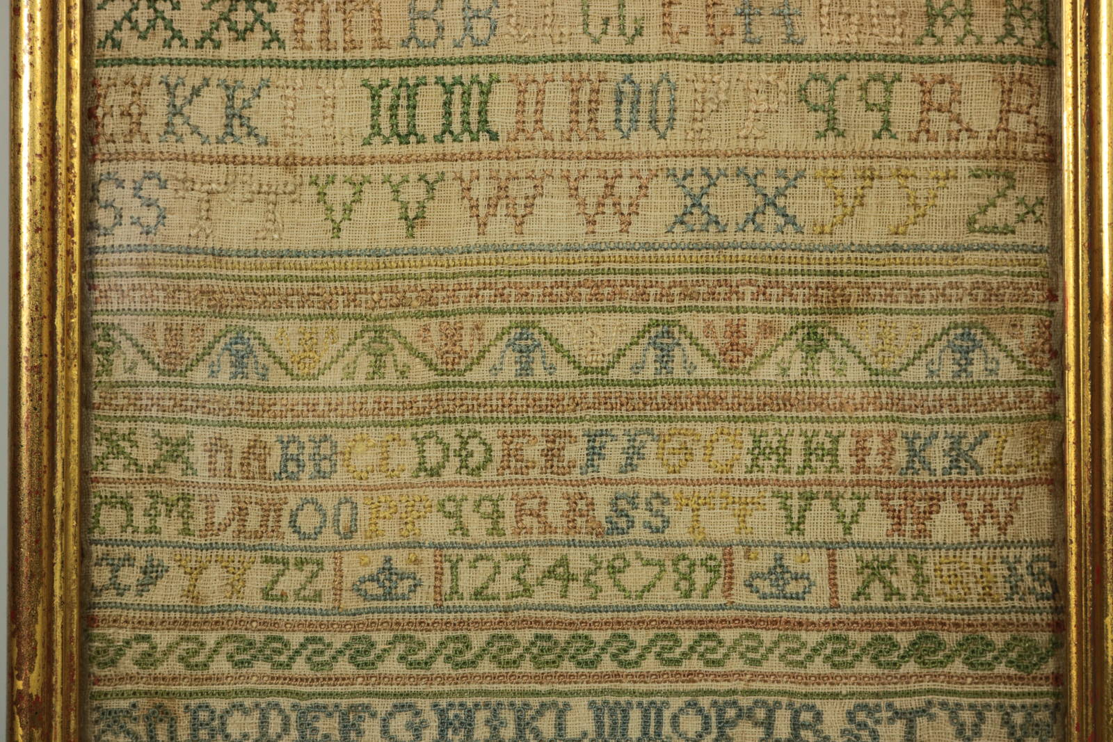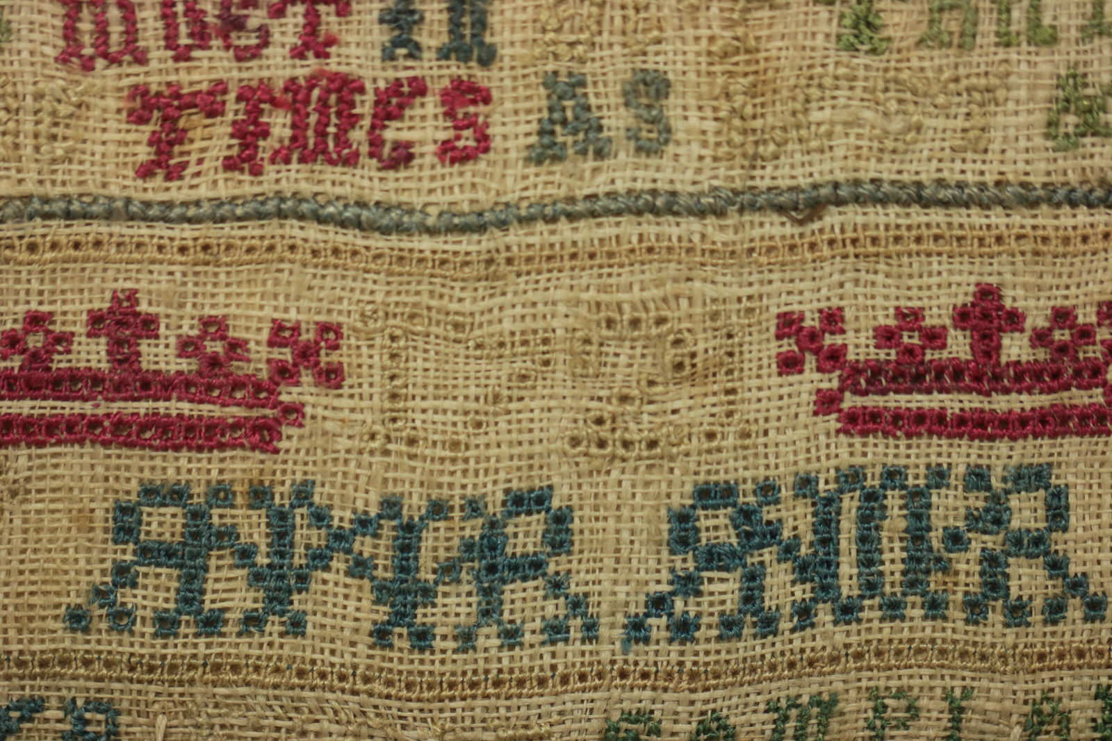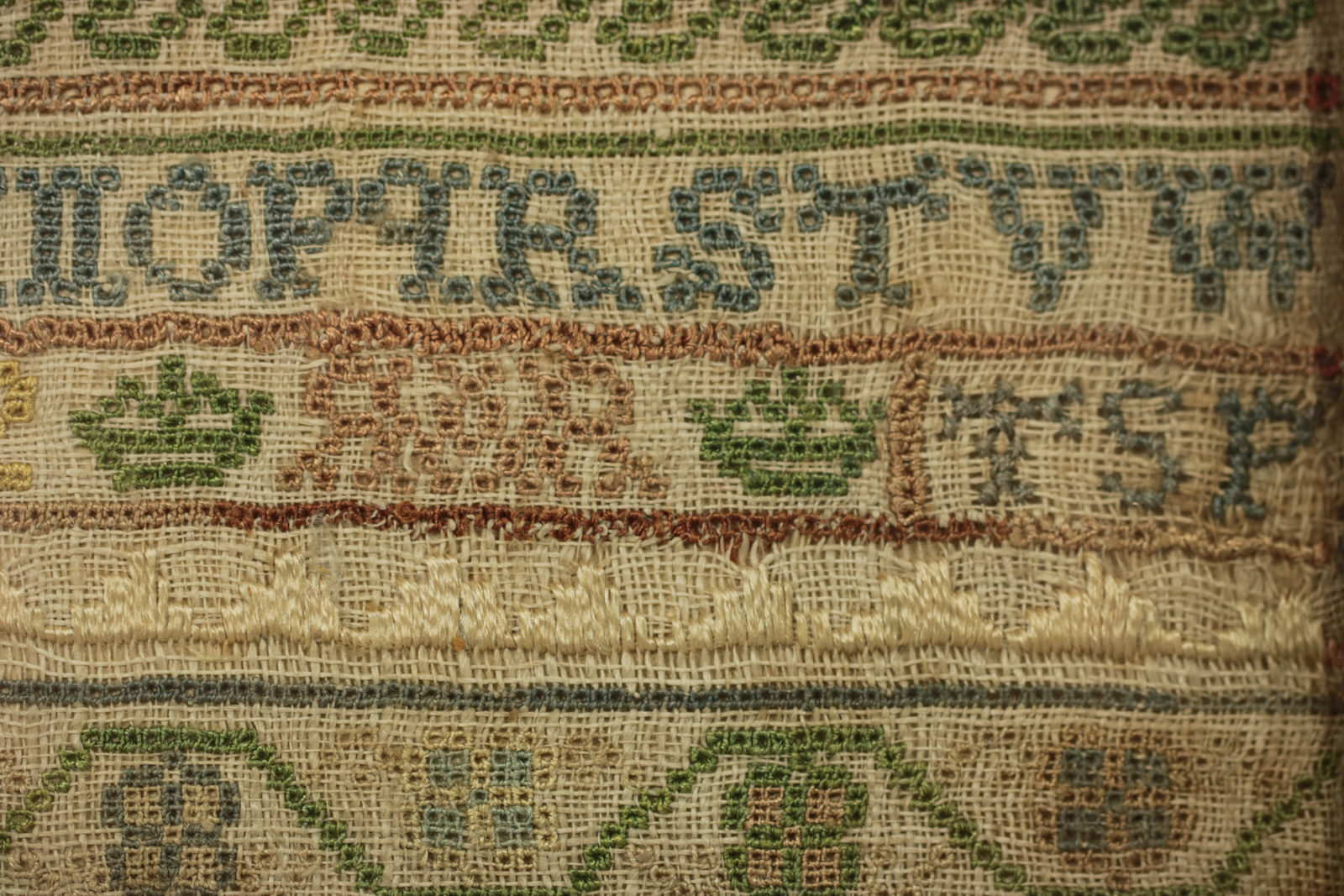 Worked in silk and cotton on linen ground, in a great variety of stitches including very fine Algerian eye and some raised work. Divider lines in numerous stitches, patterns and colours, including alphabets, numbers, and the inscription "Mans lives is nothing but a winters day some only bred their past and so awry Others stay dinner and depart full fend The deepemst age but sups and goes to bed Hes most in det that lingers out txx the day who dies so times as lest and best today".