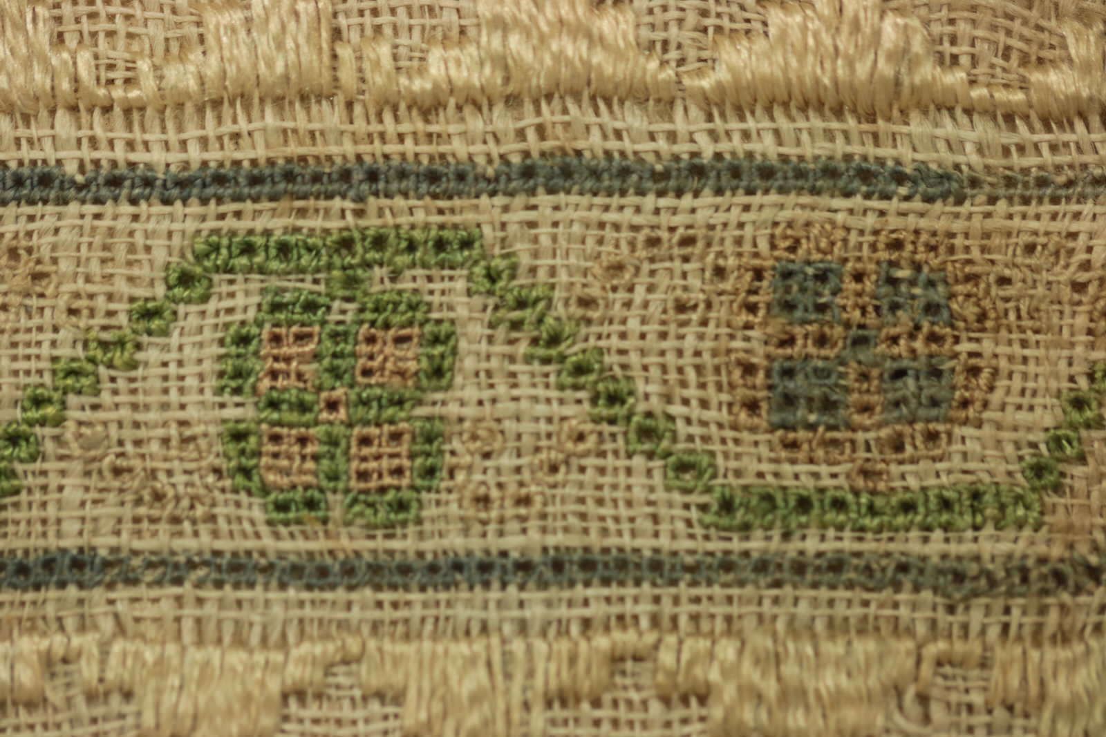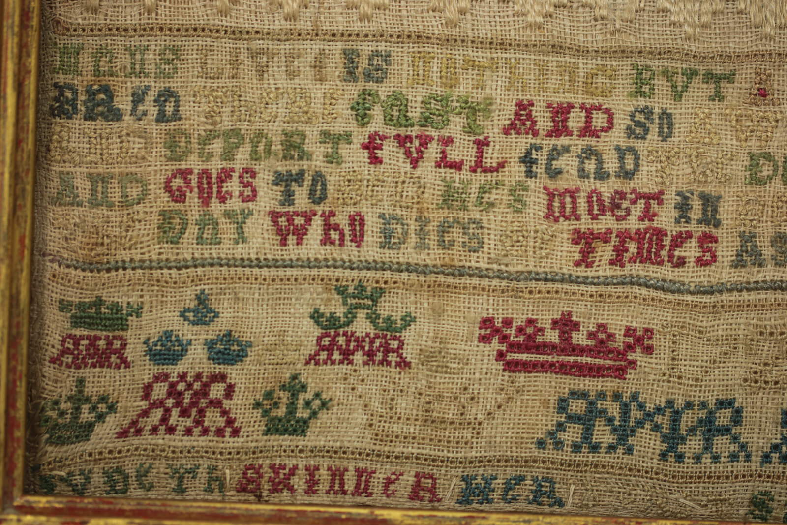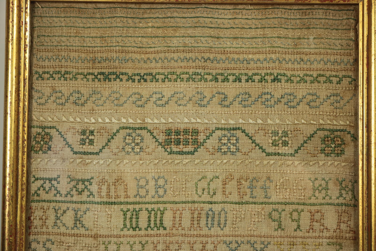 Worked in silk and cotton on linen ground, in a great variety of stitches including very fine Algerian eye and some raised work. Divider lines in numerous stitches, patterns and colours, including alphabets, numbers, and the inscription "Mans lives is nothing but a winters day some only bred their past and so awry Others stay dinner and depart full fend The deepemst age but sups and goes to bed Hes most in det that lingers out txx the day who dies so times as lest and best today".