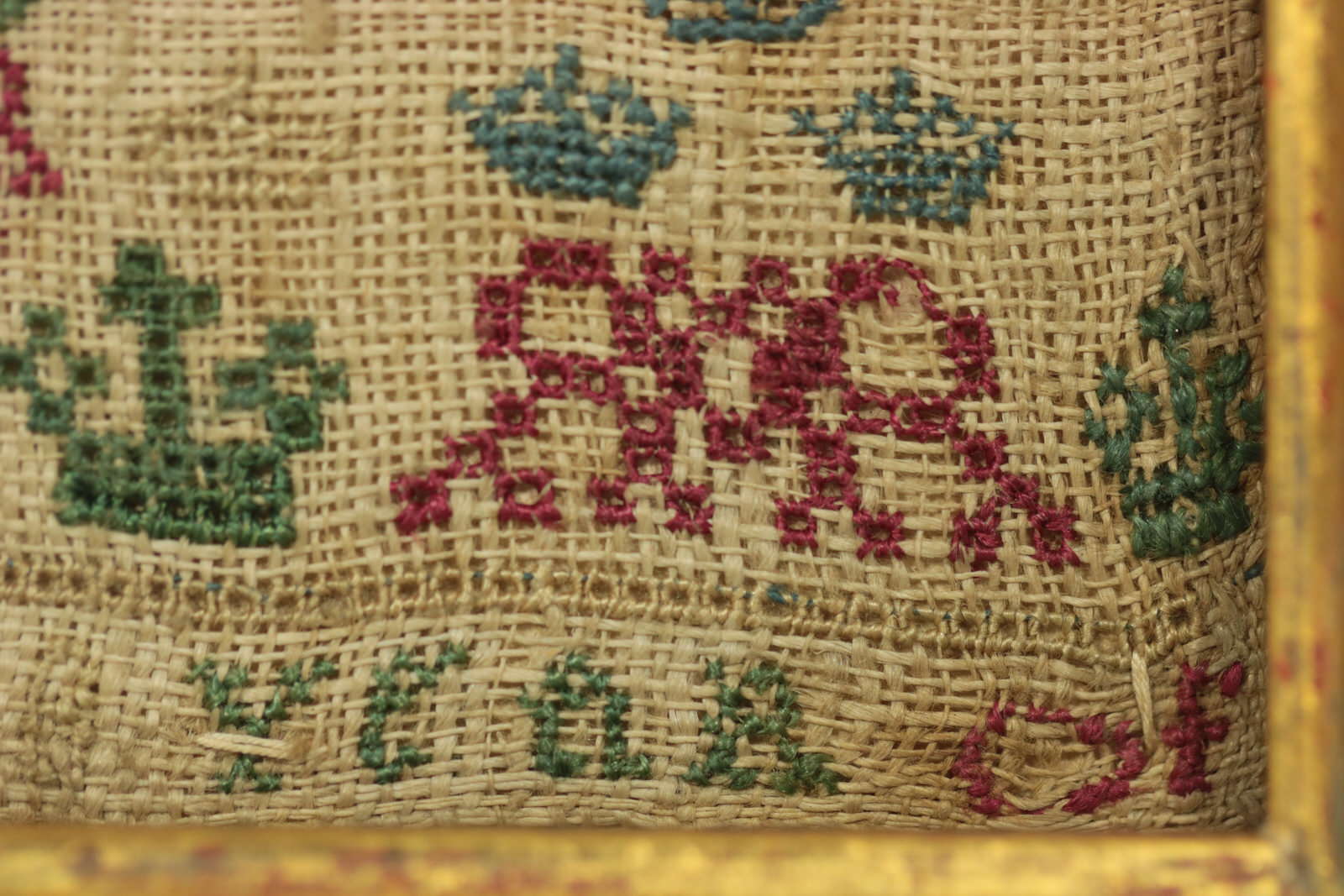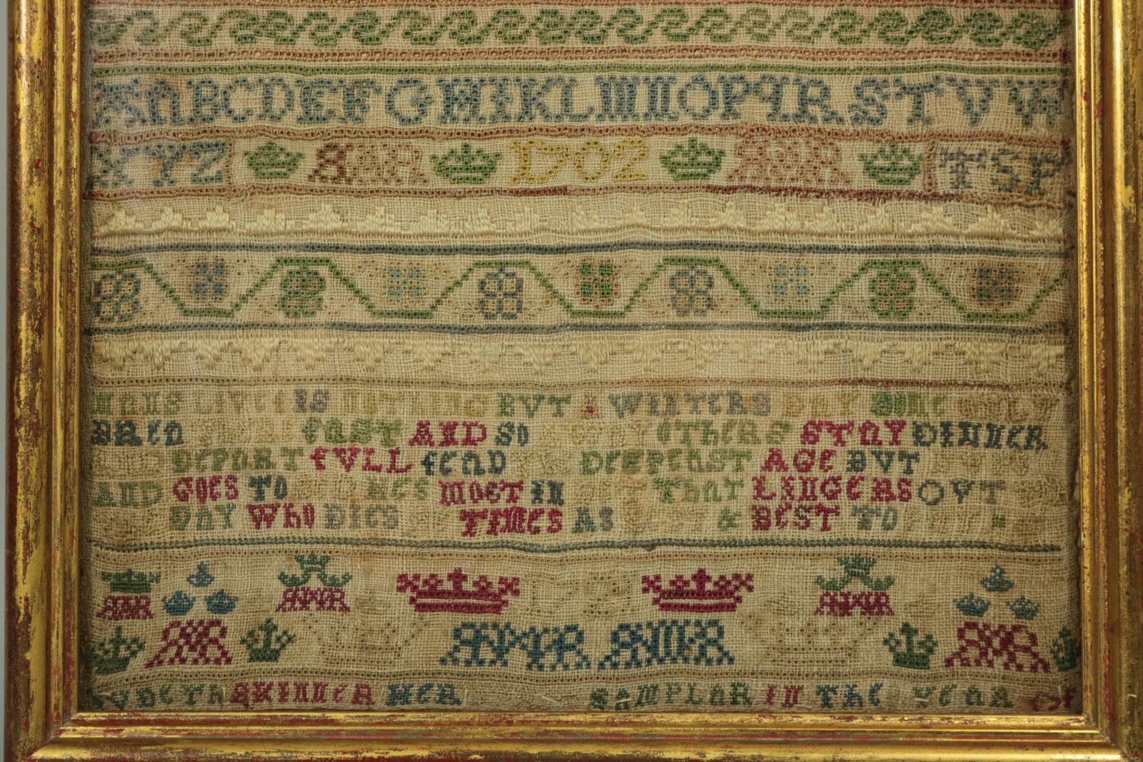 (N.B: Despite the last band, "Judeth Skinner her sampler in the year of", finishing abruptly, having examined out of the frame, we feel this is how it was originally made. The finish (We have a pic of it out of the frame) at the bottom edge of the sampler matches all the other edges.)
