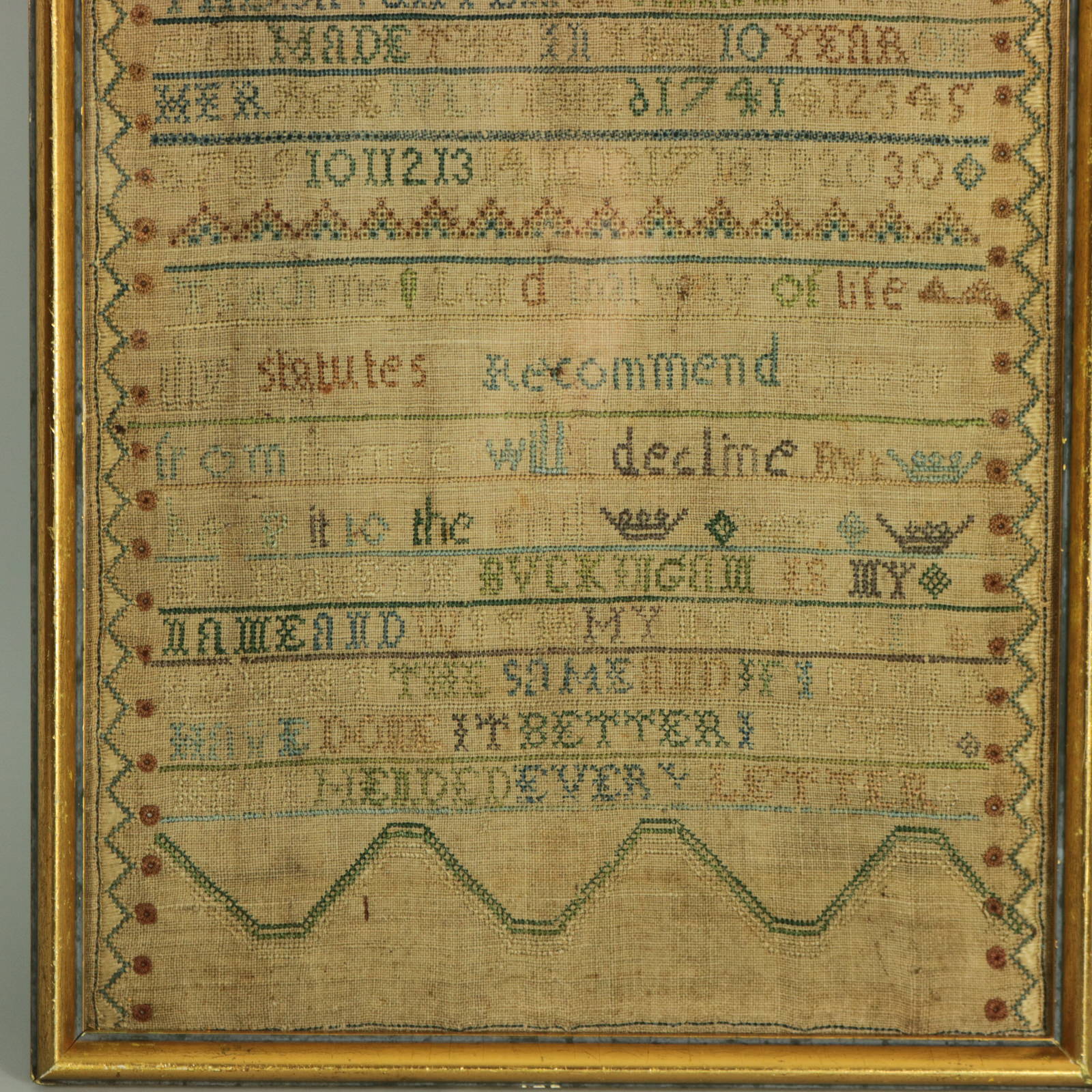 Signed and dated 'ELIZABETH BVCKINGAM THE DAVGHTER OF SARAH BVCKINGAM MADE THIS IN THE 10 YEAR OF HER AGE JULY 6 1741'.