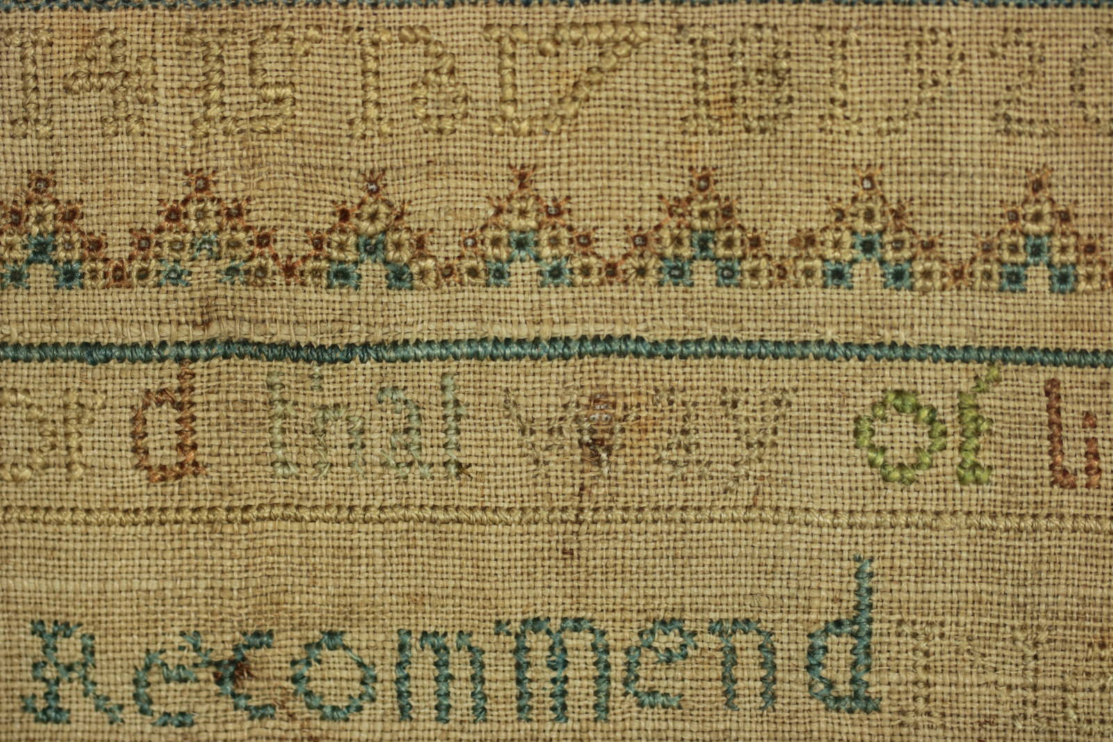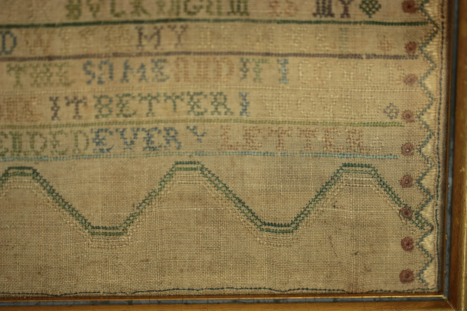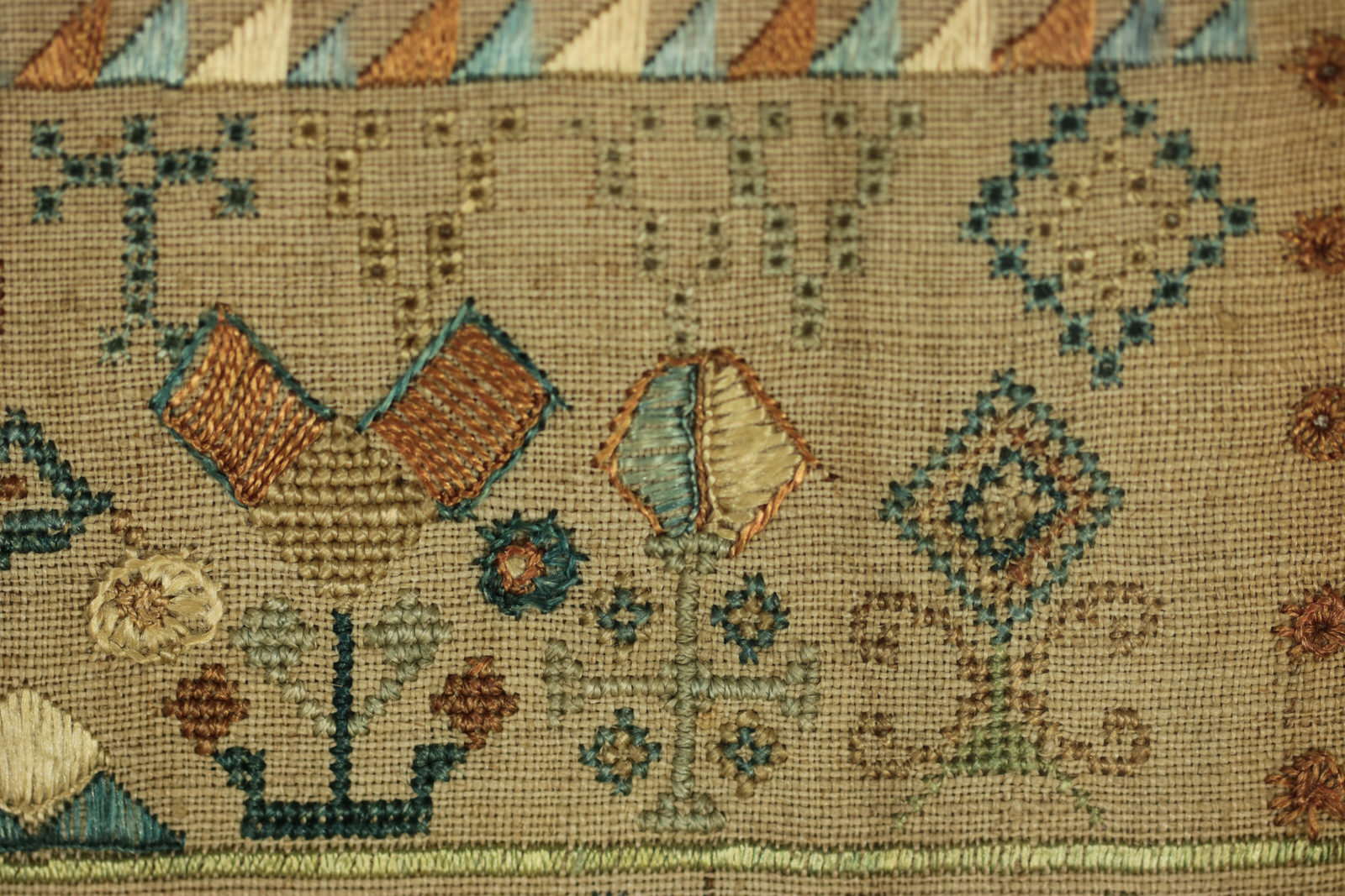 The sampler is worked in silk and linen ground, in a variety of stitches including Algerian eye.