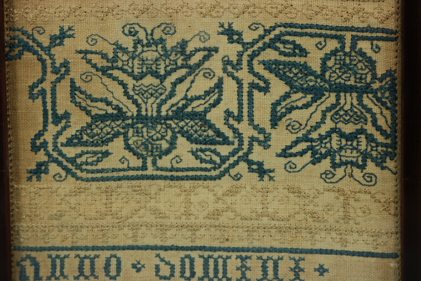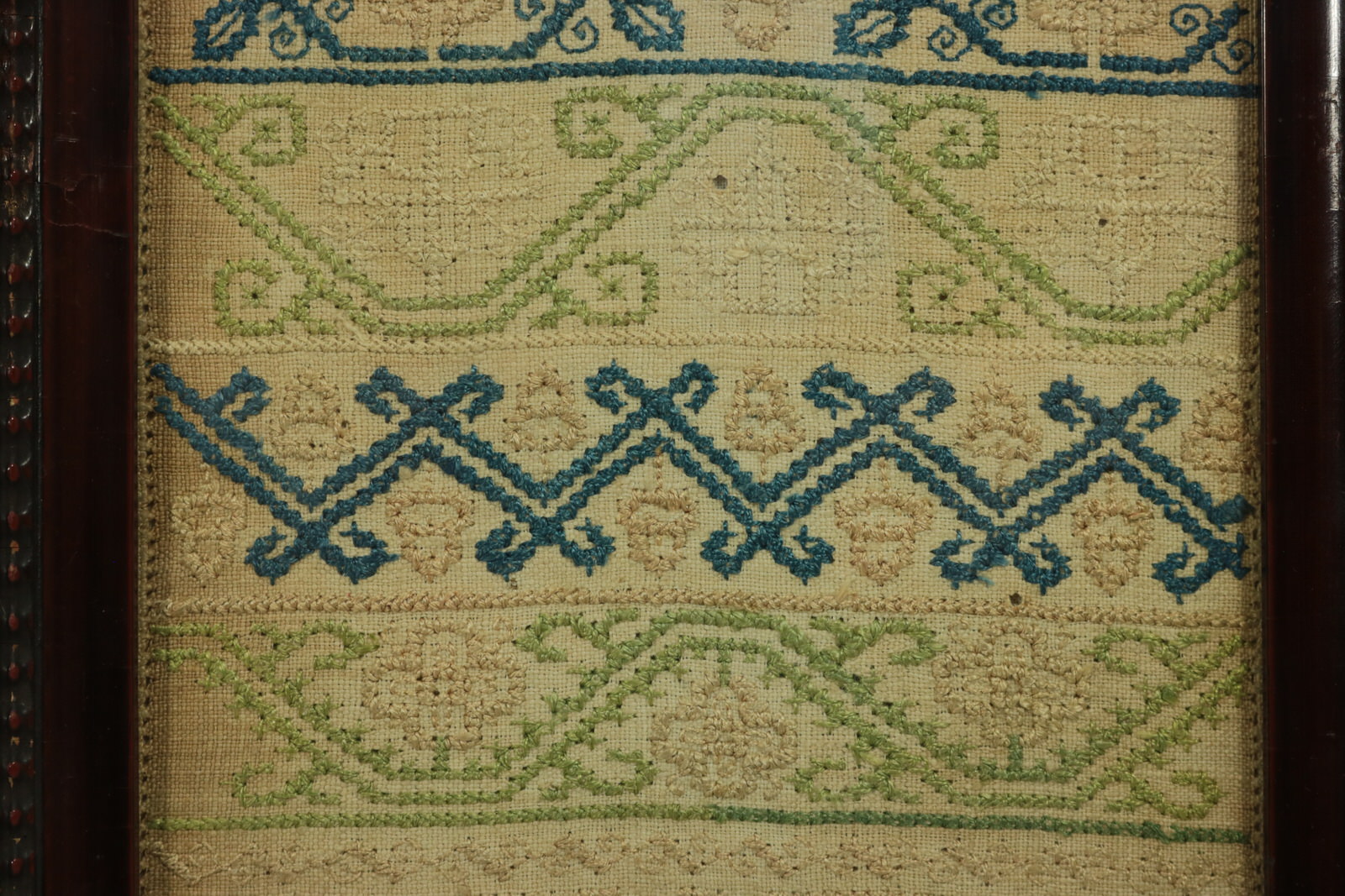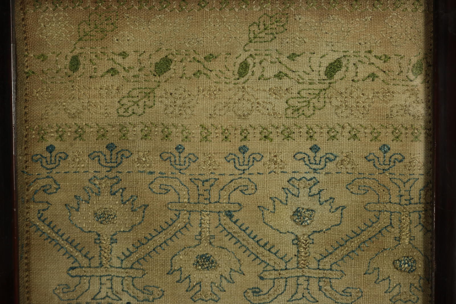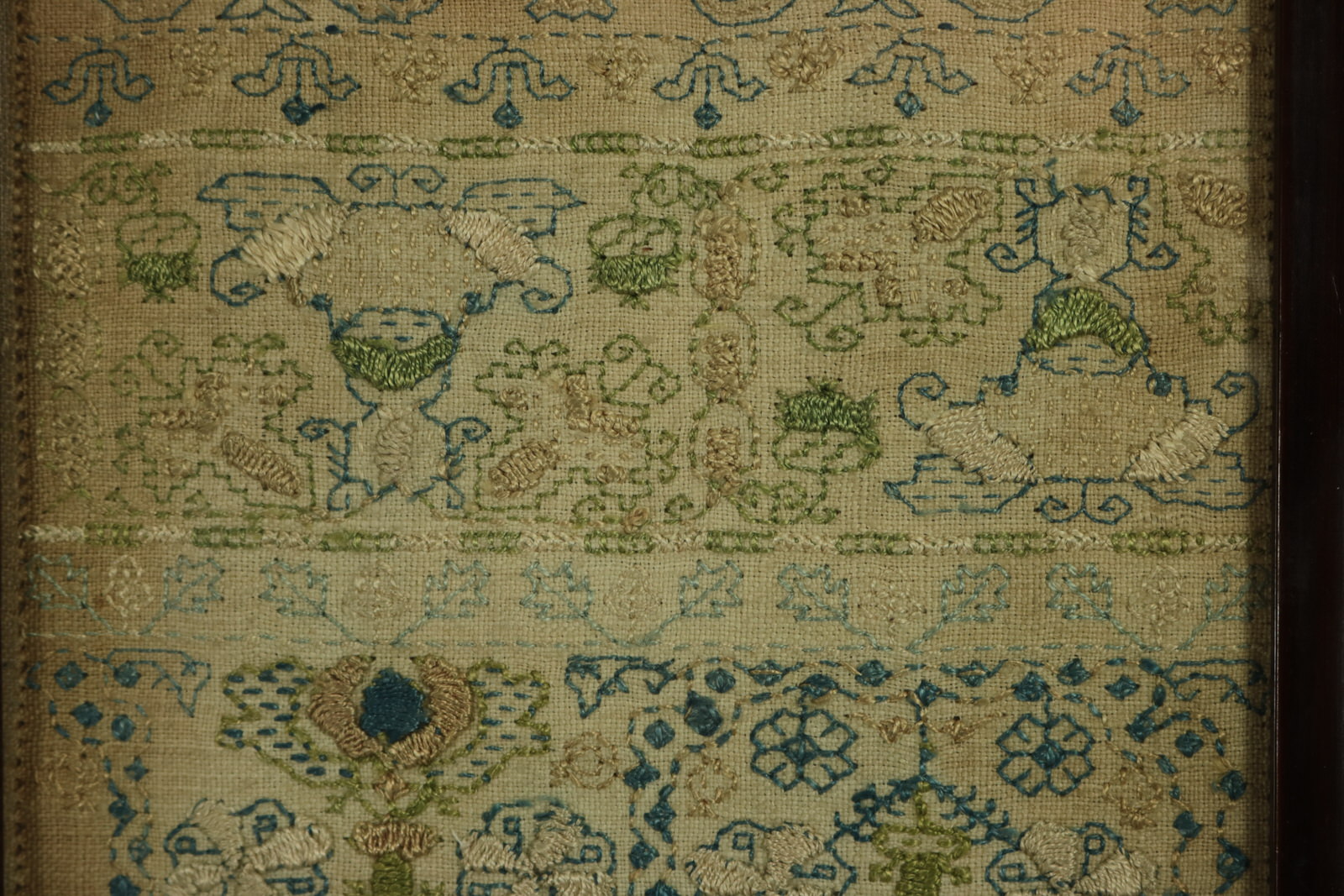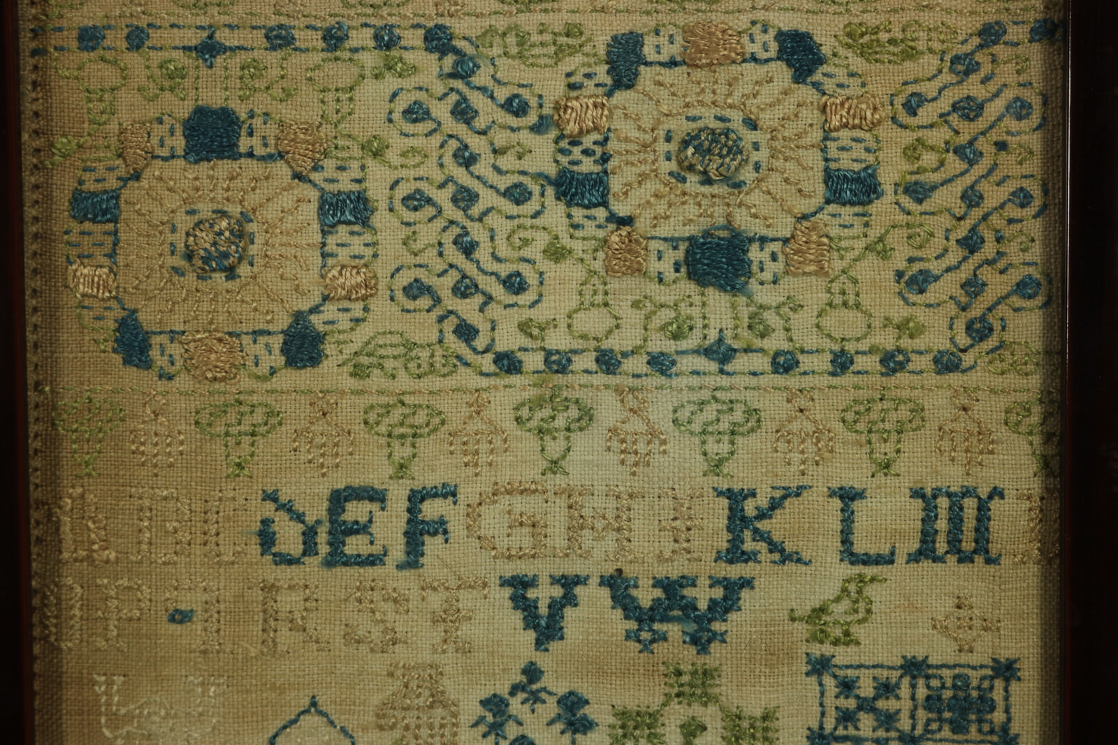Mounting: The sampler is secured top and bottom with acid free textile tape, otherwise loose mounted on linen over board. Frame backed and sealed with brown paper tape.