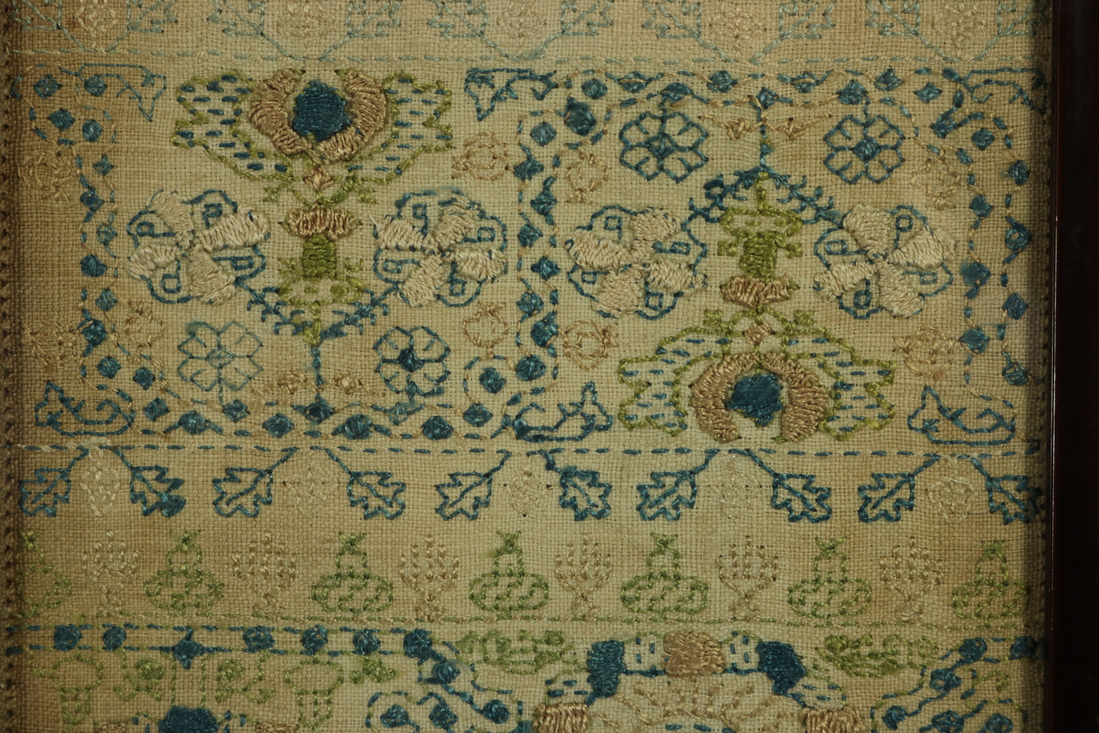Worked in silks on linen ground, in a variety of fine stitches including raised work and Algerian eye. Simple line borders, multiple traditional complex design bands, one with motifs including frog, strawberry plant, ferns, dog, rabbit, birds and crosses, and dividers.
