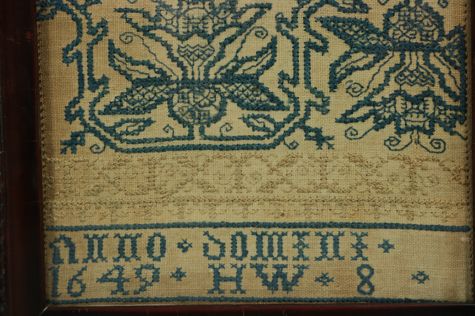 Colours blue, browns, greens, cream, pink and gold . Alphabet A-Z in upper case. Inscription reads, 'ANNO * DOMINI *1649 * HW * 8 *'.