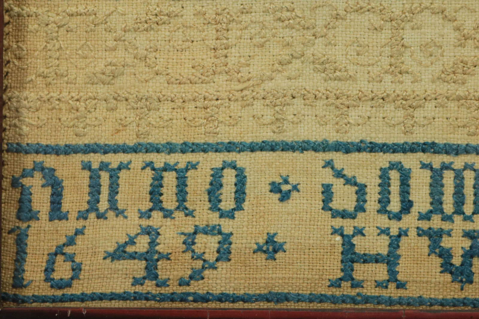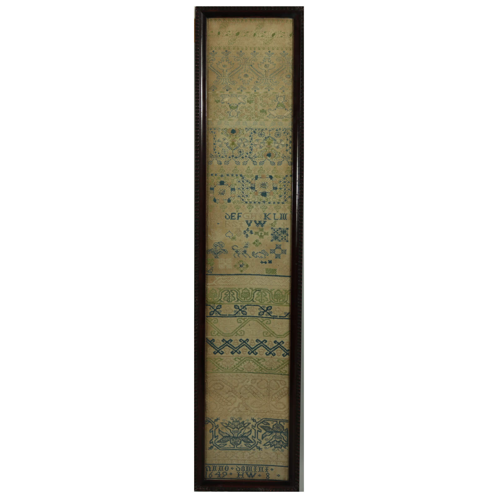 Mid 17thC, dated 1649. 32.5ins high, 6ins wide, 0.75ins deep. 1649 band sampler by HW aged 8.