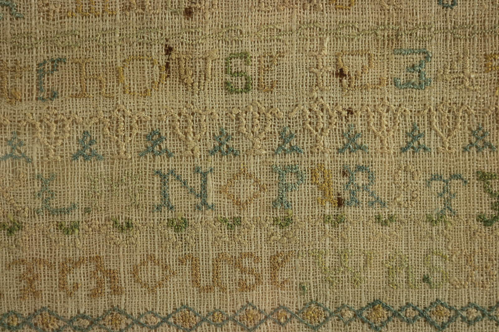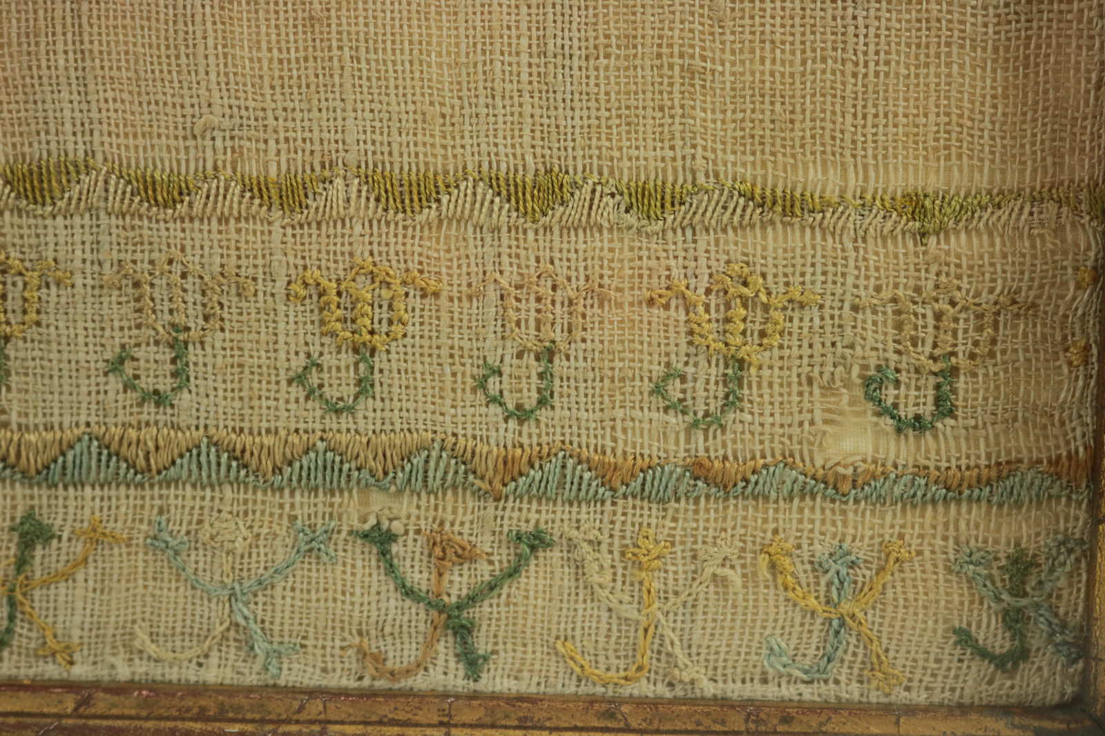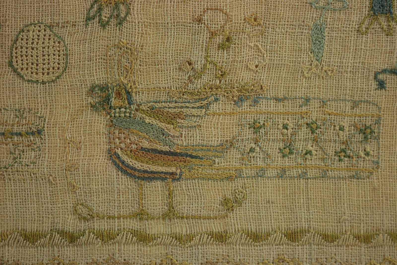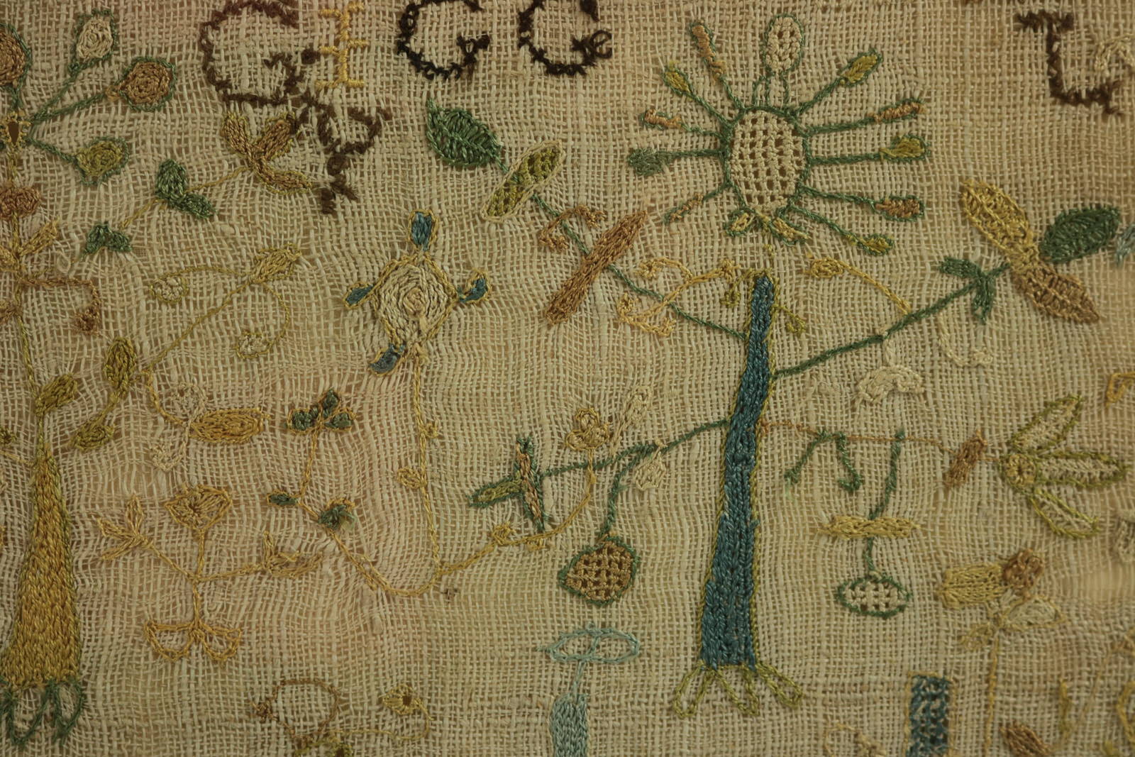 The sampler is worked in silk on a linen ground, in a variety of stitches. No border, divider lines in various patterns.
