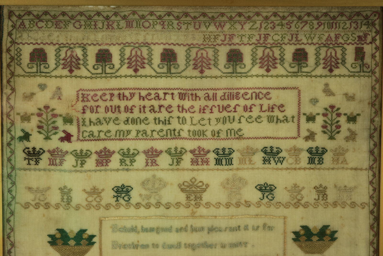 Inscription reads, 'Keep thy heart with all diligence, for out of it are the issues of Life, I have done this to Let you see What care my parents took of me.' And, 'Behold, how good and how pleasant it is for Brethren to dwell together in unity.'.