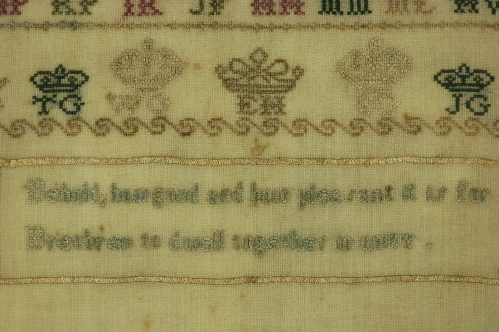 This sampler is unusual in that it appears to have been stitched by two siblings, working on it together.