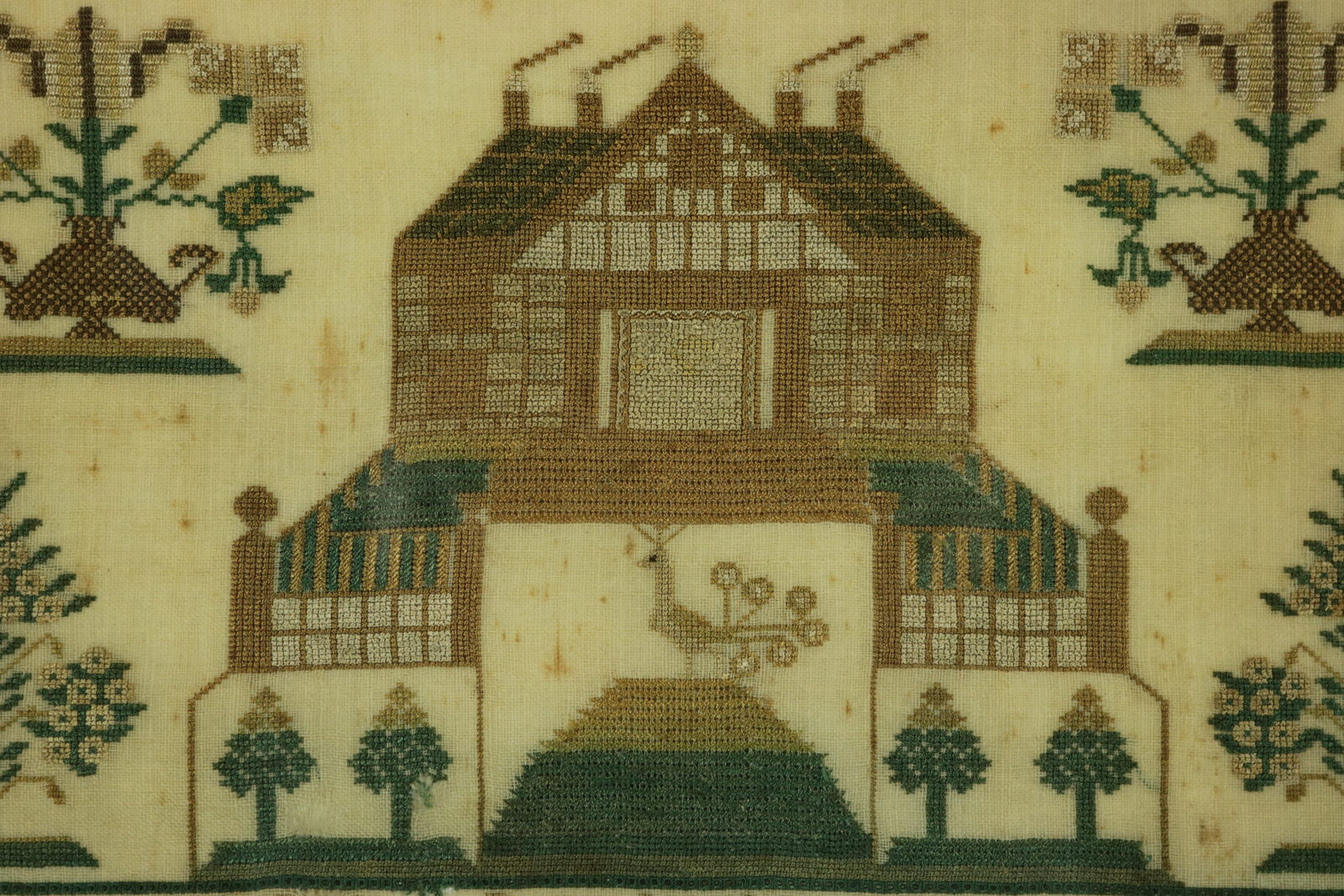 The sampler is worked in silk on linen ground, in cross stitch throughout.