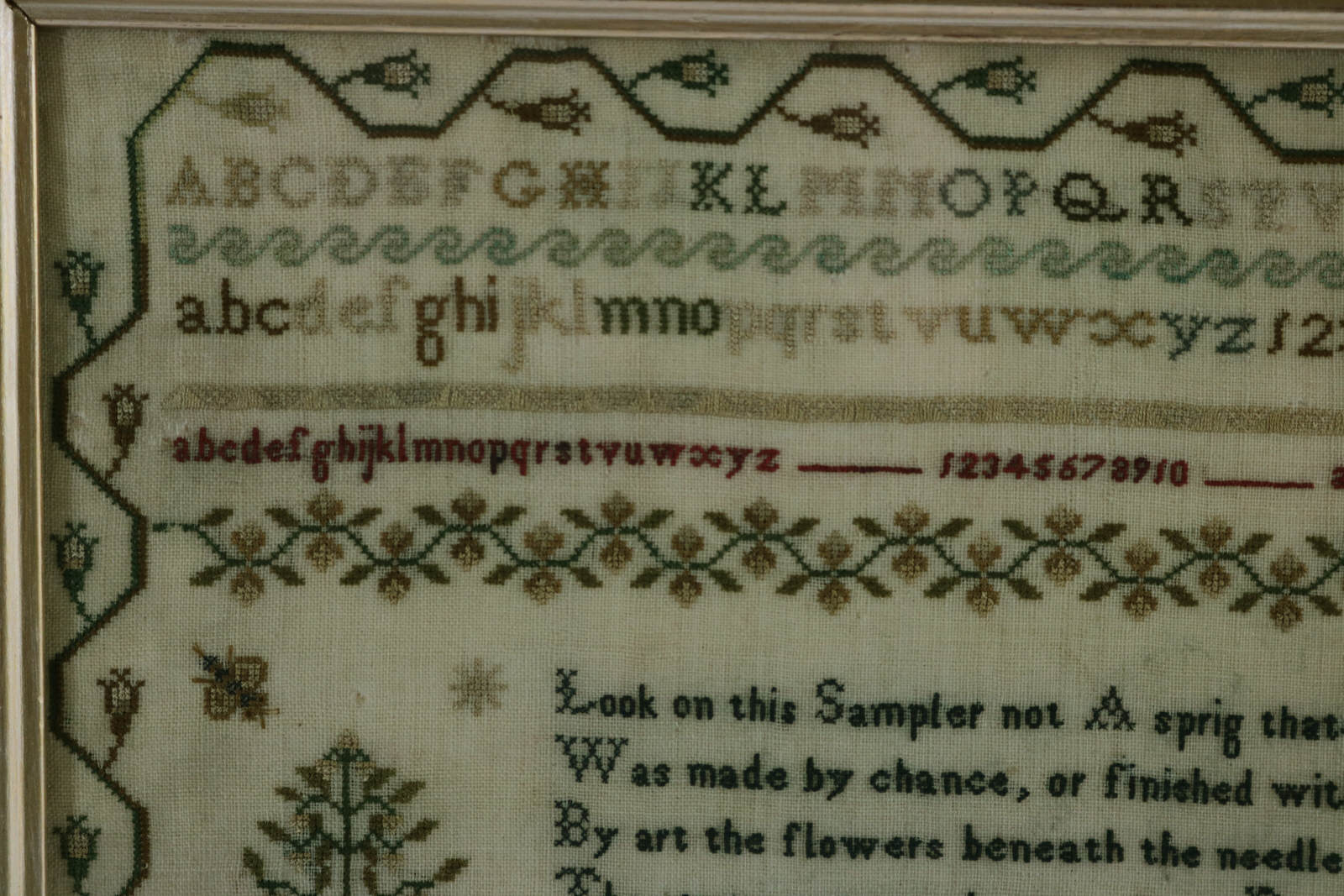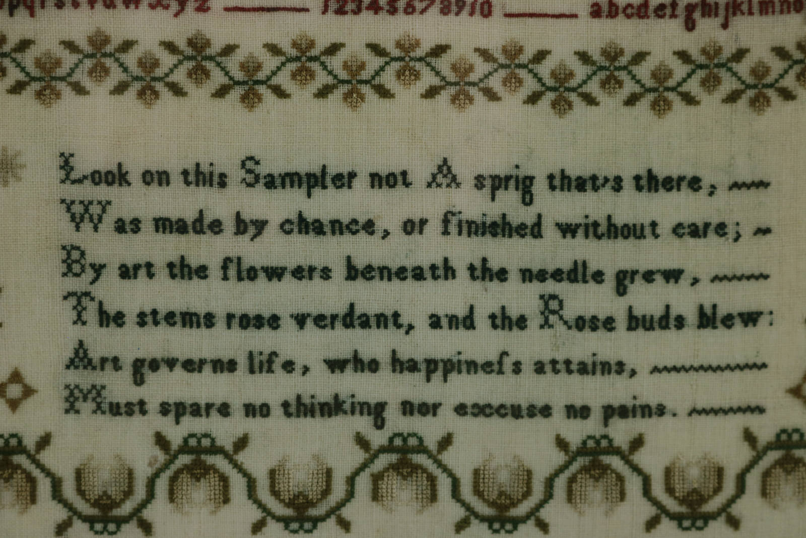 Verse reads 'Look on this Sampler not A sprig that's there; Was made by chance, or finished without care; By art the flowers beneath the needle grew, The stems rose verdant, and the Rose buds blew: Art governs life, who happinefs attains, Must spare no thinking nor excuse no pains.'