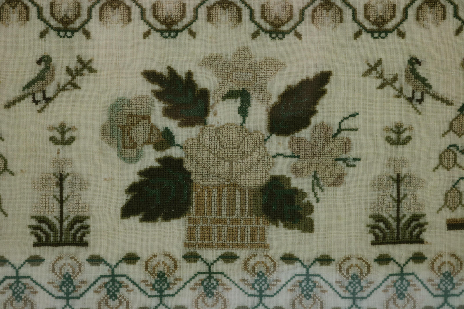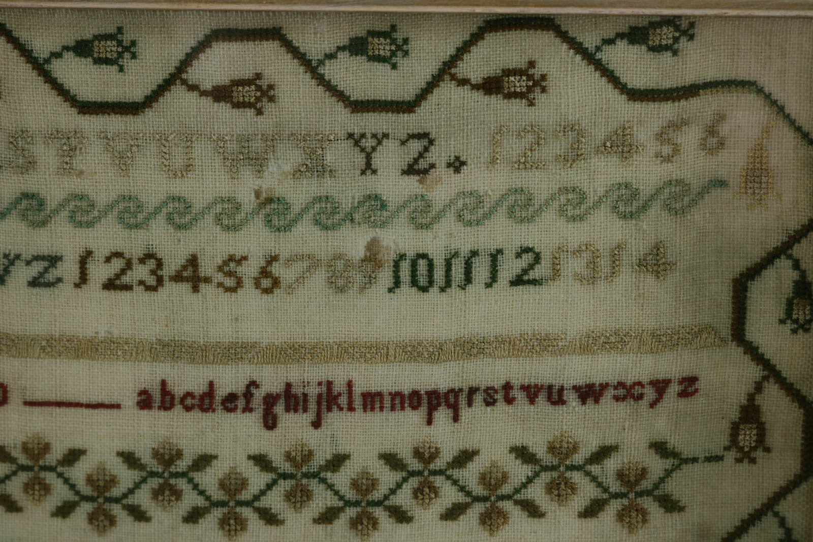 The sampler is worked in silk on linen ground, in a variety of very fine stitches. Meandering floral border and dividing lines.