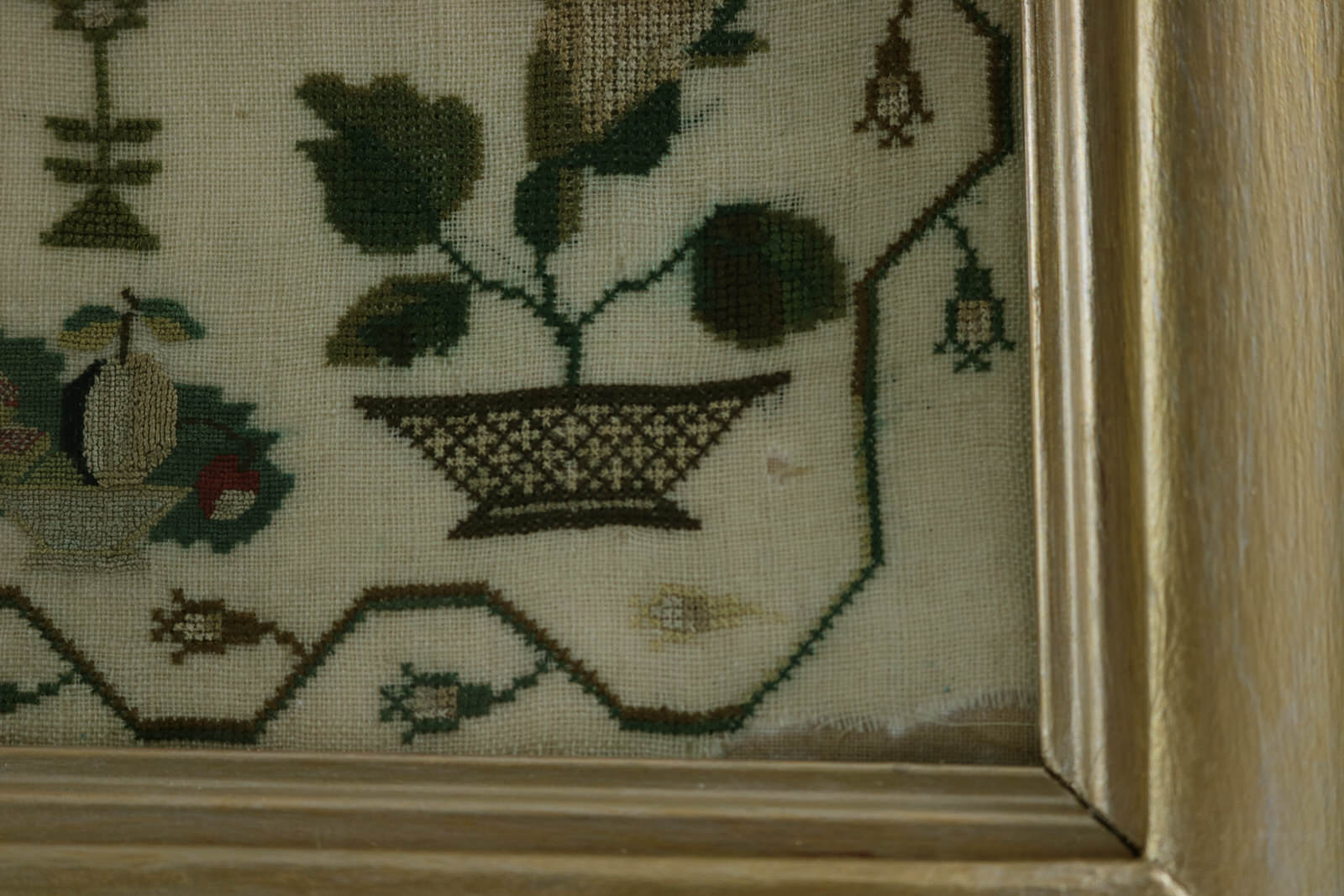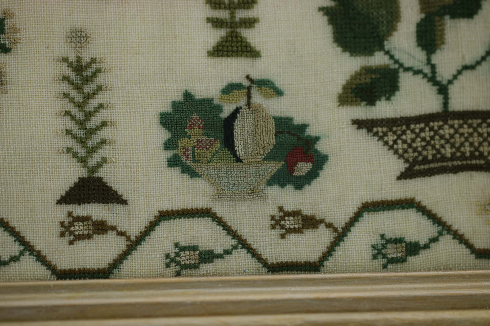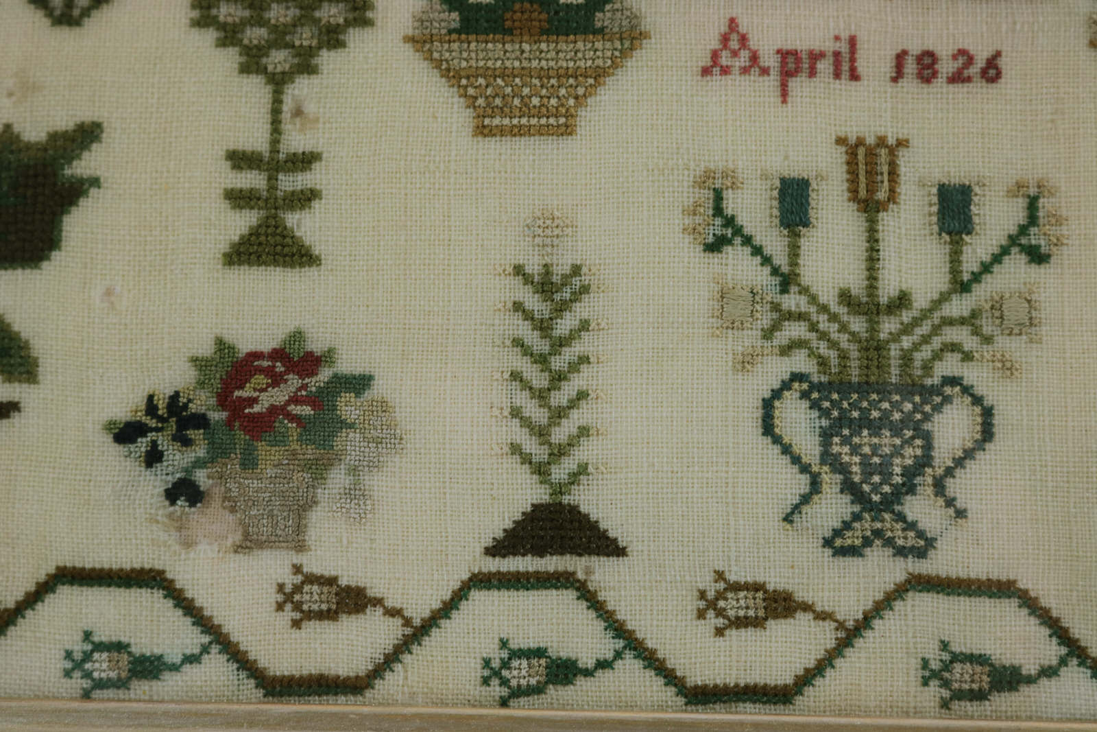 Rippled and dimpled old glass. Mounting: The sampler is stitched to acid-free mountboard. Frame backed with wood panel and brown paper and sealed with +85 tape.