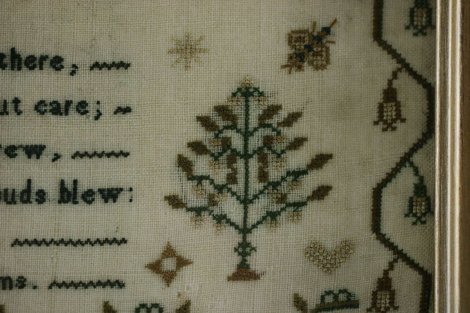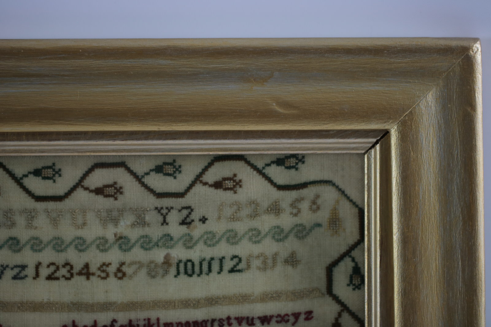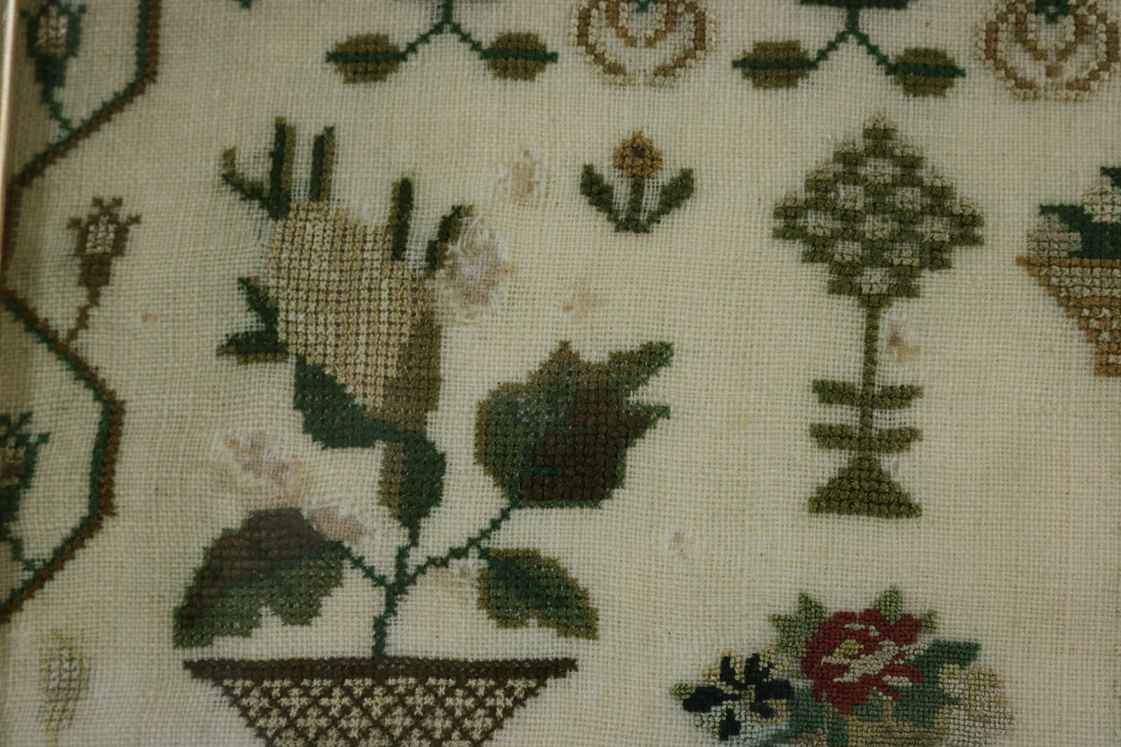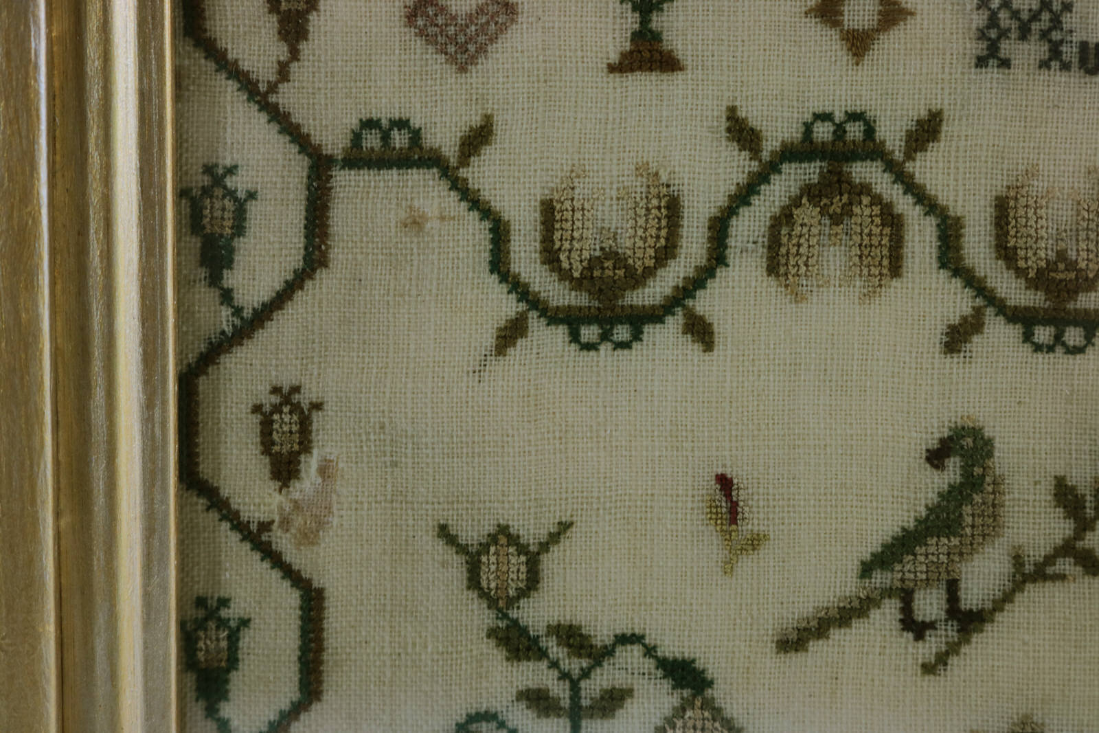 Rippled and dimpled old glass. Mounting: The sampler is stitched to acid-free mountboard. Frame backed with wood panel and brown paper and sealed with +85 tape.