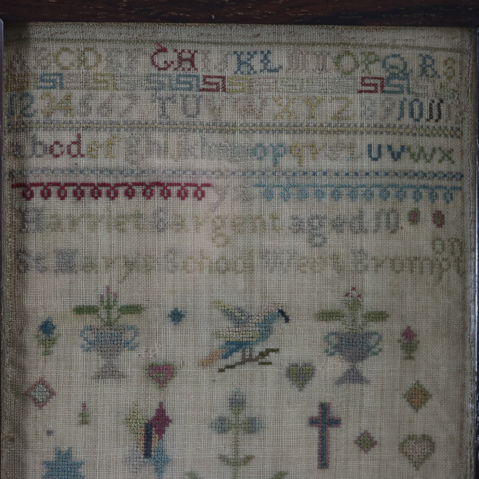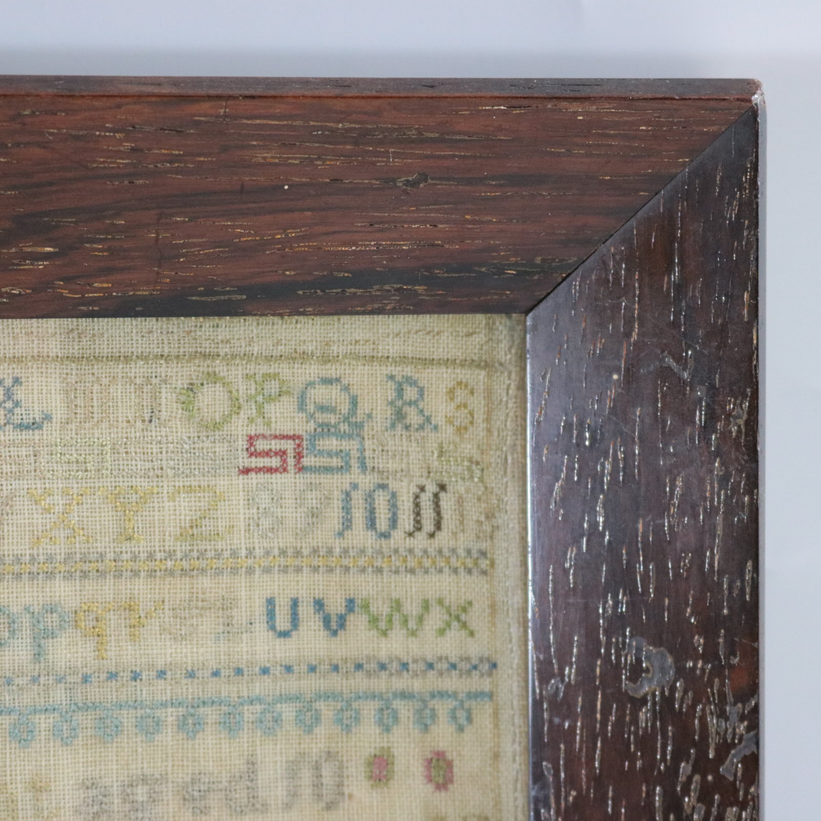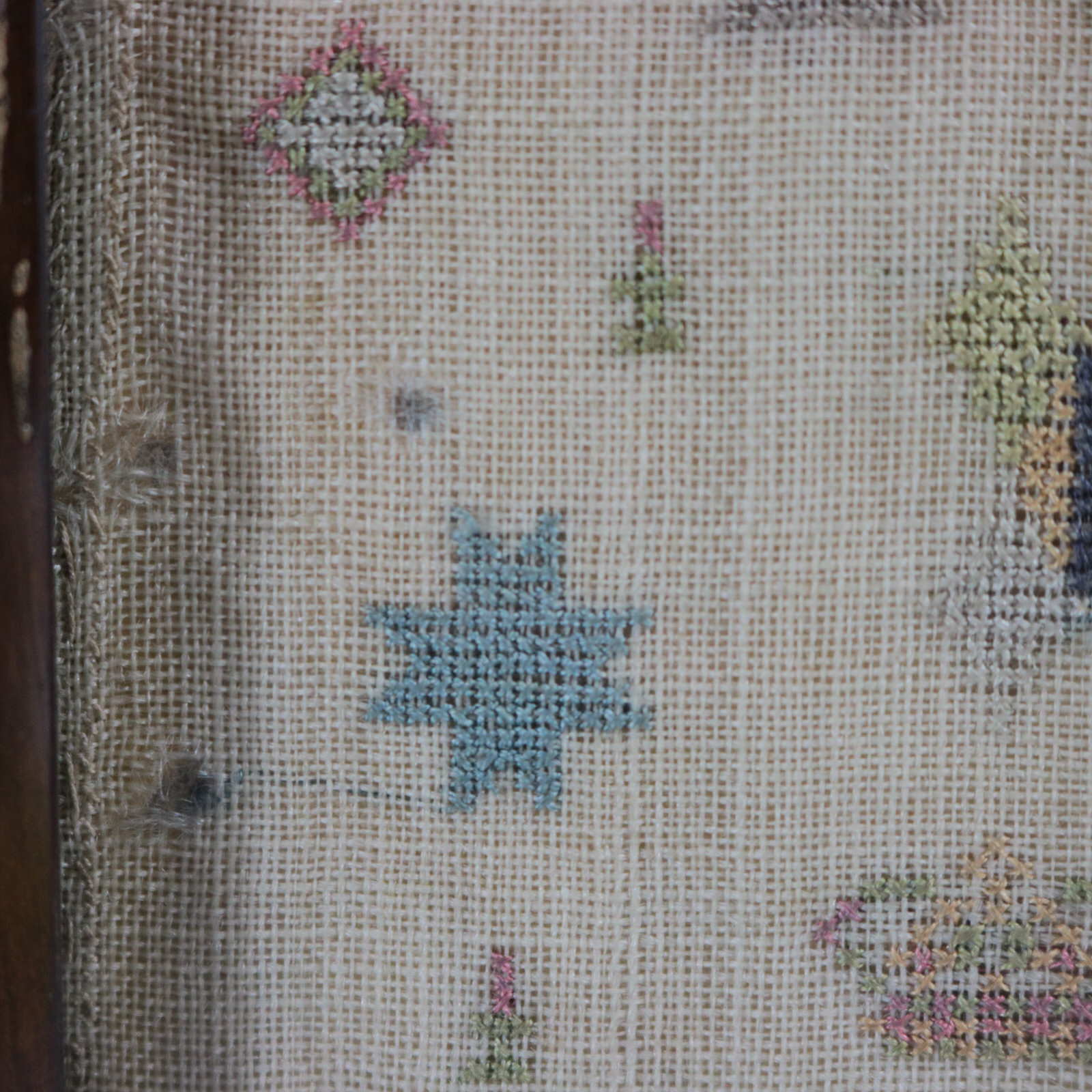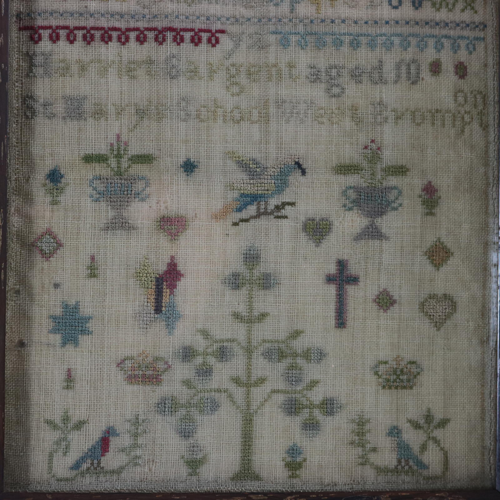 Mounting: The sampler is fixed to a wooden board. Frame backed with wood and sealed with tape.