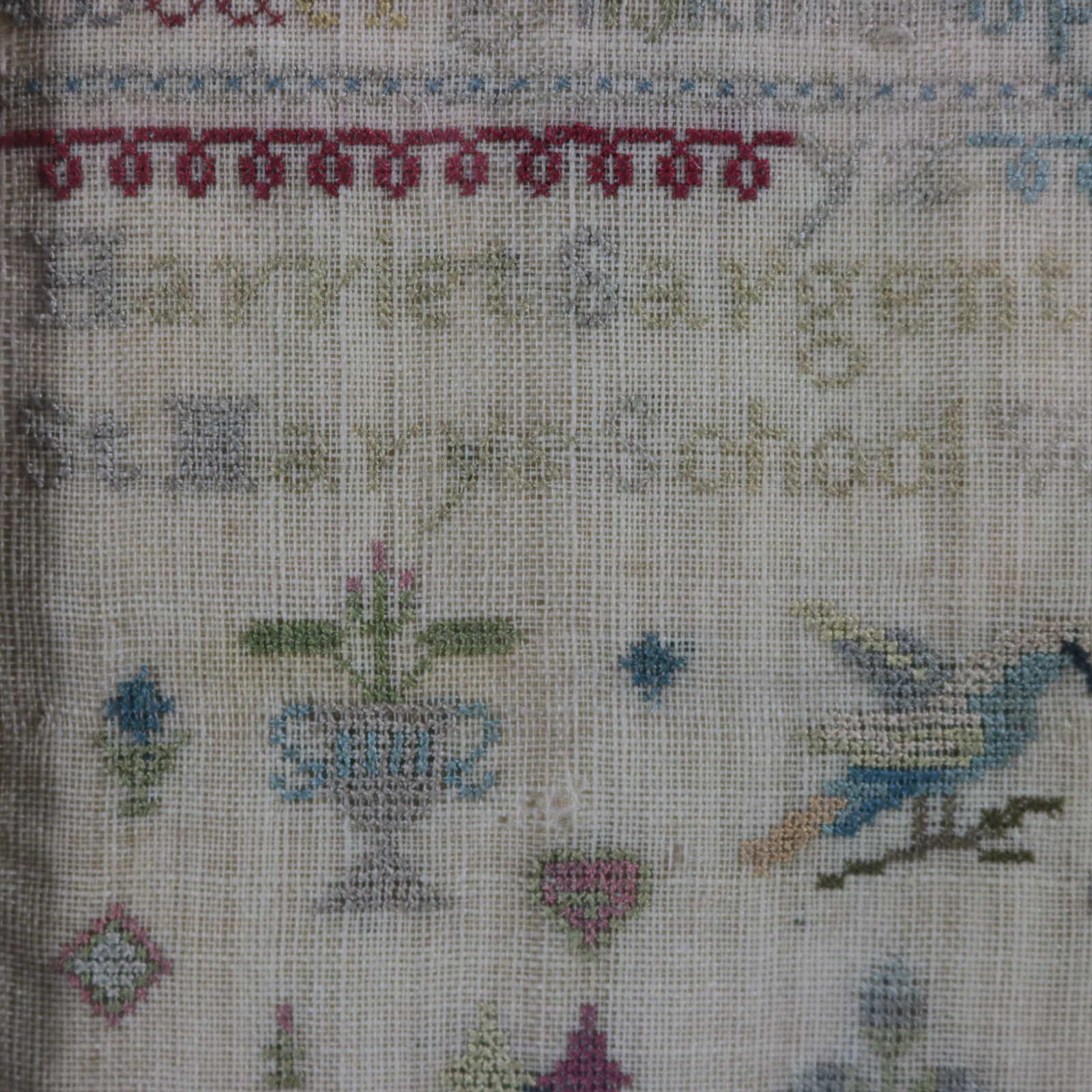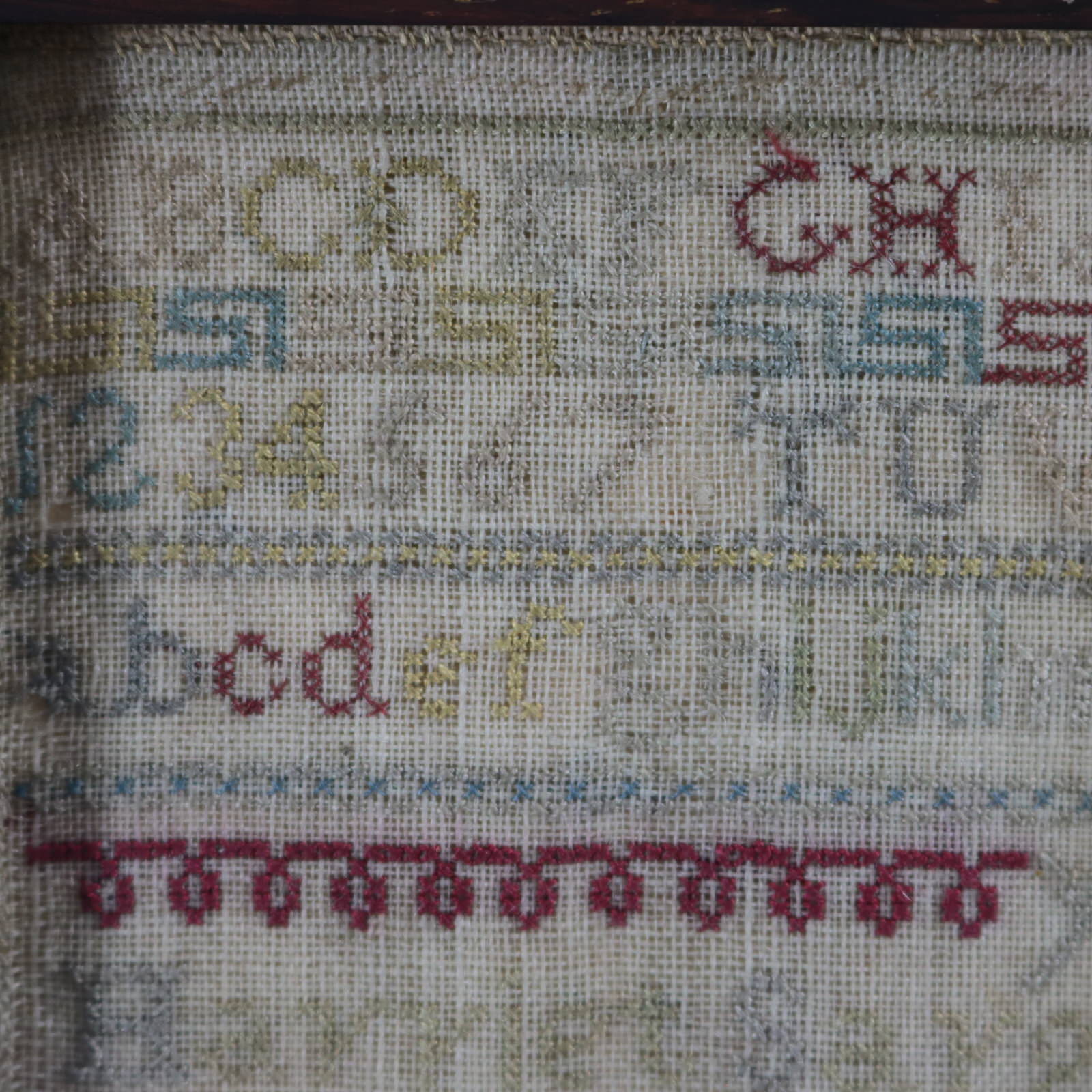 The sampler is worked in silk on linen ground, in cross stitch throughout. Simple line border. Colours red, gold, pink, blue and green. Alphabets A-Z in upper case and lower case and numbers 1-12.