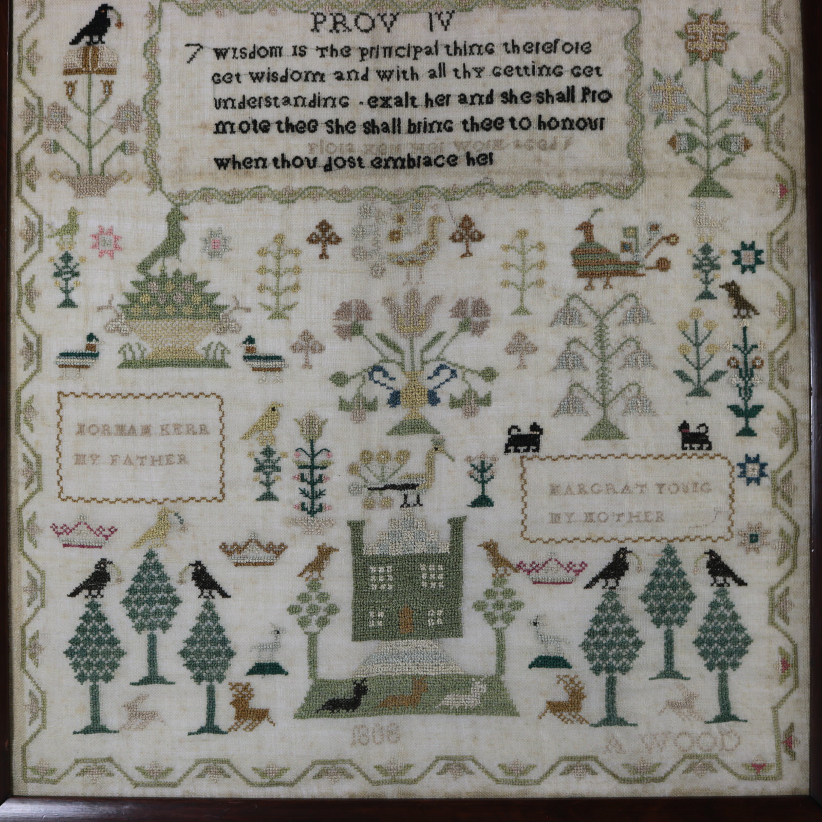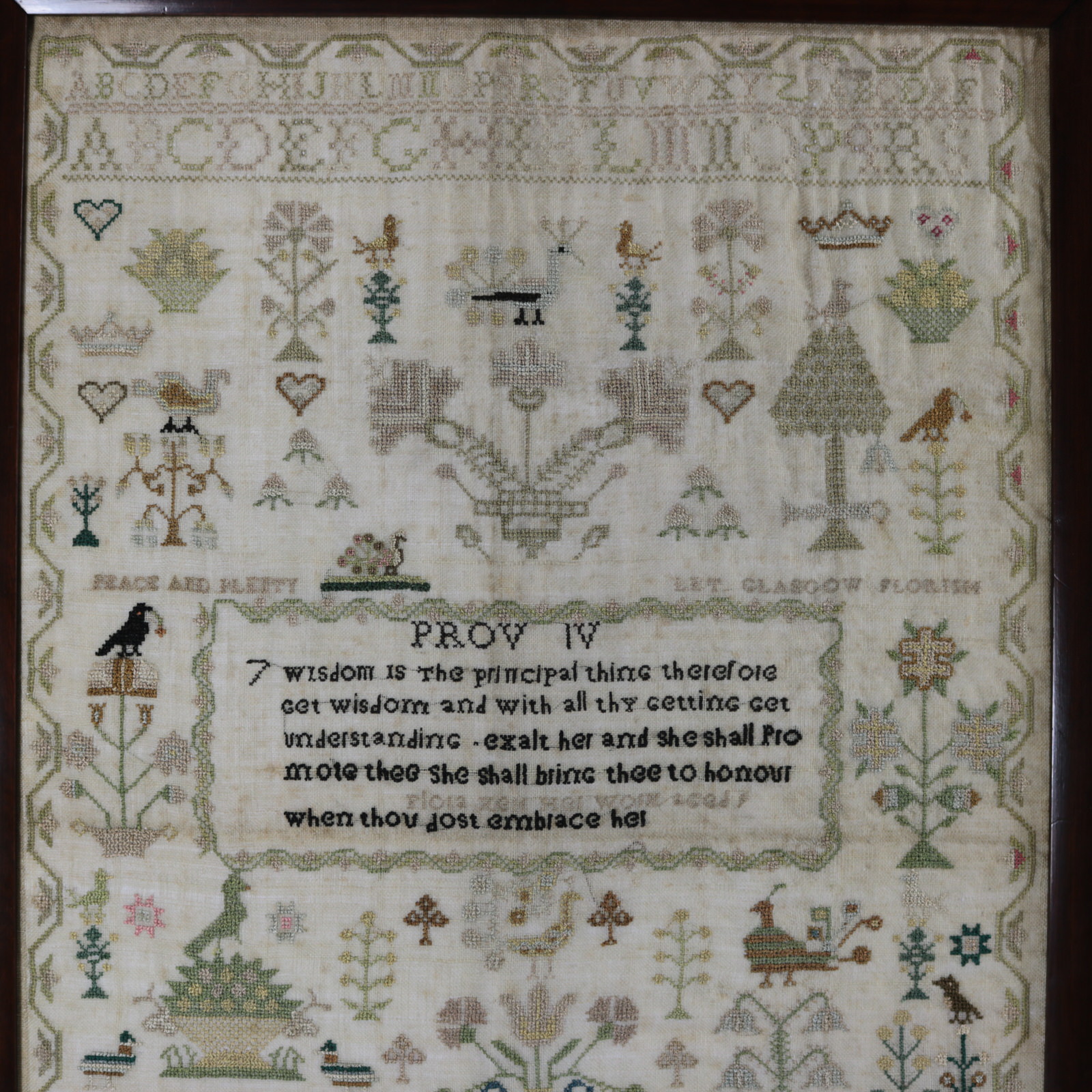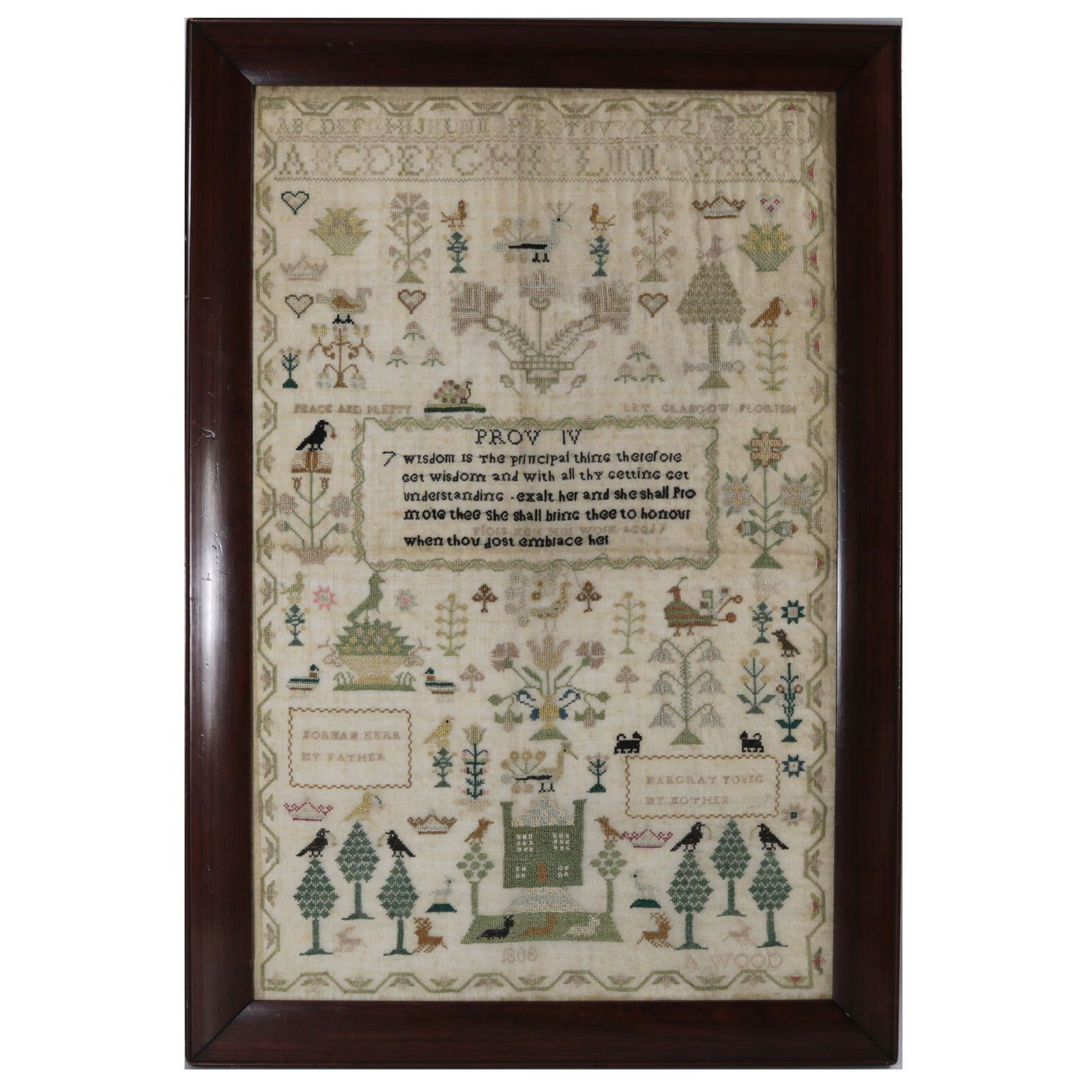 Other text includes, 'Peace and Plenty', 'Let Glasgow Florish' and the names of the stitcher's parents, 'Norman Kerr My Father' and 'Margrat Young My Mother'.