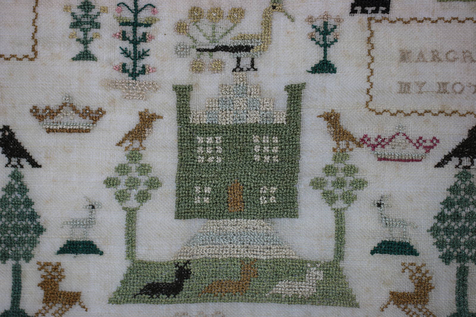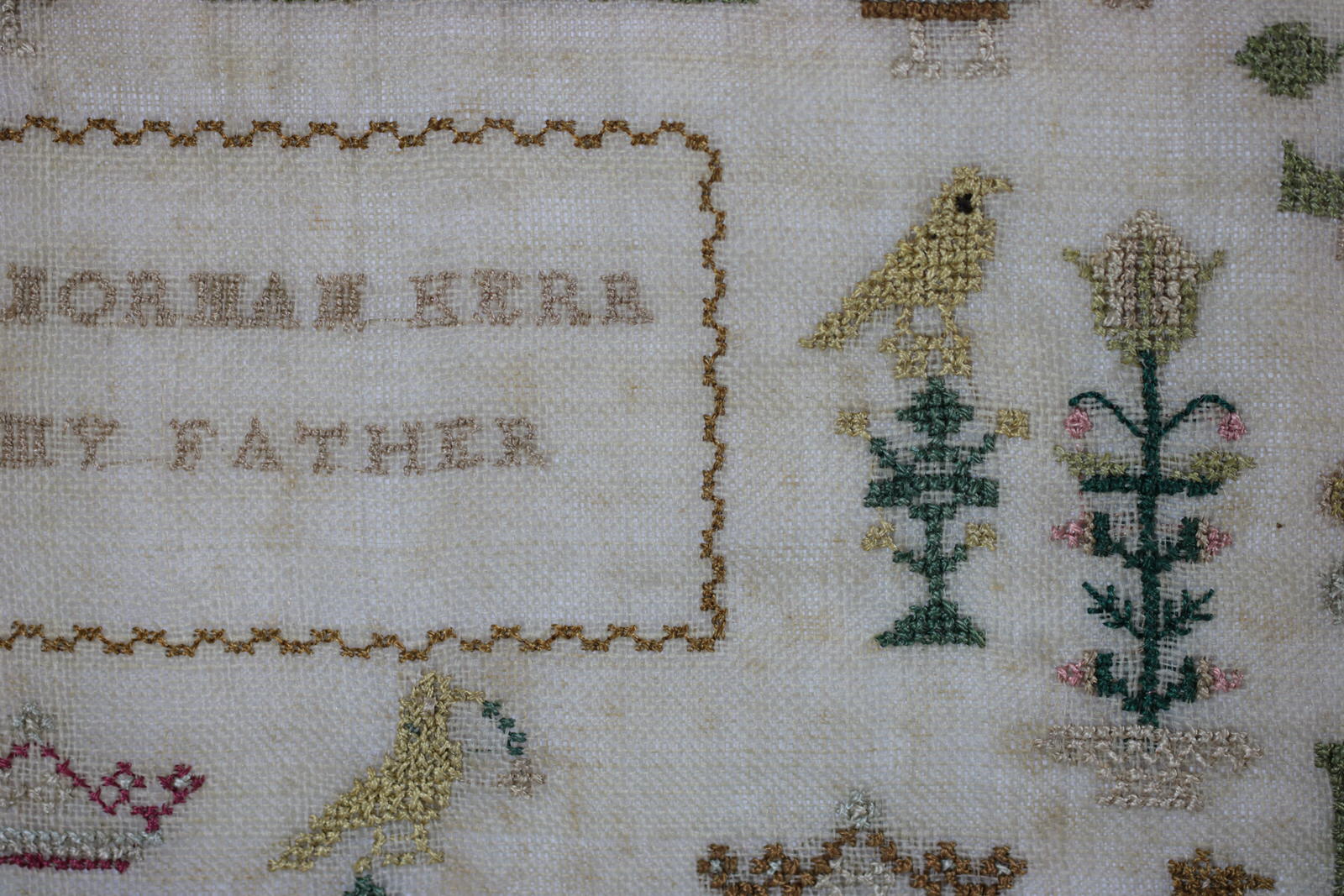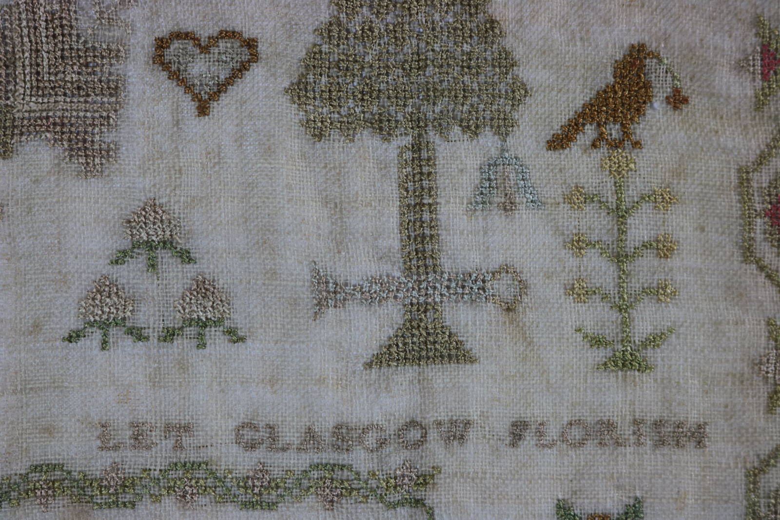 Other text includes, 'Peace and Plenty', 'Let Glasgow Florish' and the names of the stitcher's parents, 'Norman Kerr My Father' and 'Margrat Young My Mother'.