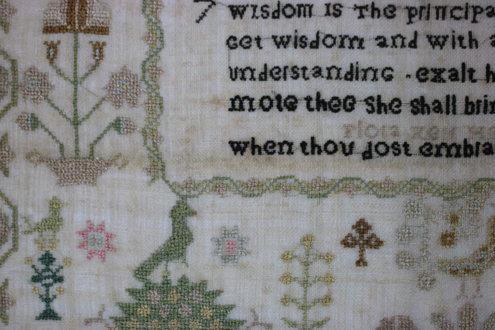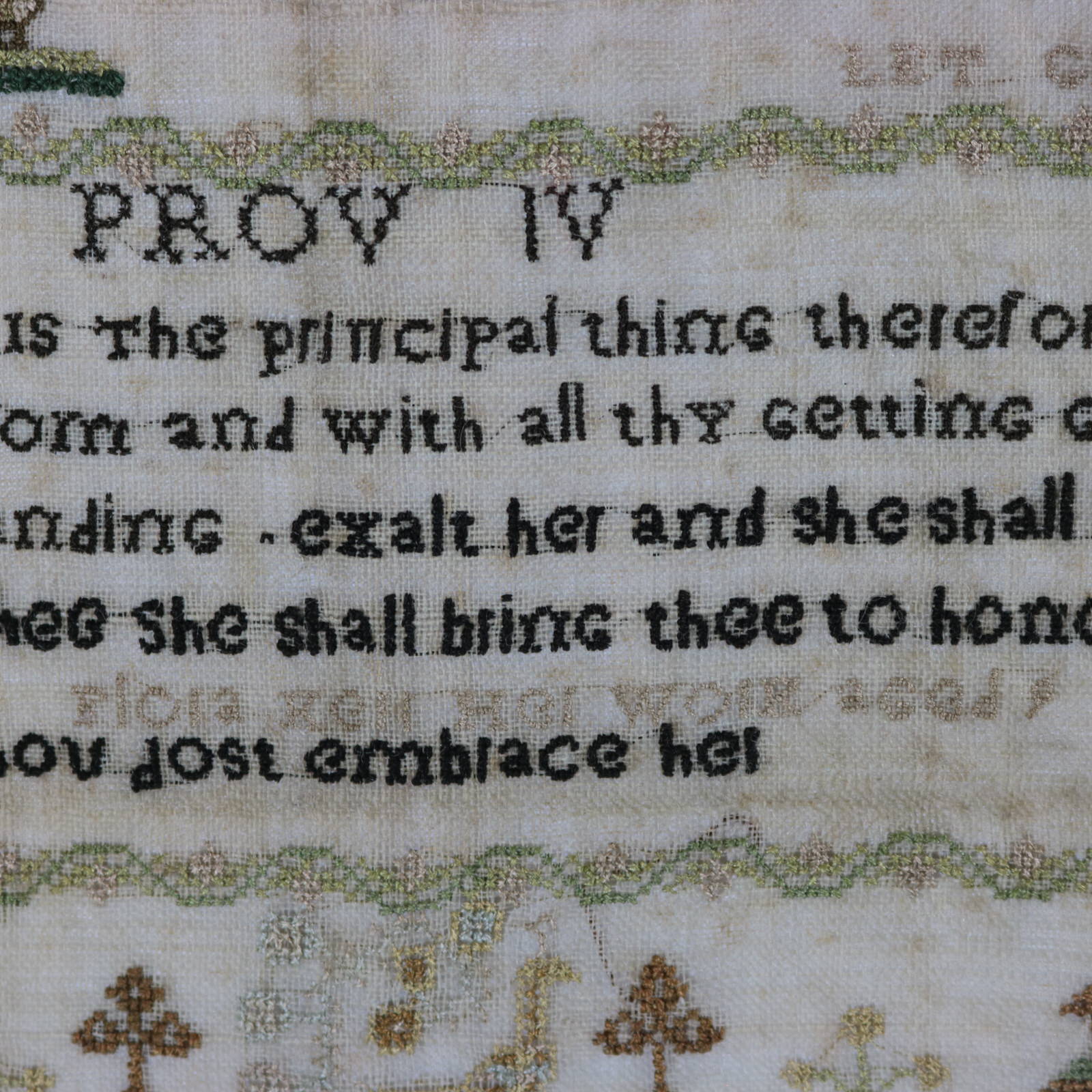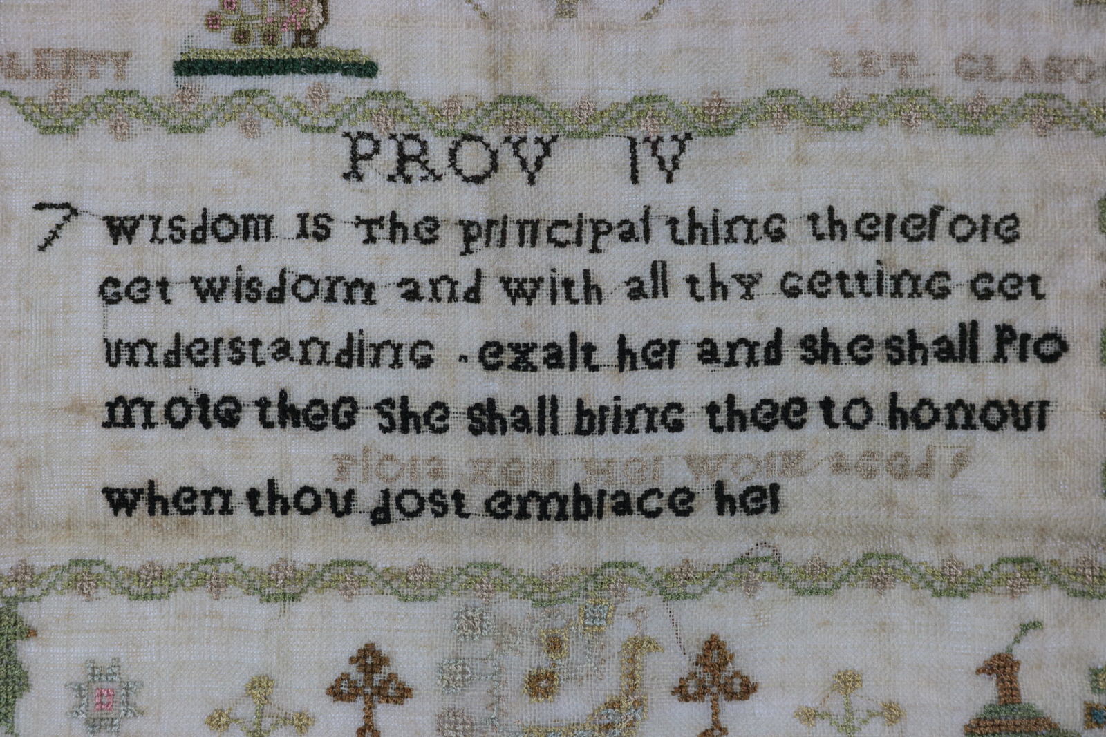Verse entitled 'PROV IV' reads, '7 Wisdom is The principal thing therefore > Get wisdom and with all thy getting get > understanding. Exalt her and she shall promote thee She shall bring thee to honour > when though dost embrace her.'.