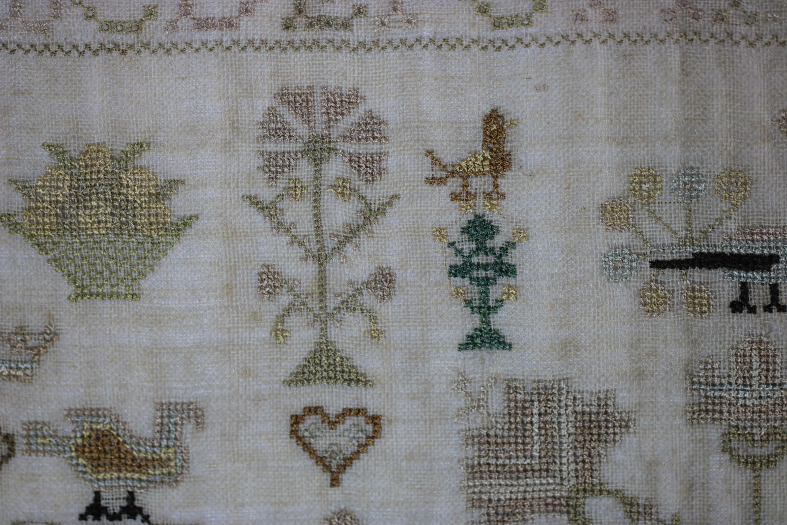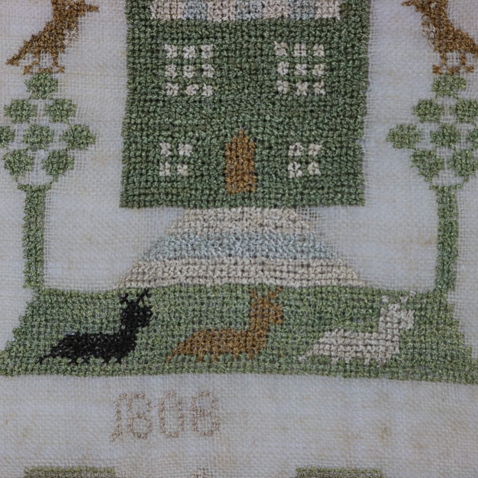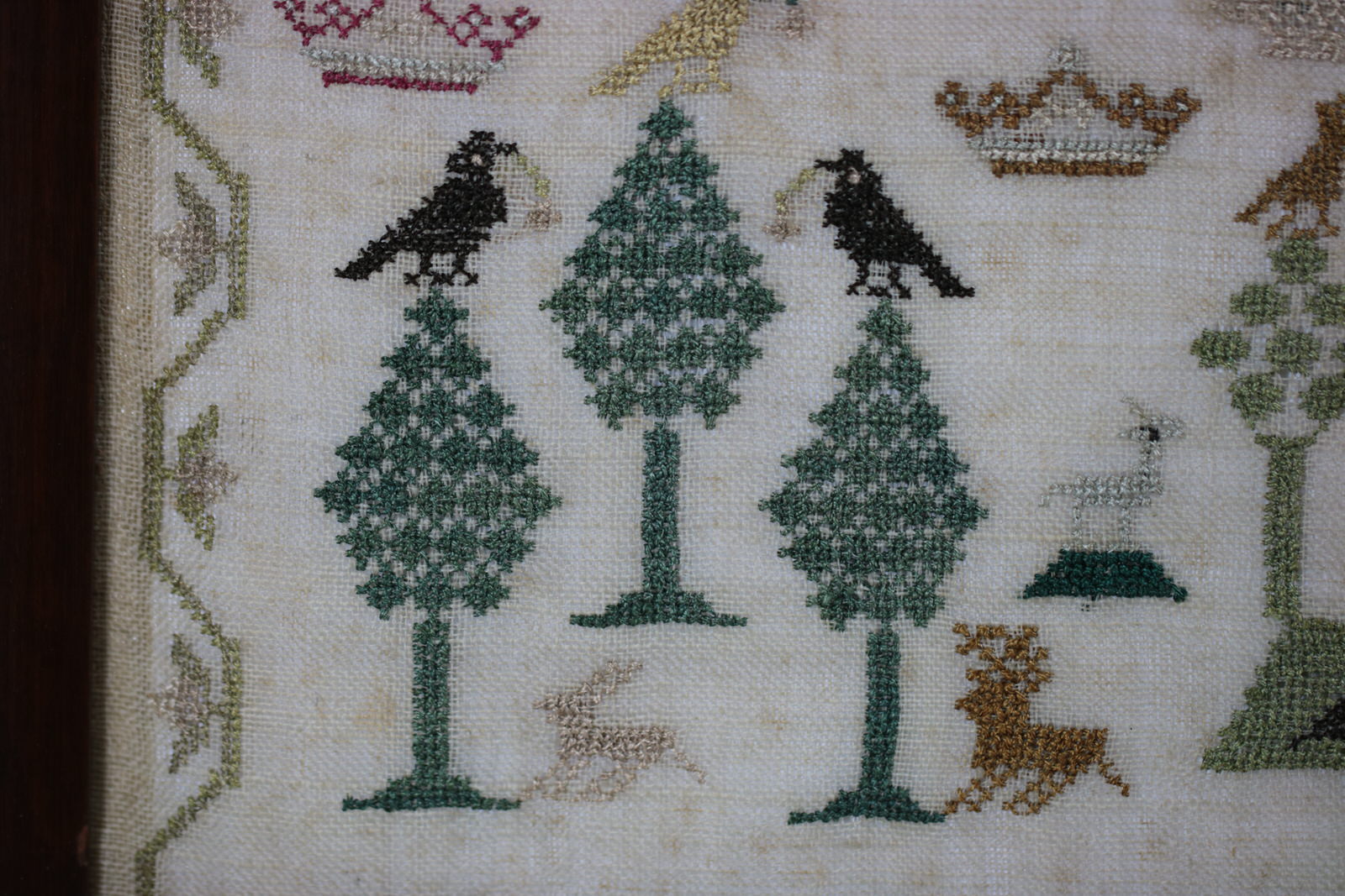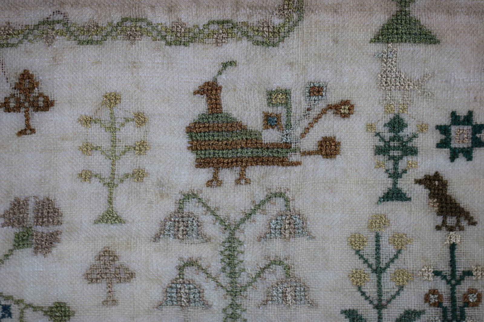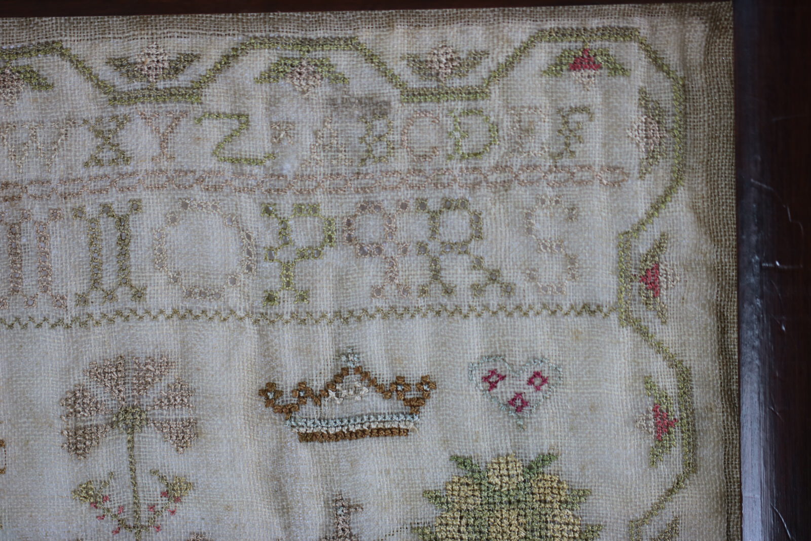 The sampler is worked in silk on linen ground, in cross stitch and Algerian eye. Meandering strawberry border.