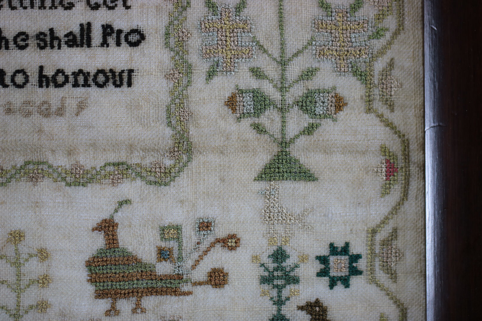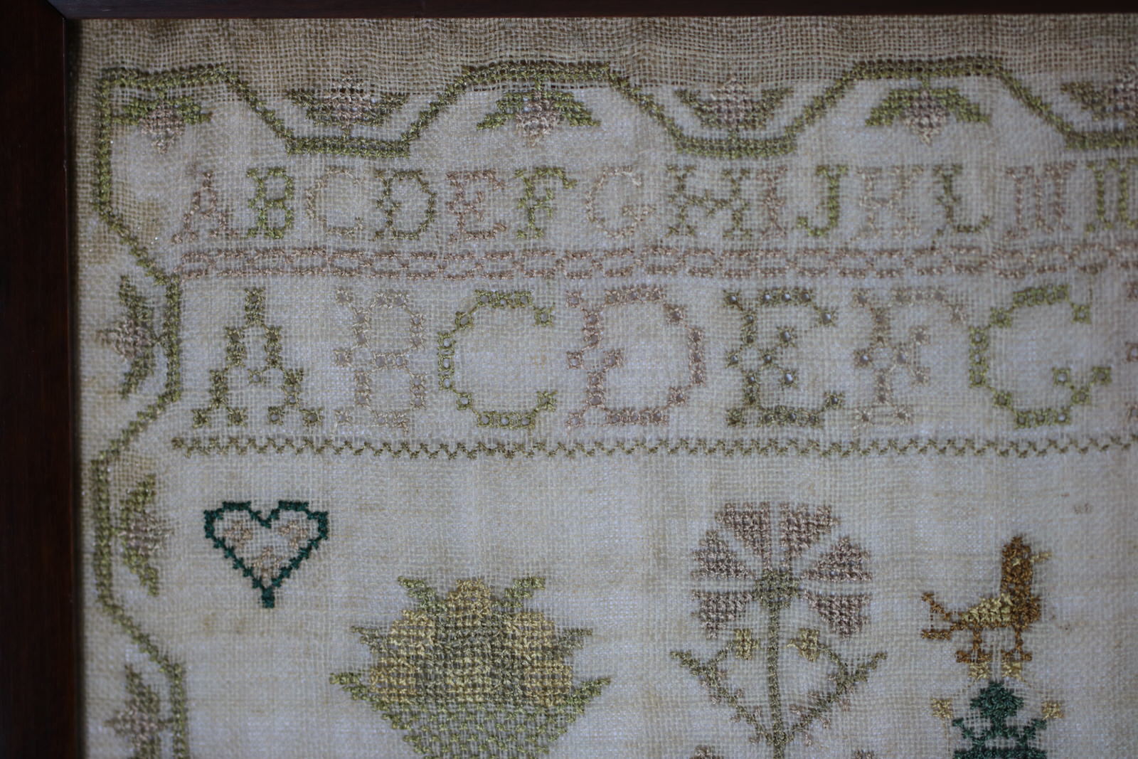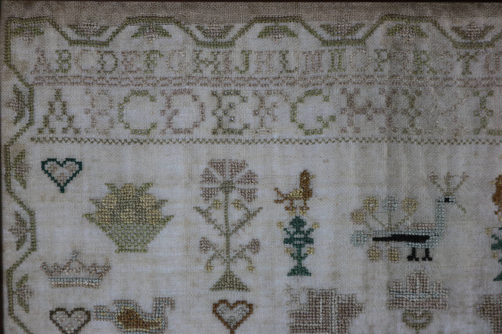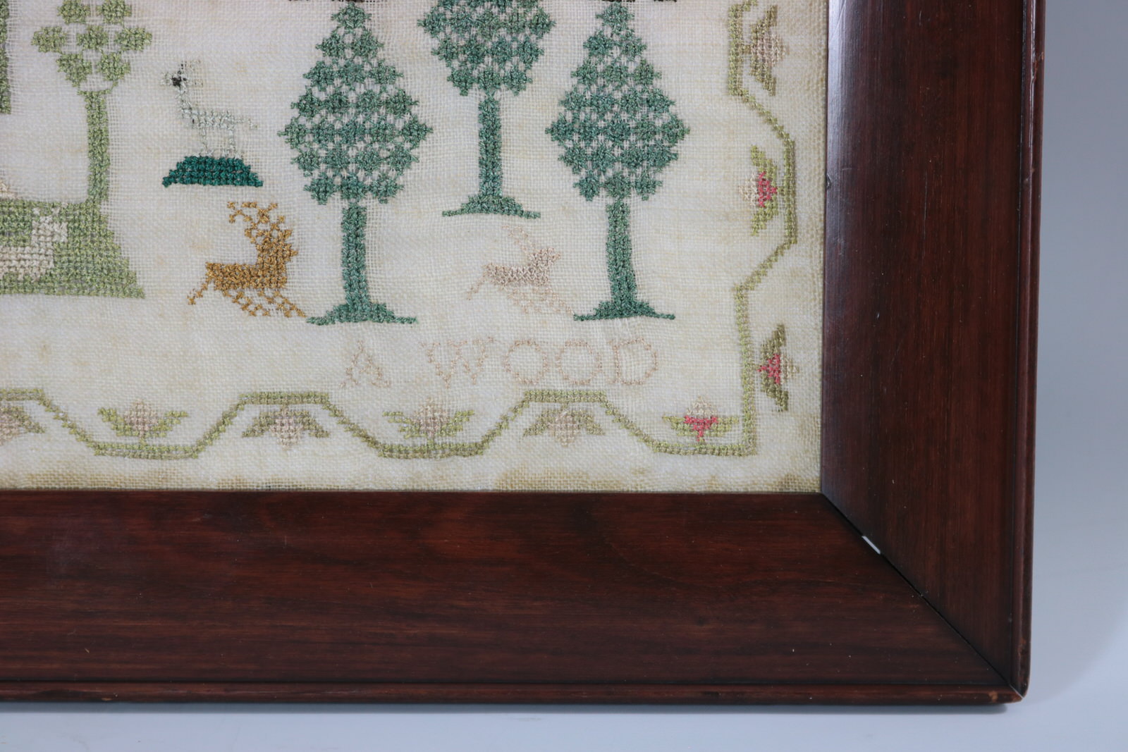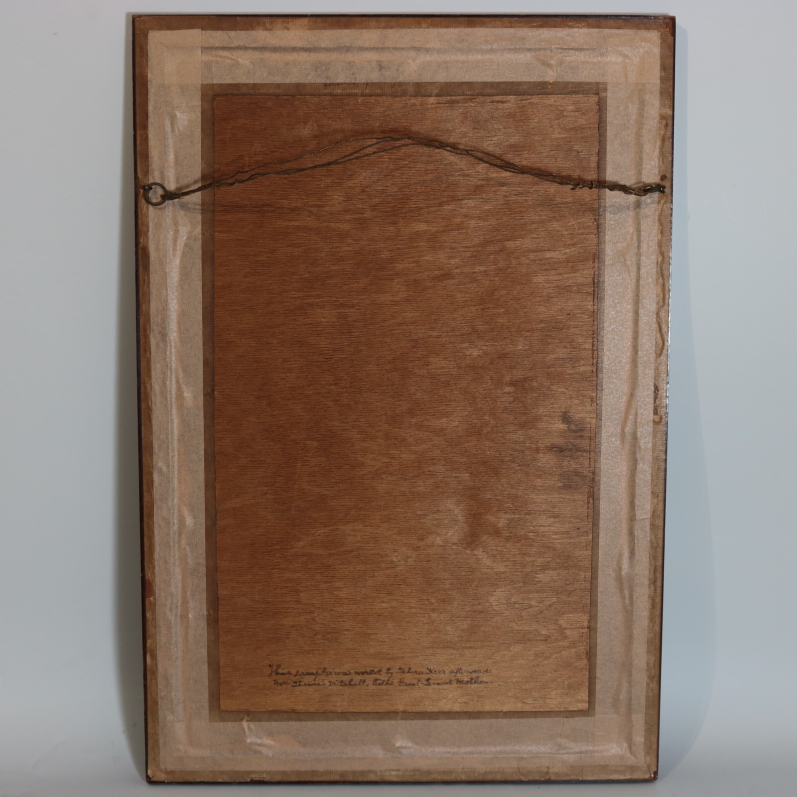 Mounting: The sampler is glued around the outer edges only, to a board. The sampler can be removed from the board, if required. Frame backed with wood and sealed with tape.