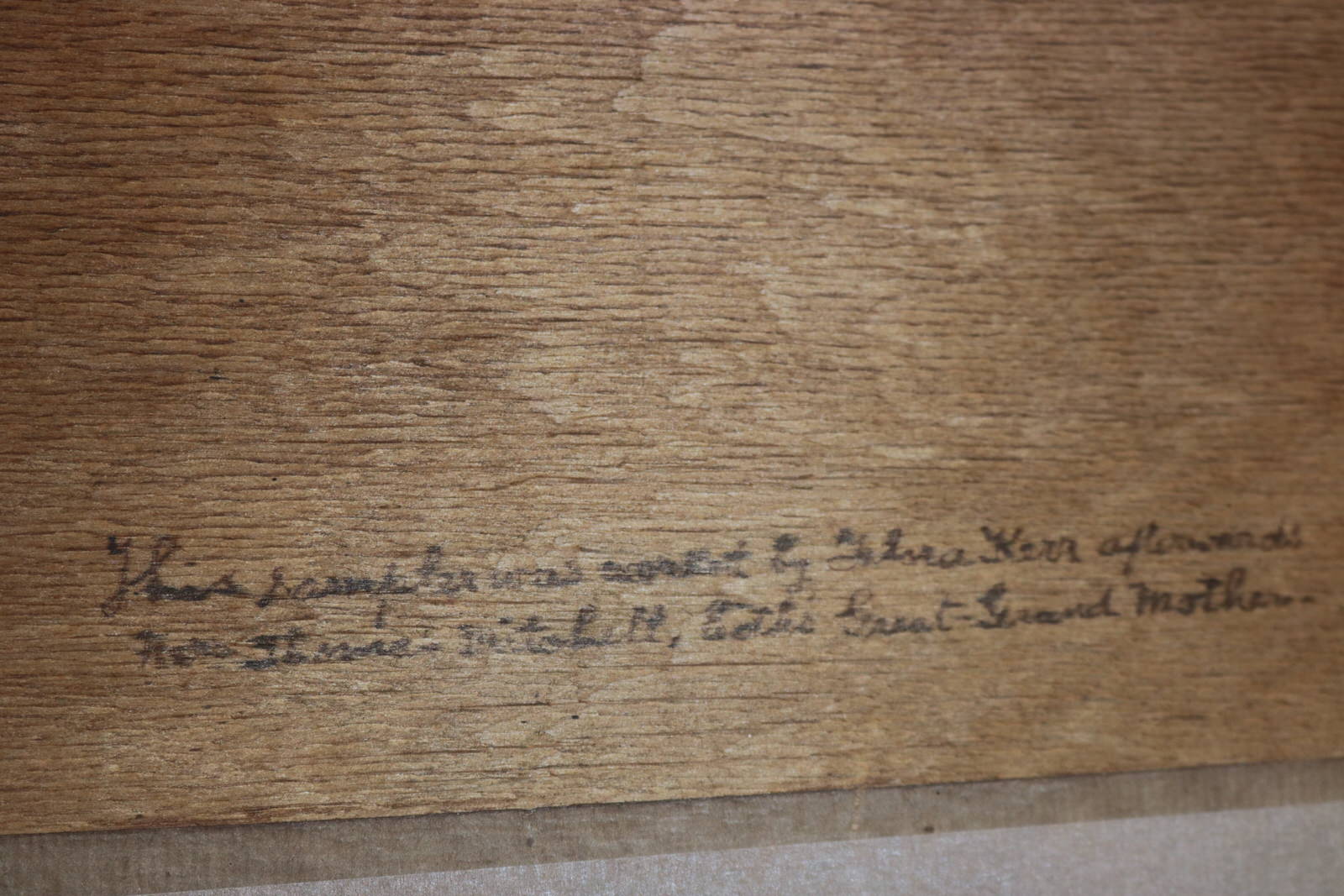Framed in an old wood frame with rippled, old glass.