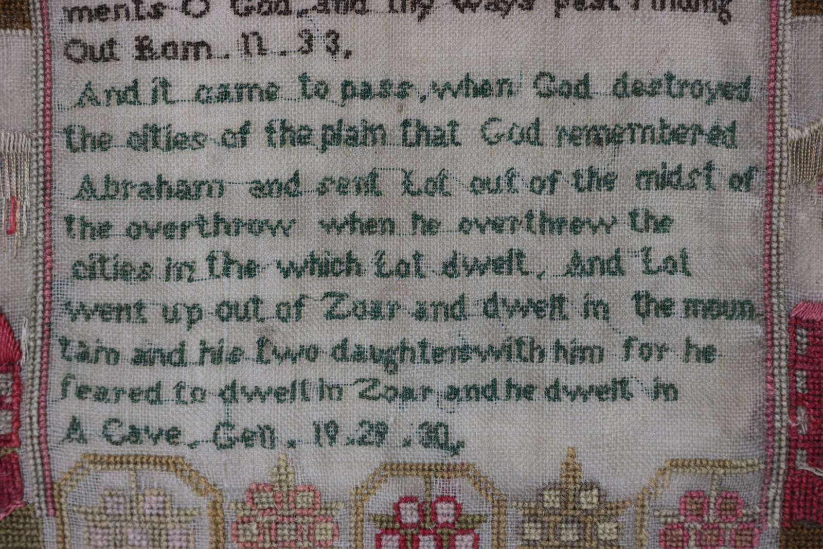 A good set of motifs. Five main panels to the middle. The first with a man and two girls (presumably Lot and two daughters).