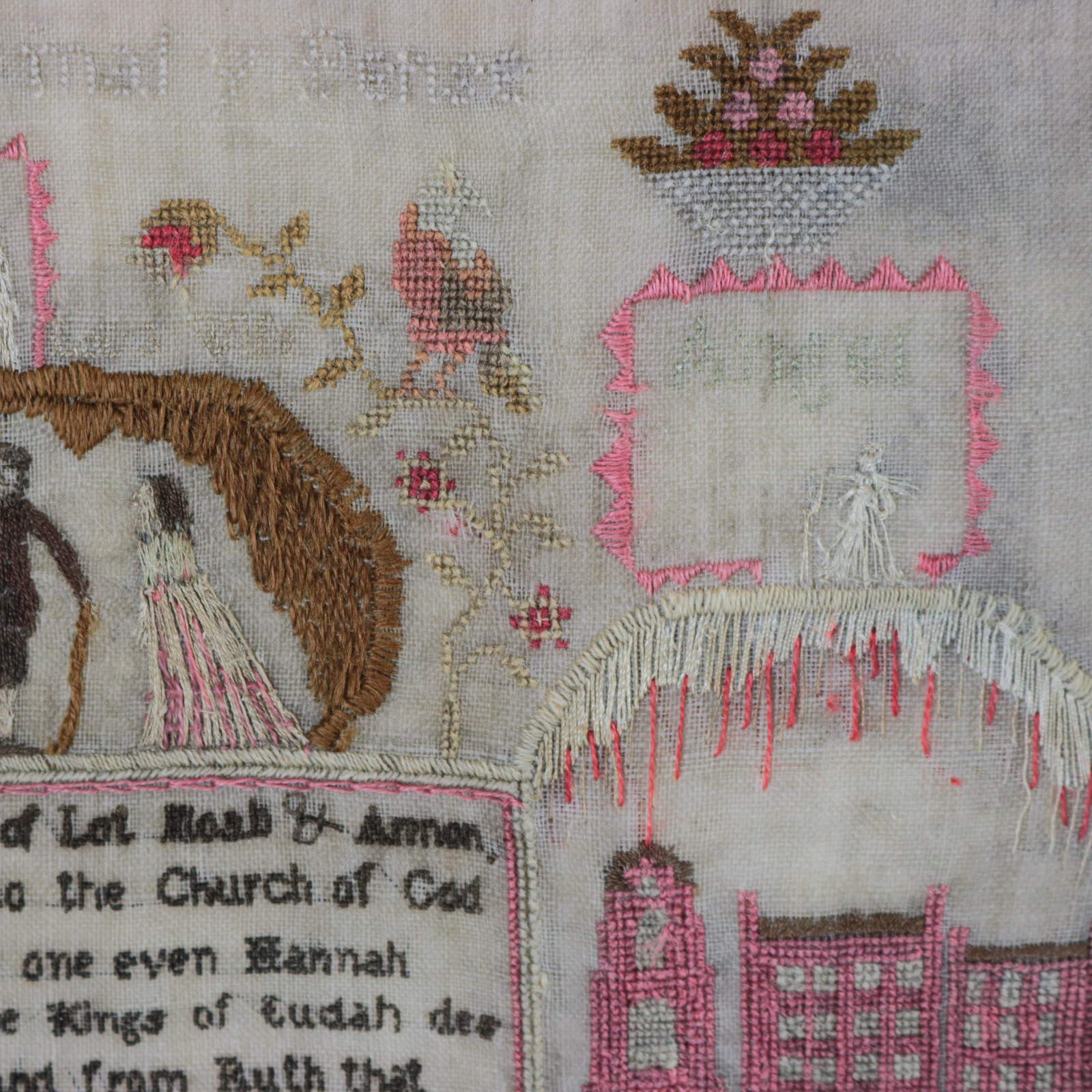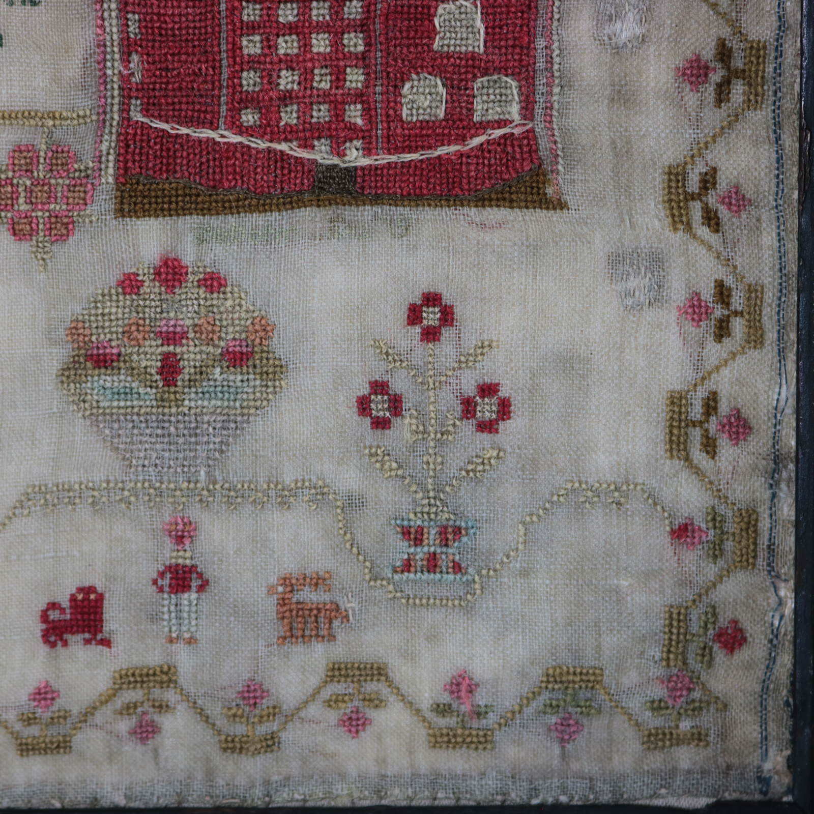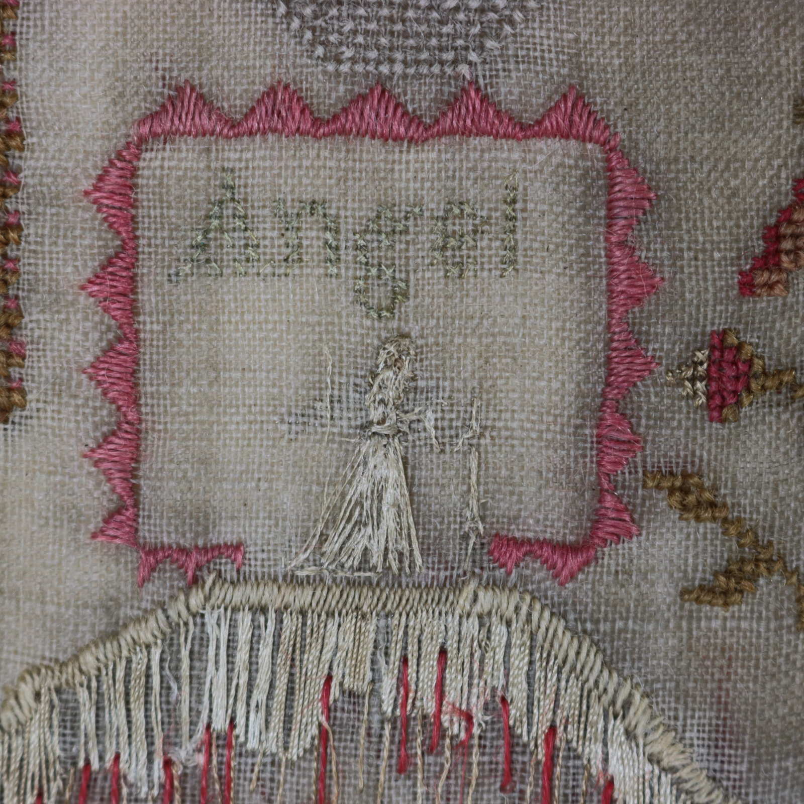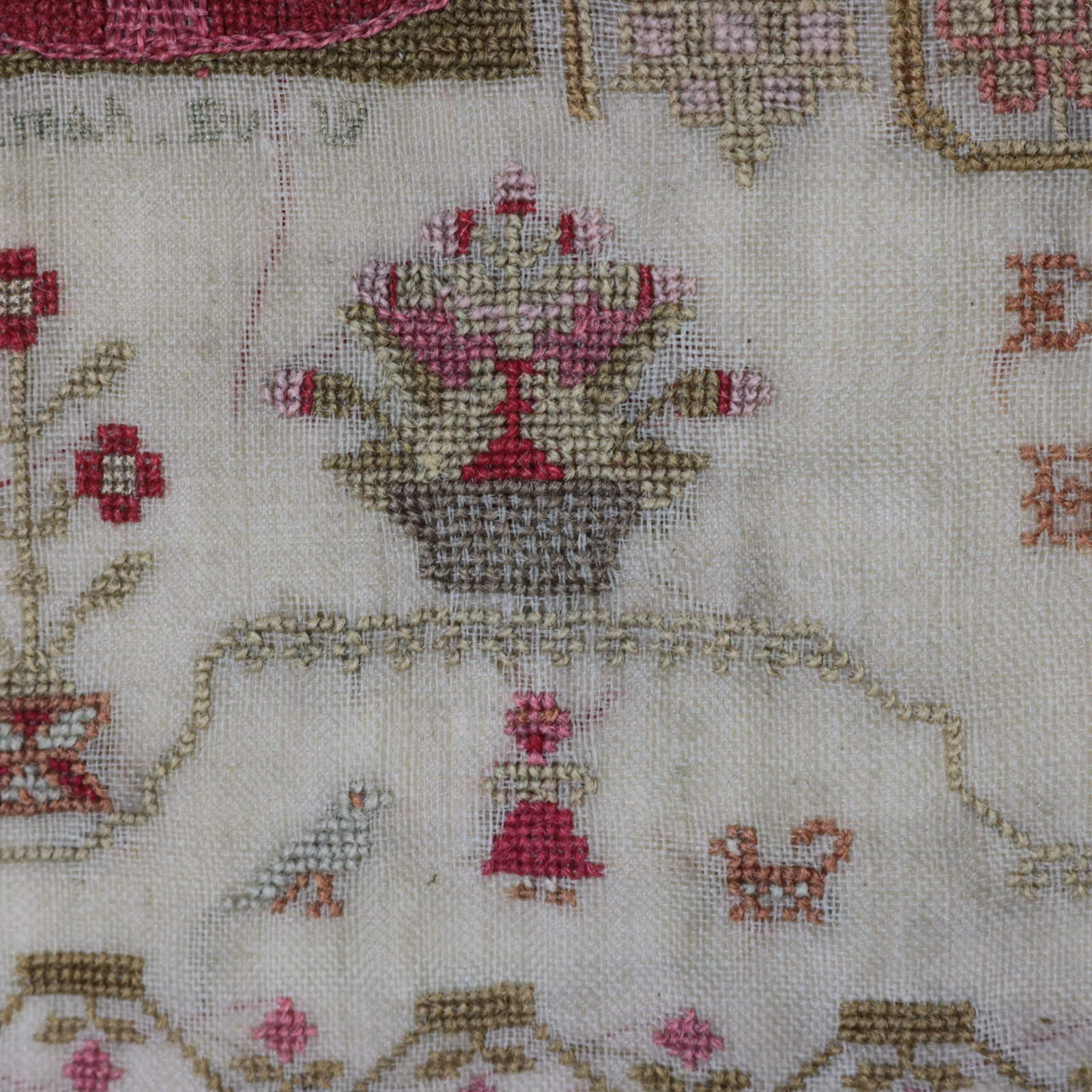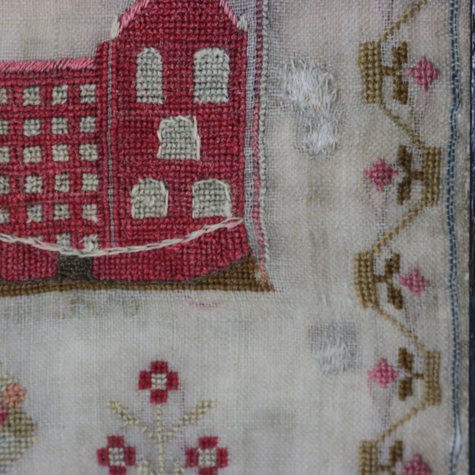The sampler is worked in wool and silk on linen ground, in a variety of stitches.