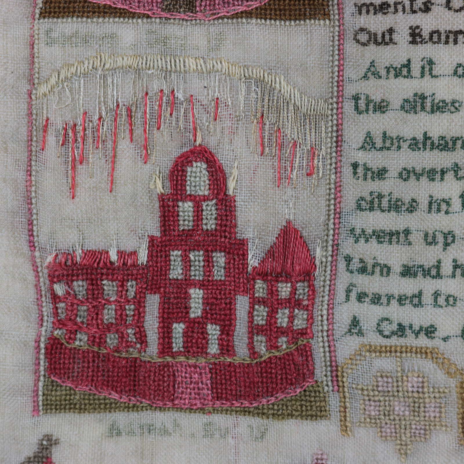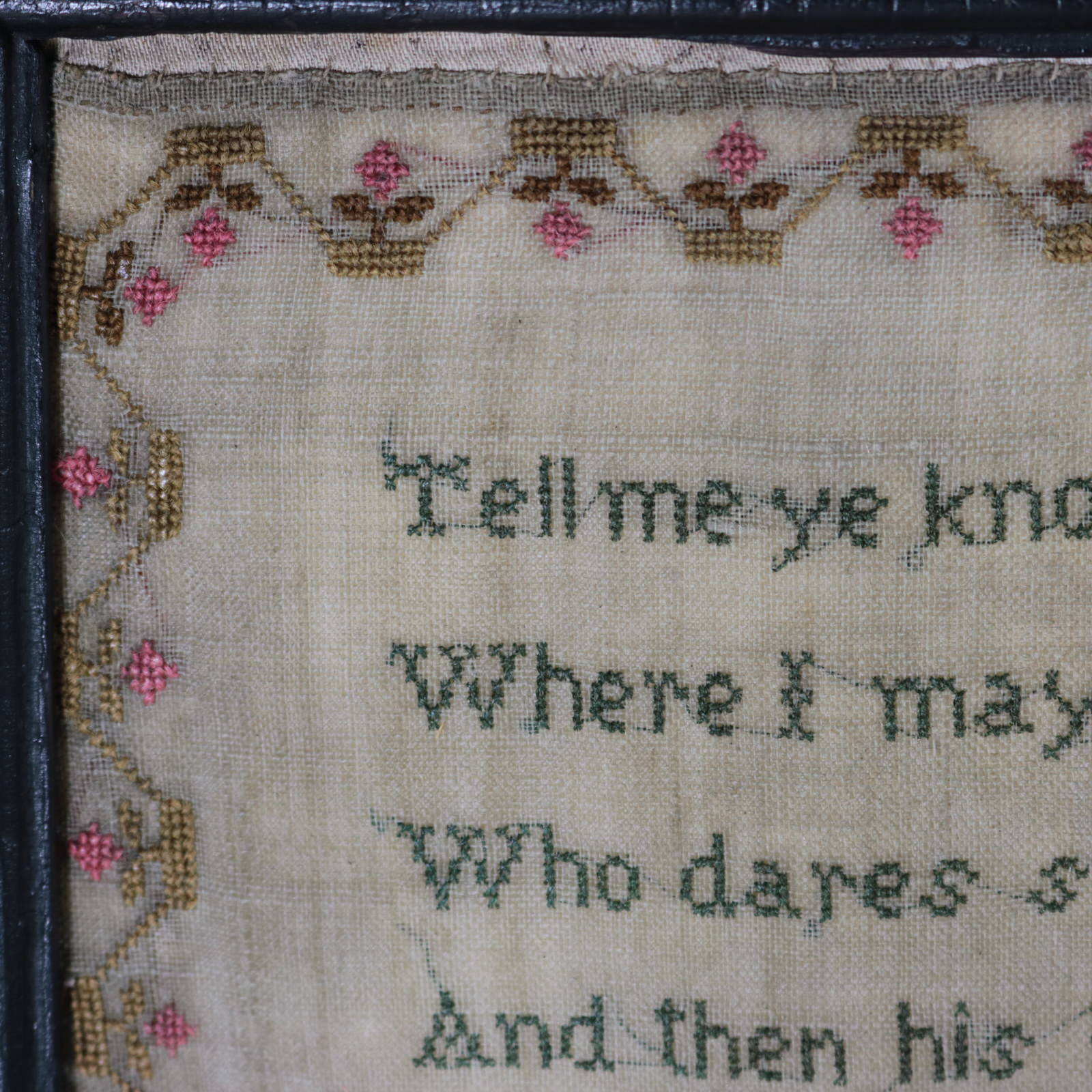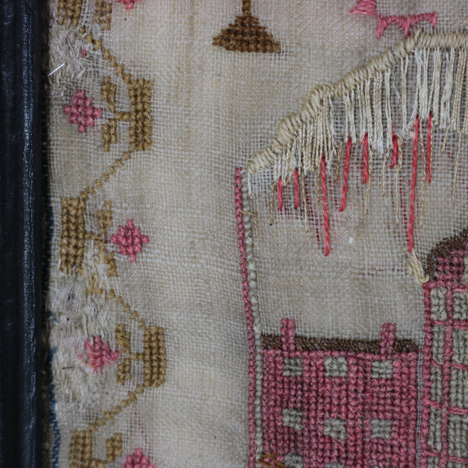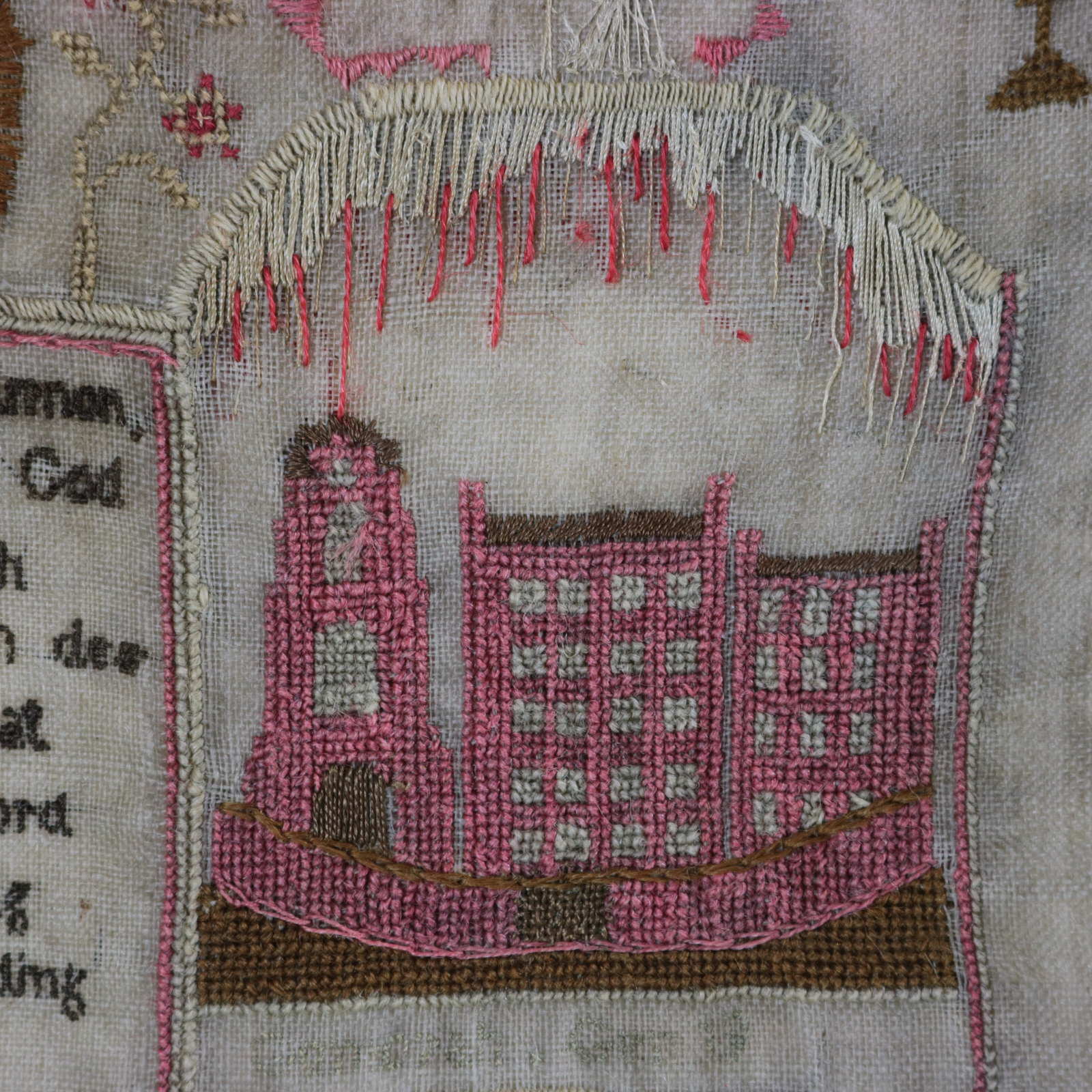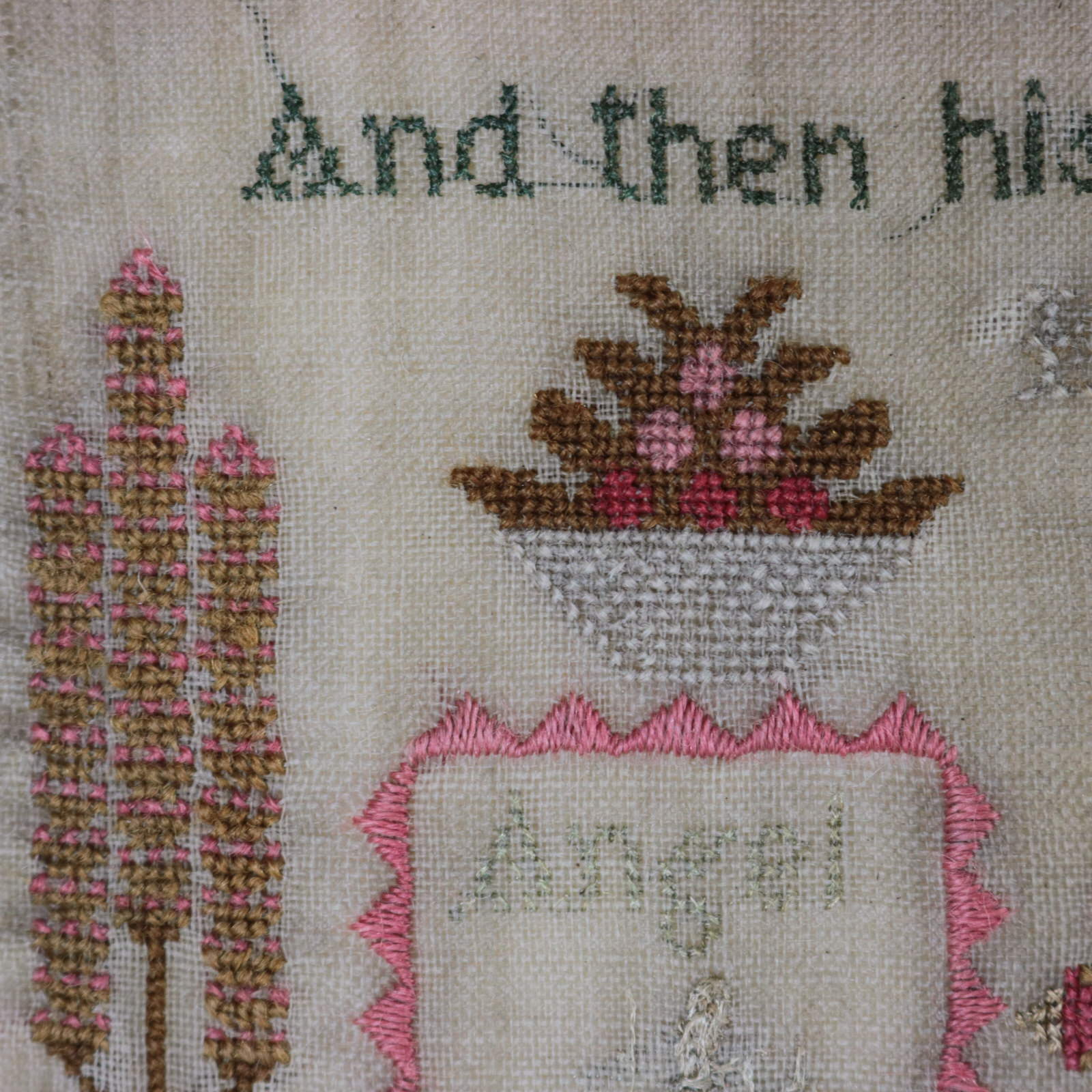 The sampler is worked in wool and silk on linen ground, in a variety of stitches.