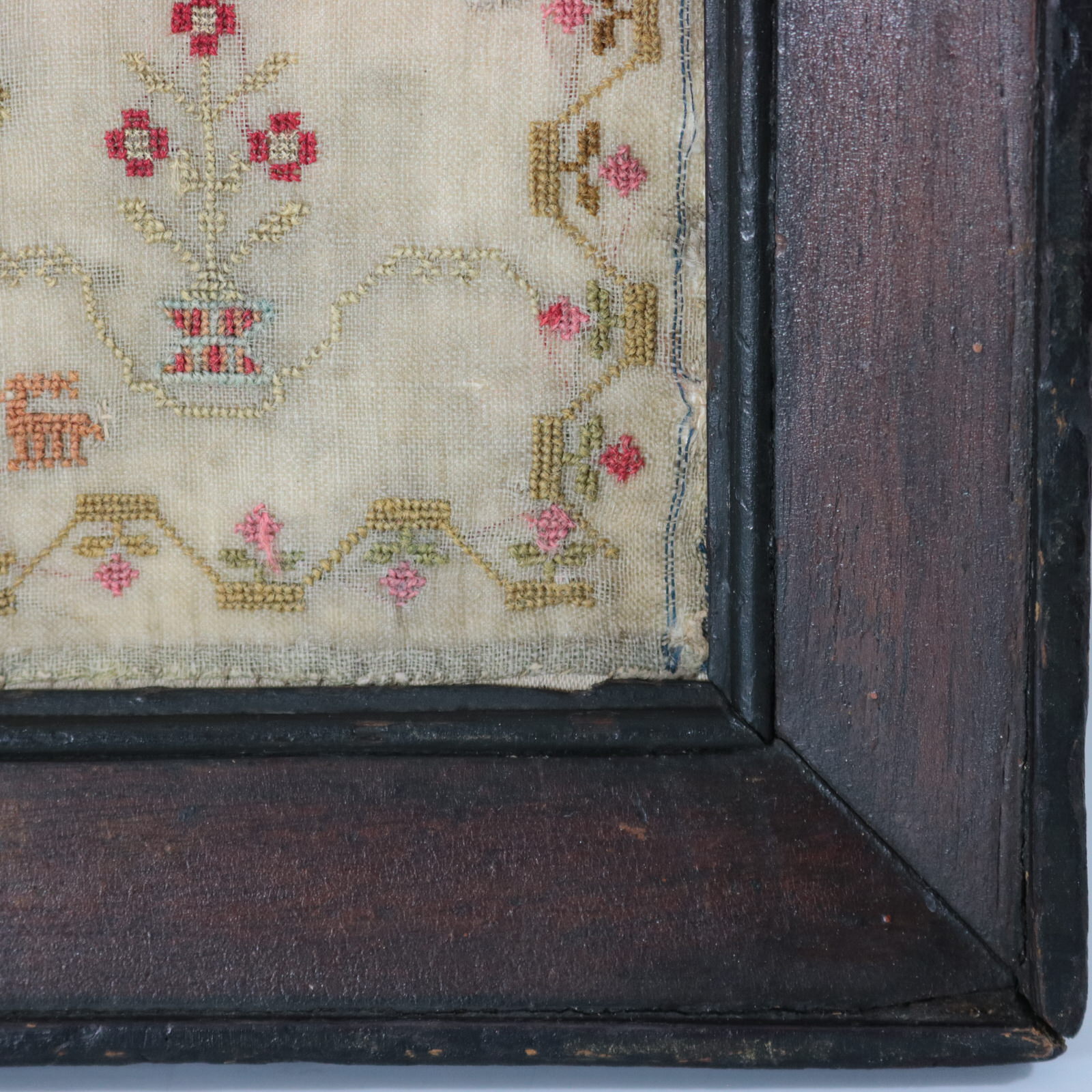 Mounting: The sampler is stitched to calico and stretched over acid free board and stuck on the reverse(easily removed). Frame backed with cardboard and sealed with tape.