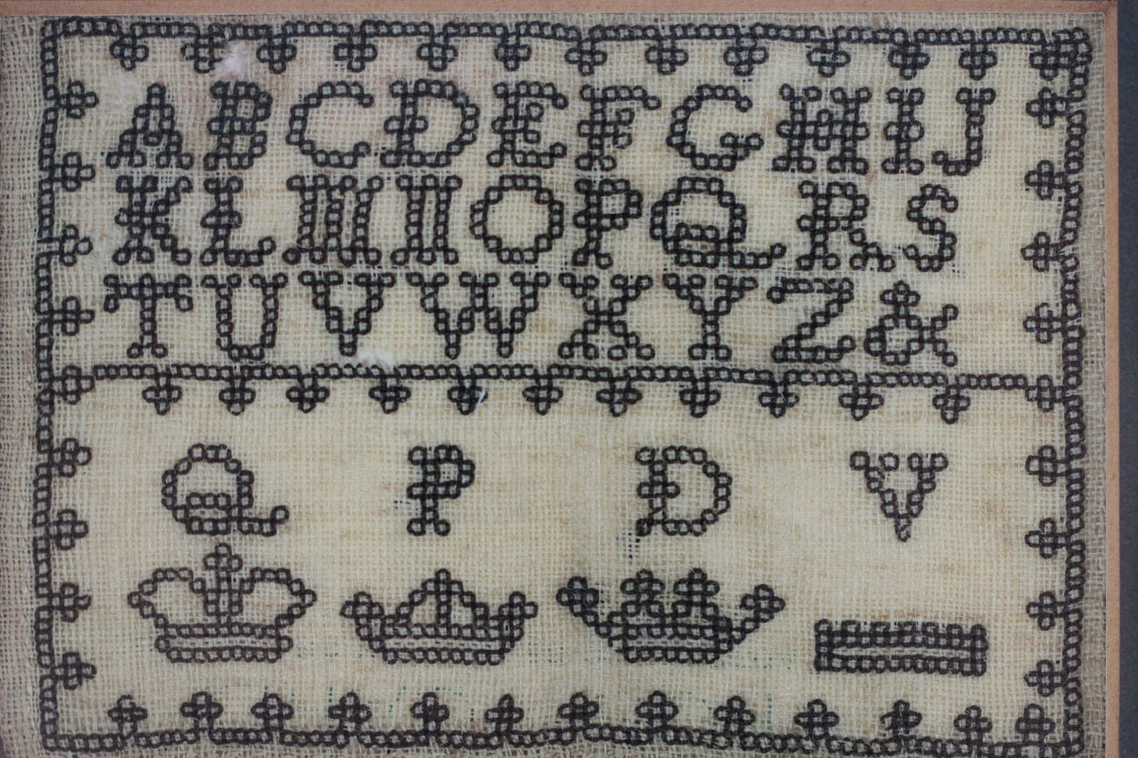 The sampler is worked in silk on linen ground. Black thread used throughout. Alphabet A-Z in upper case. Four crown motifs with letters above.