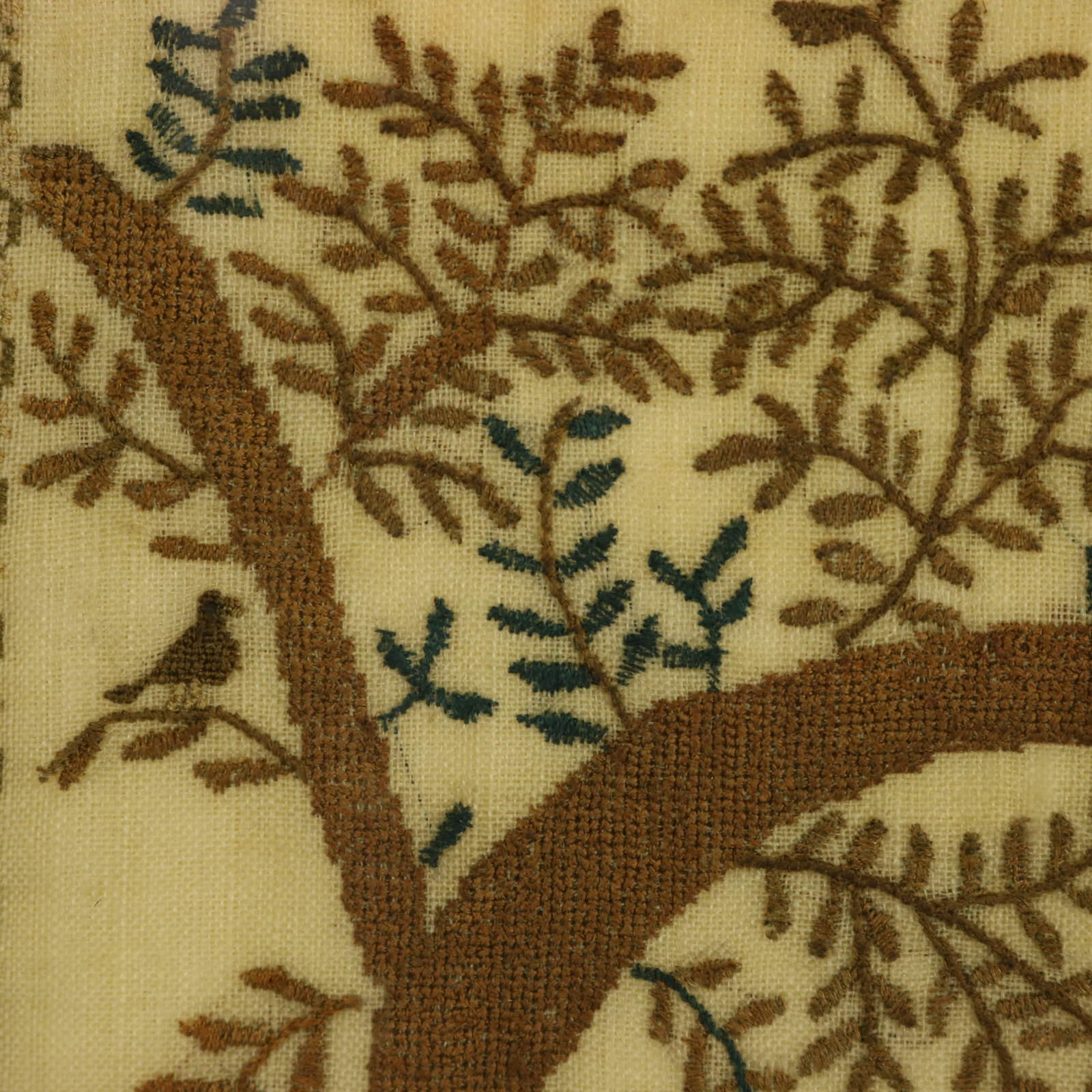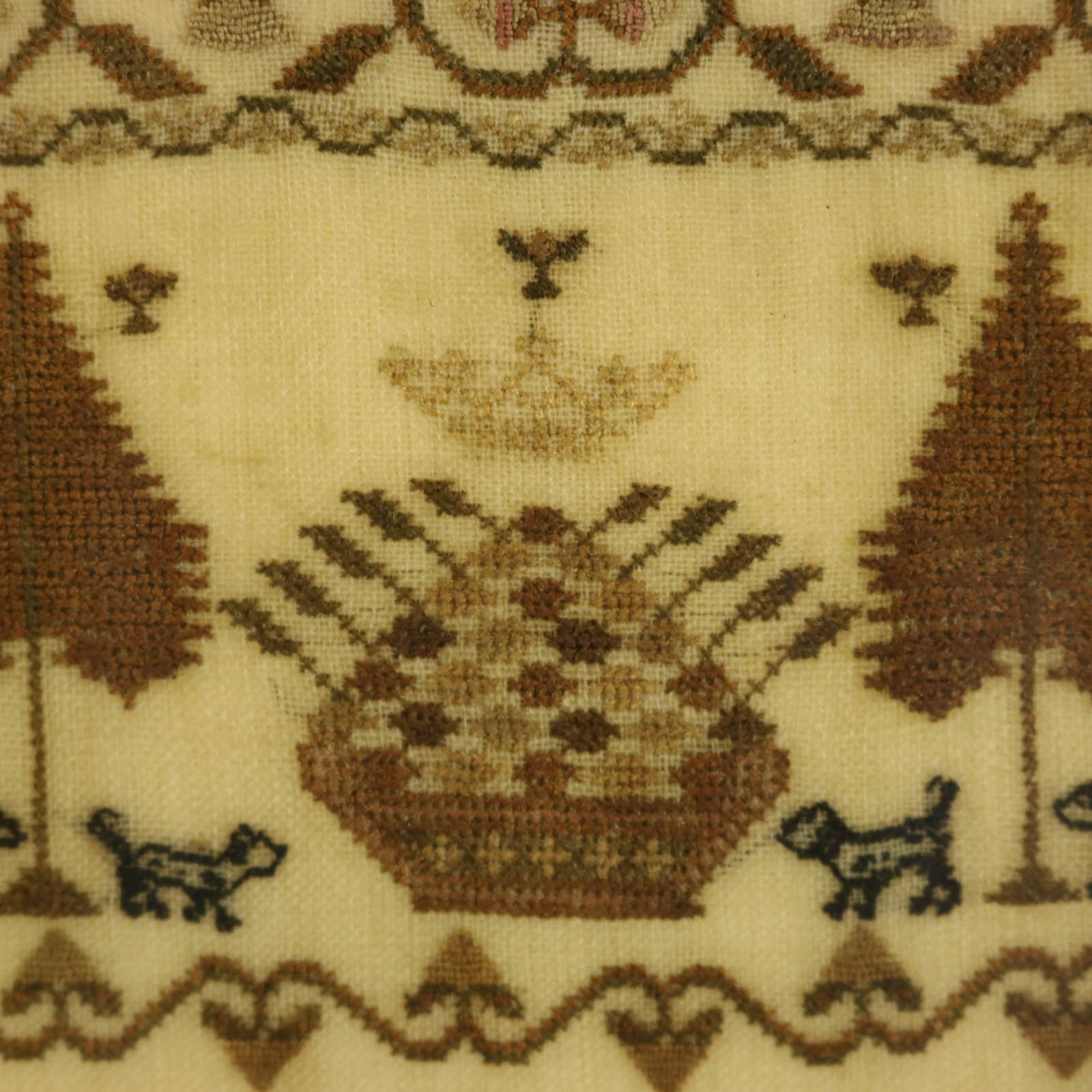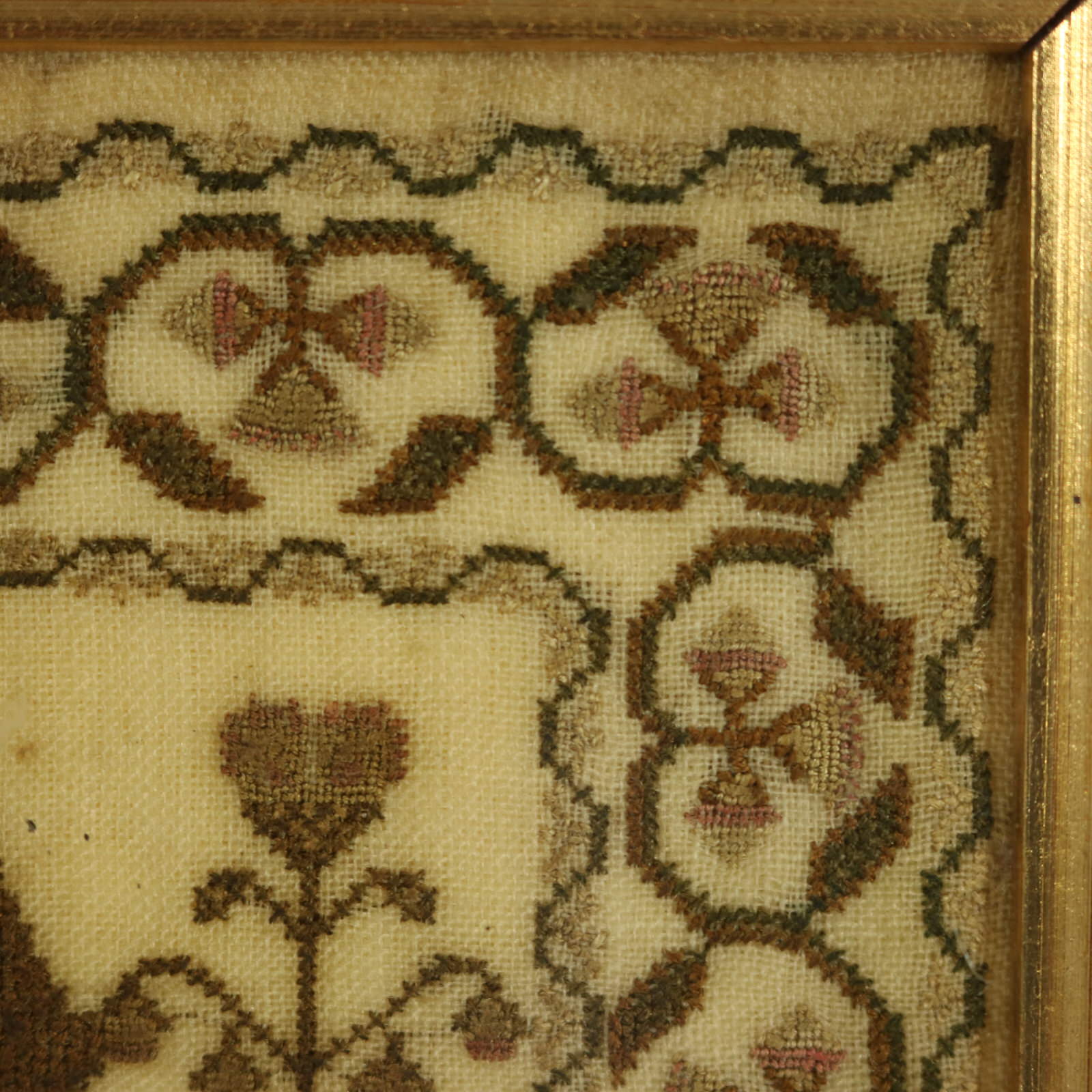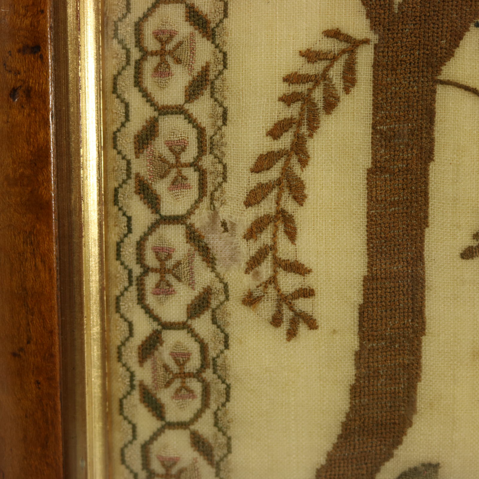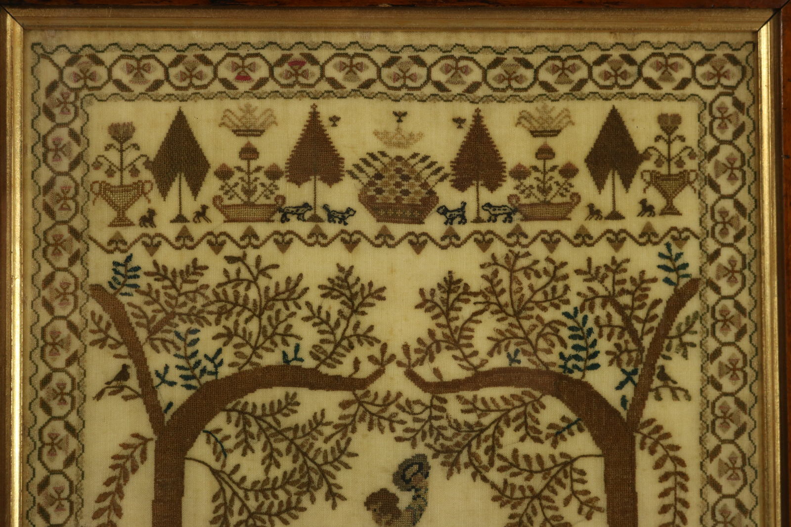 The sampler is finely worked in silk on a linen ground. Meandering strawberry border.