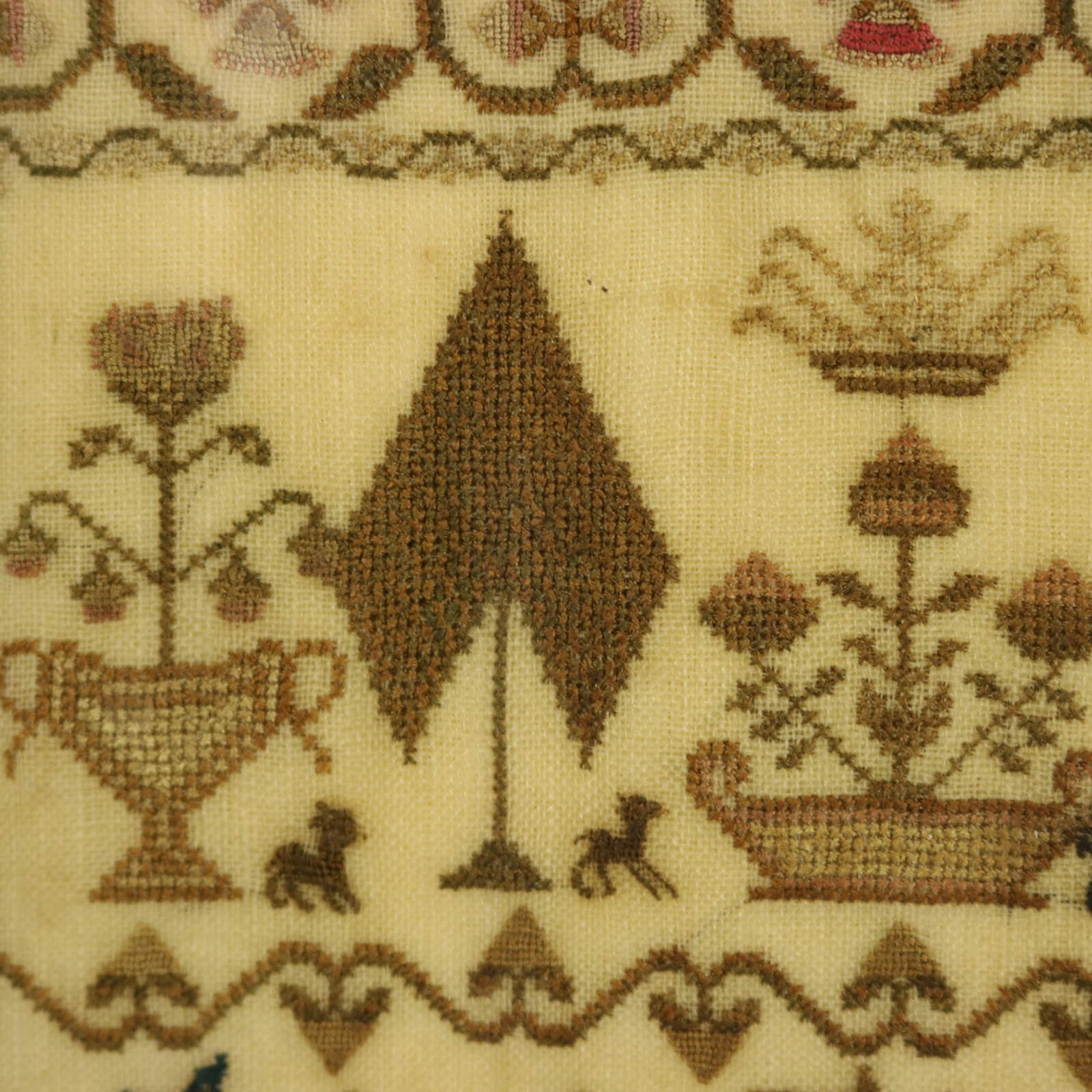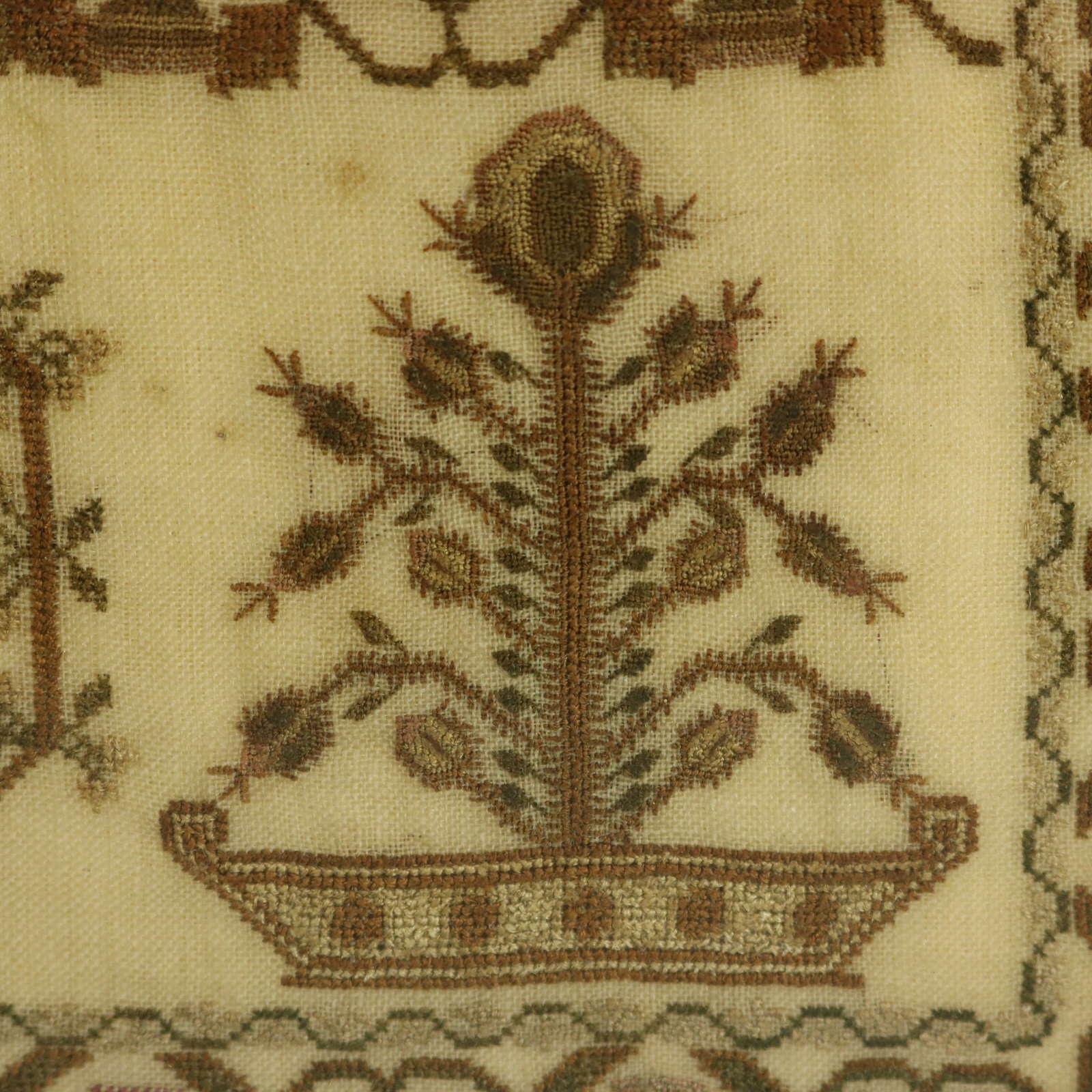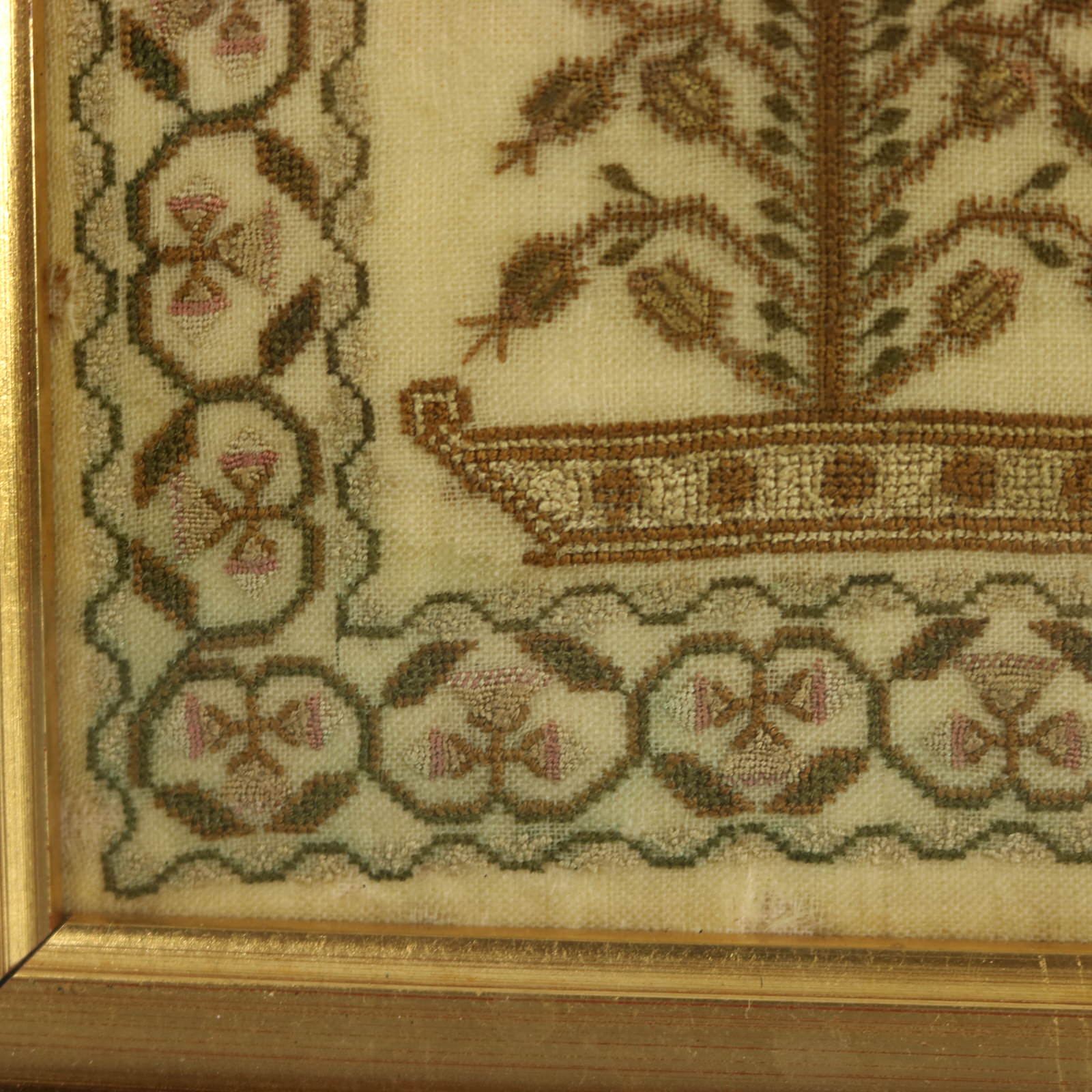 Mounting: The sampler is stitched to a wood stretcher frame. Frame backed with brown paper and sealed with tape.