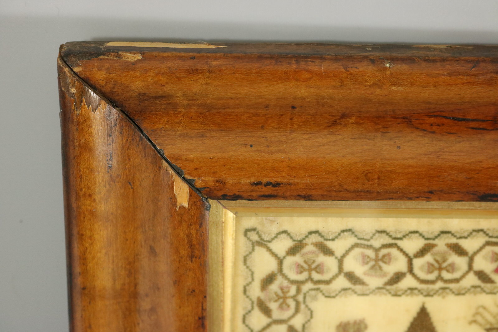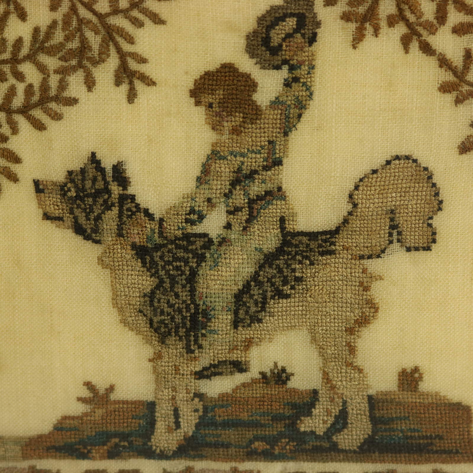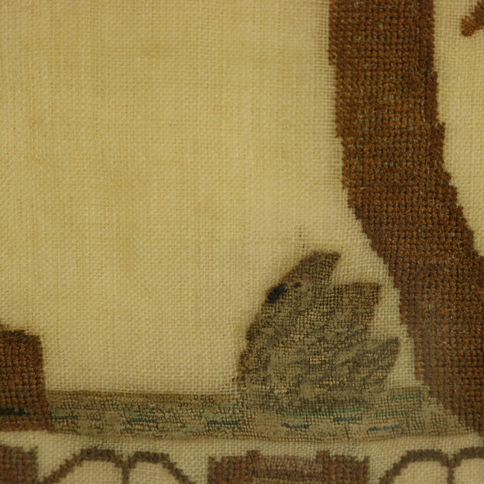 Mounting: The sampler is stitched to a wood stretcher frame. Frame backed with brown paper and sealed with tape.