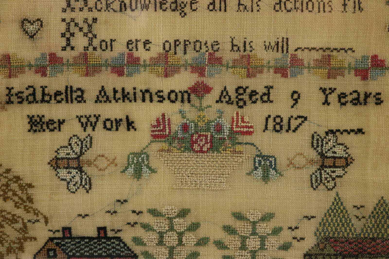 Colours black, red, yellow, copper, white, pink, blue and green. Verse reads, 'My soul before thy MAKER bow > His wondrous works admire > Till revrence and religious awe > Thine inmost thoughts inspire > Without reserve to him submit > All his commands fulfil > Acknowledge all his actions fit > Nor ere oppose his will'. Signed and dated 'Isabella Atkinson Aged 9 Years Her Work 1817'.