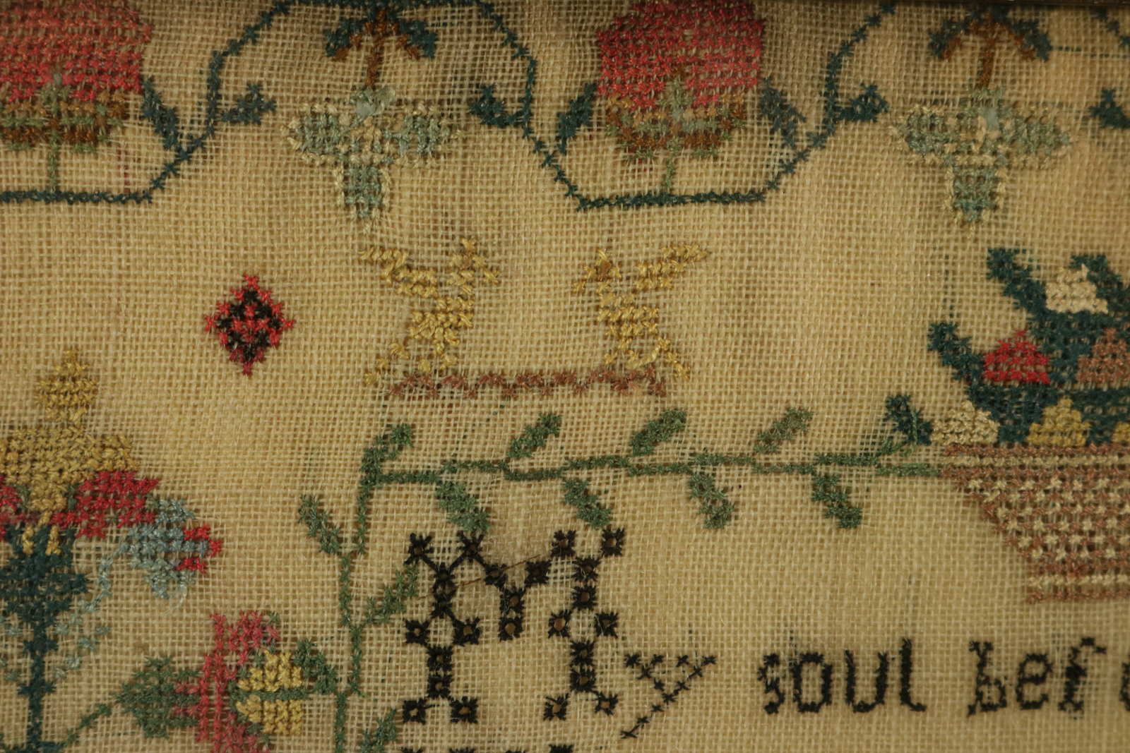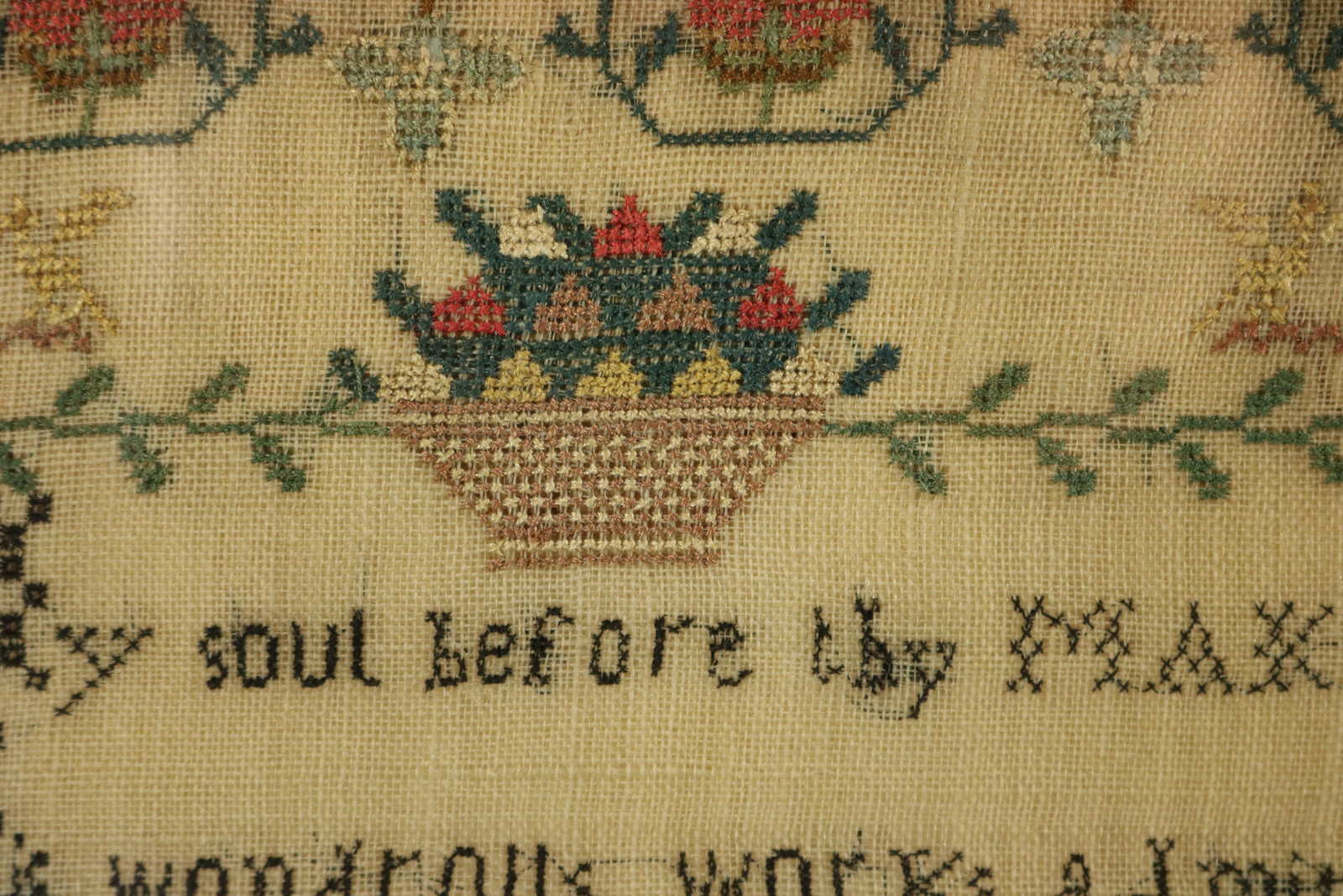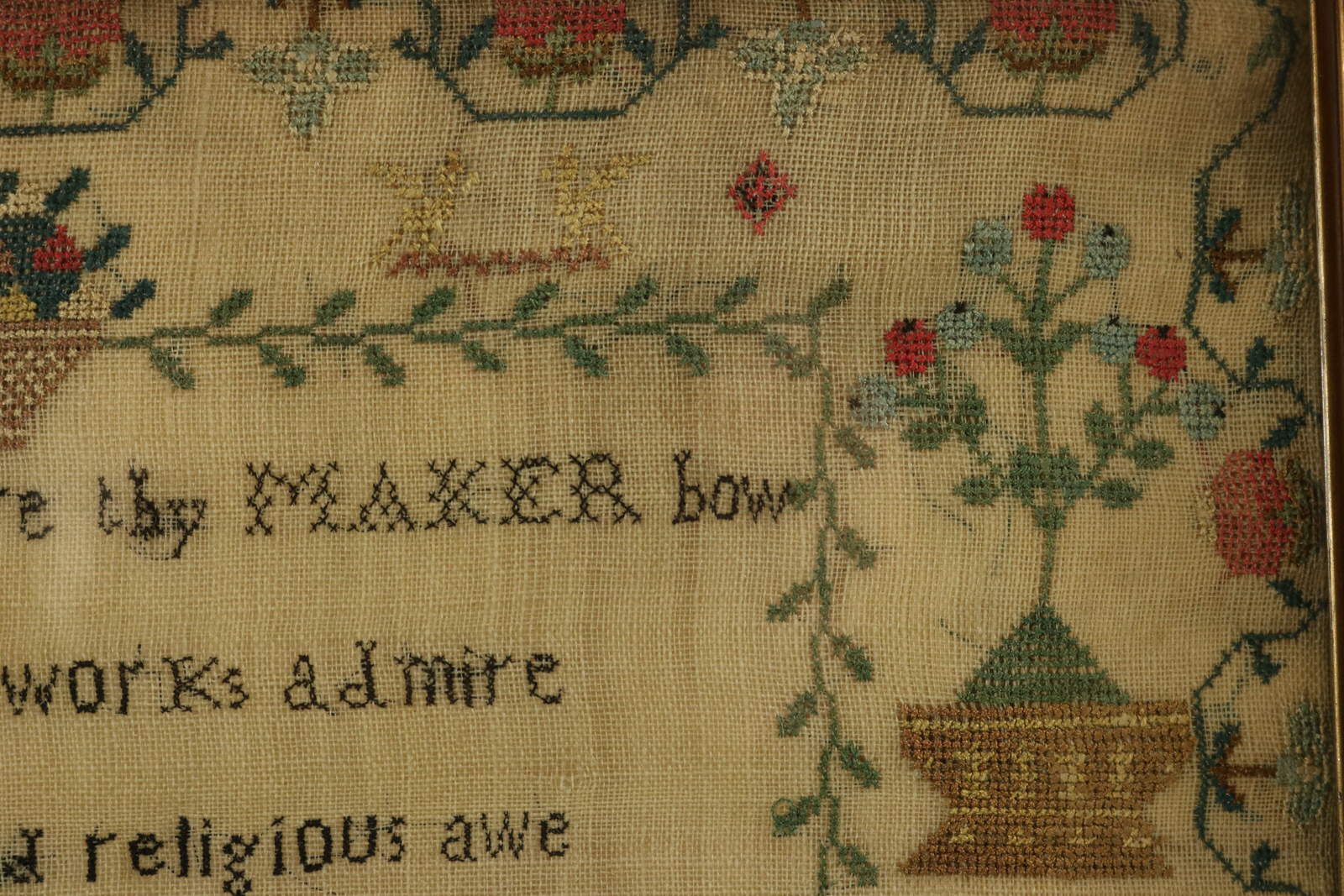 The sampler is worked in silk on linen ground, mainly in cross stitch.